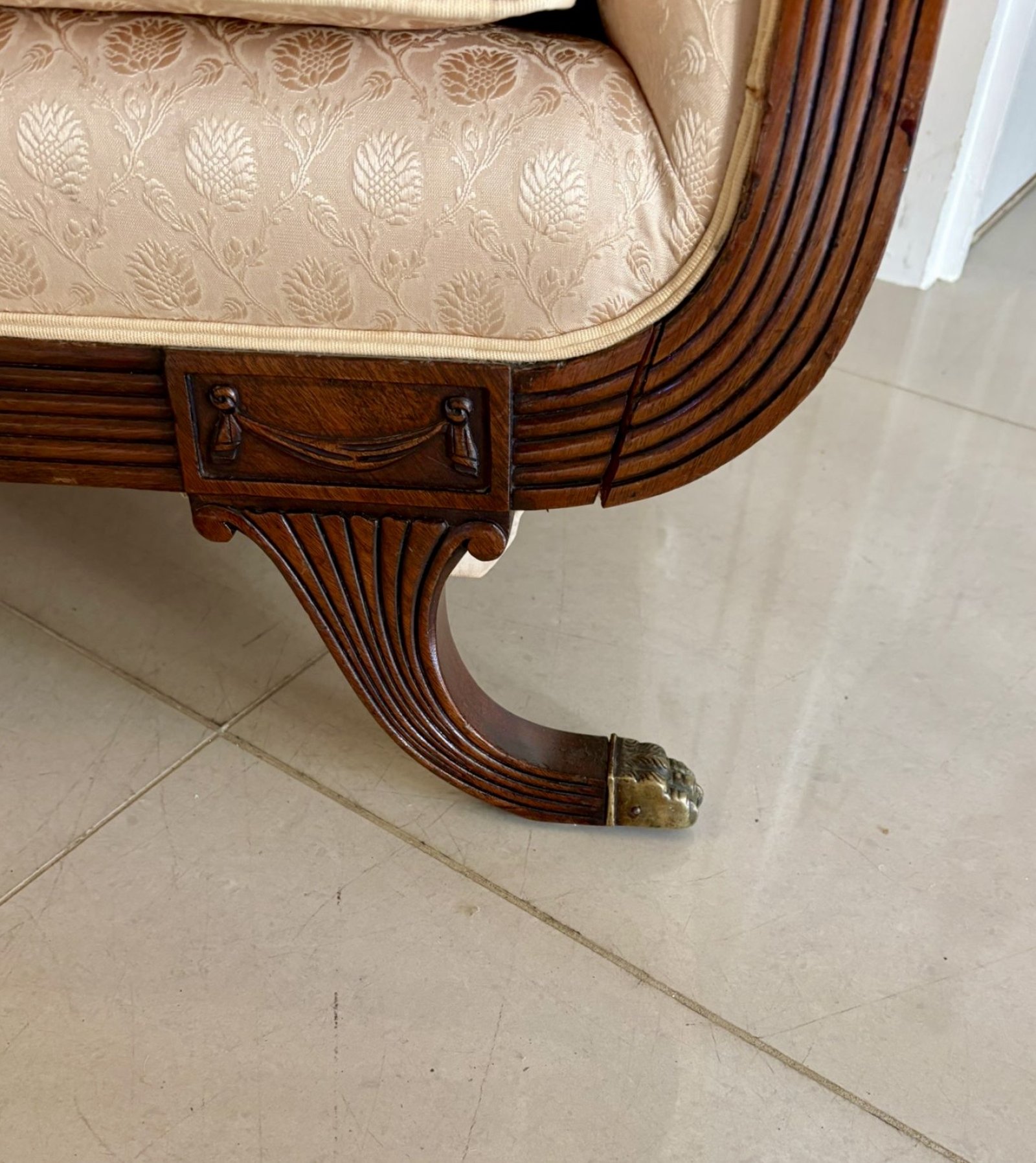 The scrolled arms flow into a reeded mahogany frame continuing down to boldly reeded sabre legs terminating in brass paw feet and castors. Generous proportions and refined craftsmanship give this piece real presence while the pale damask upholstery complements the warmth of the timber and the period aesthetic.