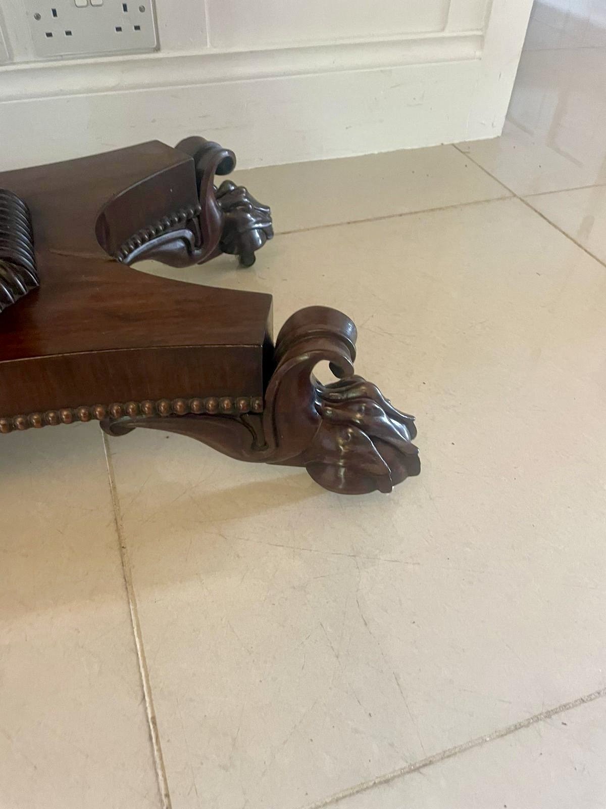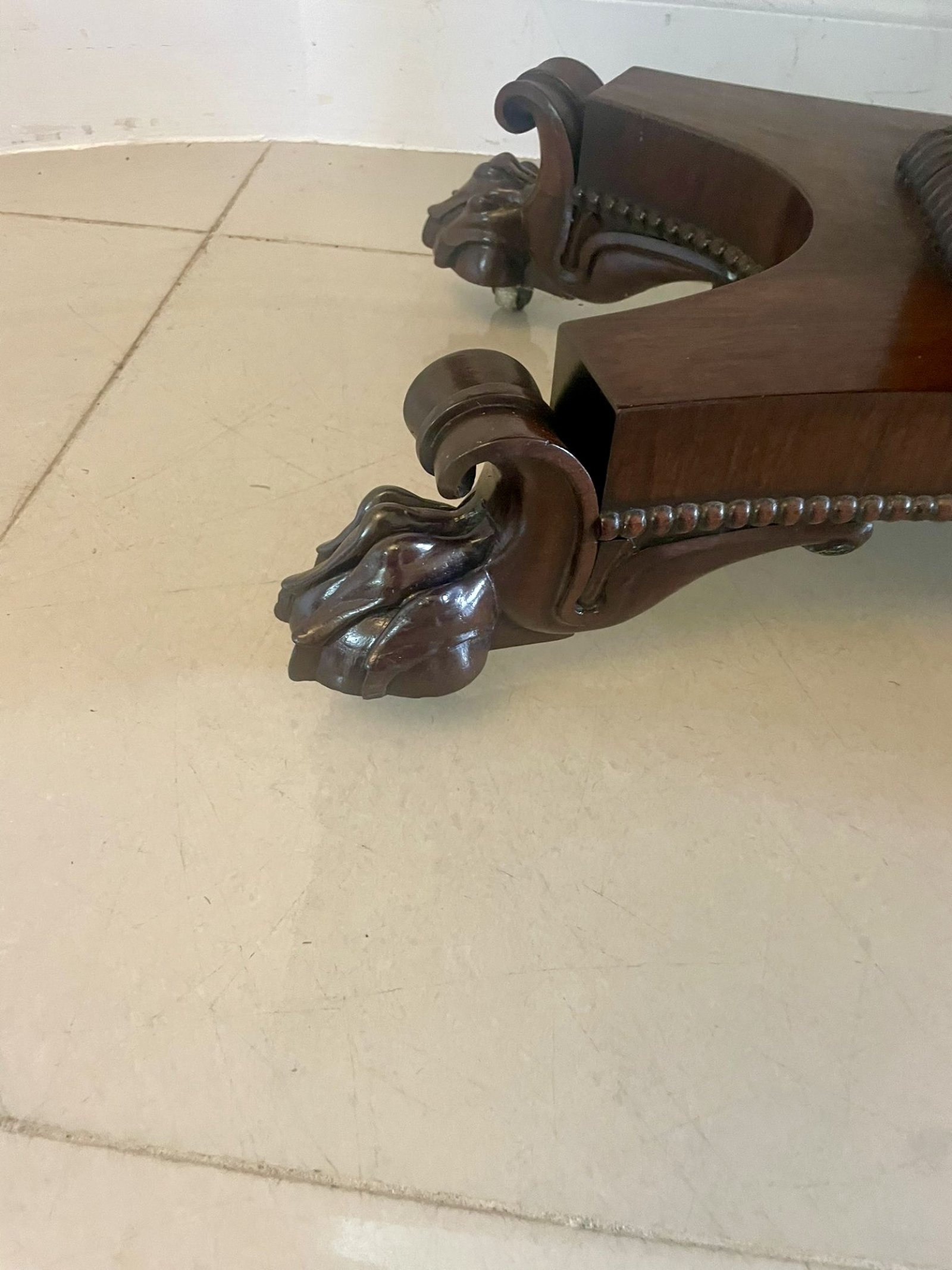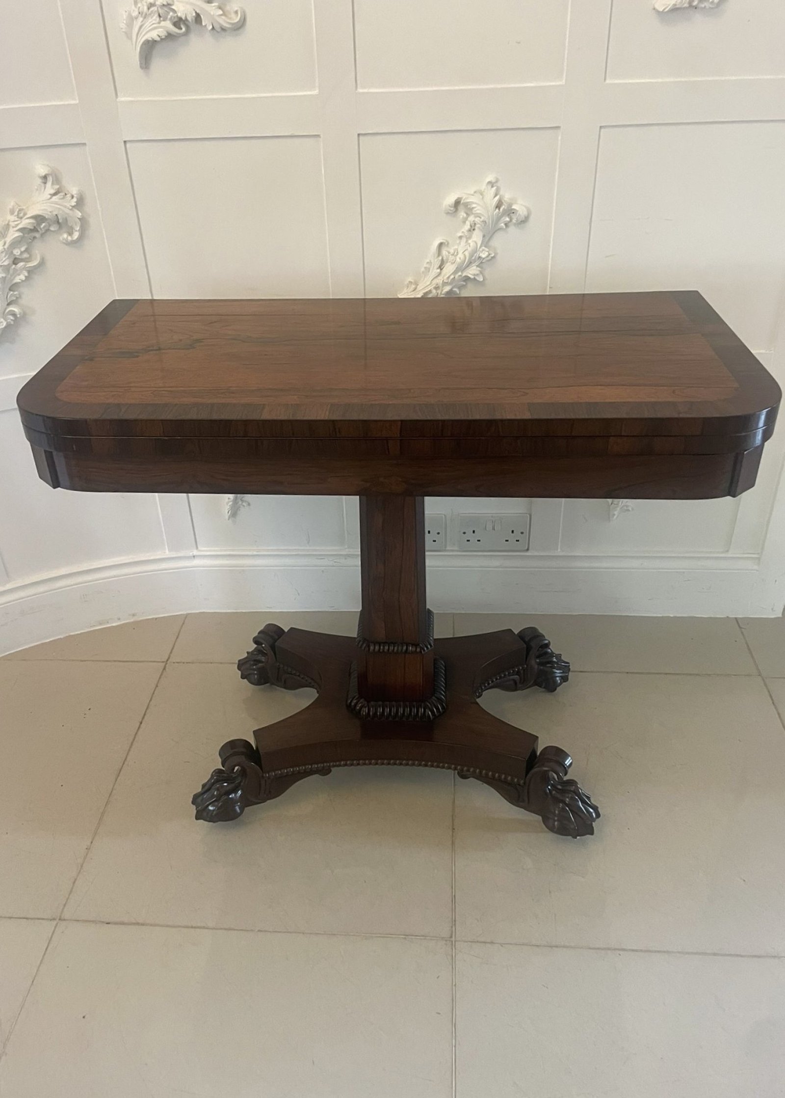 Quality antique William IV rosewood card/side table having a splendid figured rosewood crossbanded top which lifts up and swivels to reveal the original green baize interior, rosewood frieze supported by an elegant shaped pedestal supported on a quatrefoil base with fantastic solid rosewood carved feet and original castors.