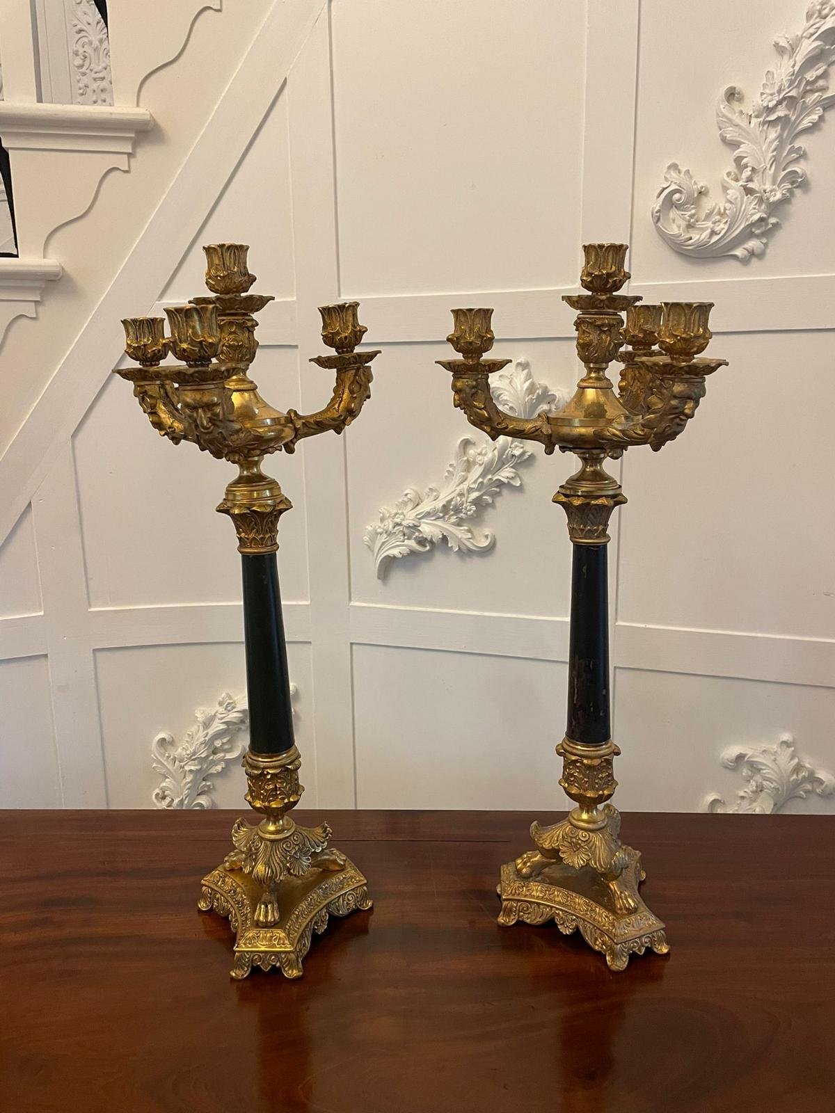 Quality Pair of antique Regency ornate ormolu four arm candelabra having four ornate ormolu arms supported by a column with ornate ormolu claw feet standing on an ornate ormolu platform base