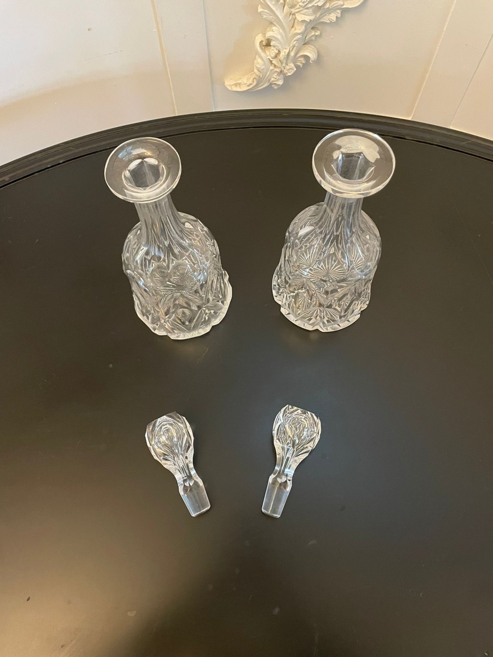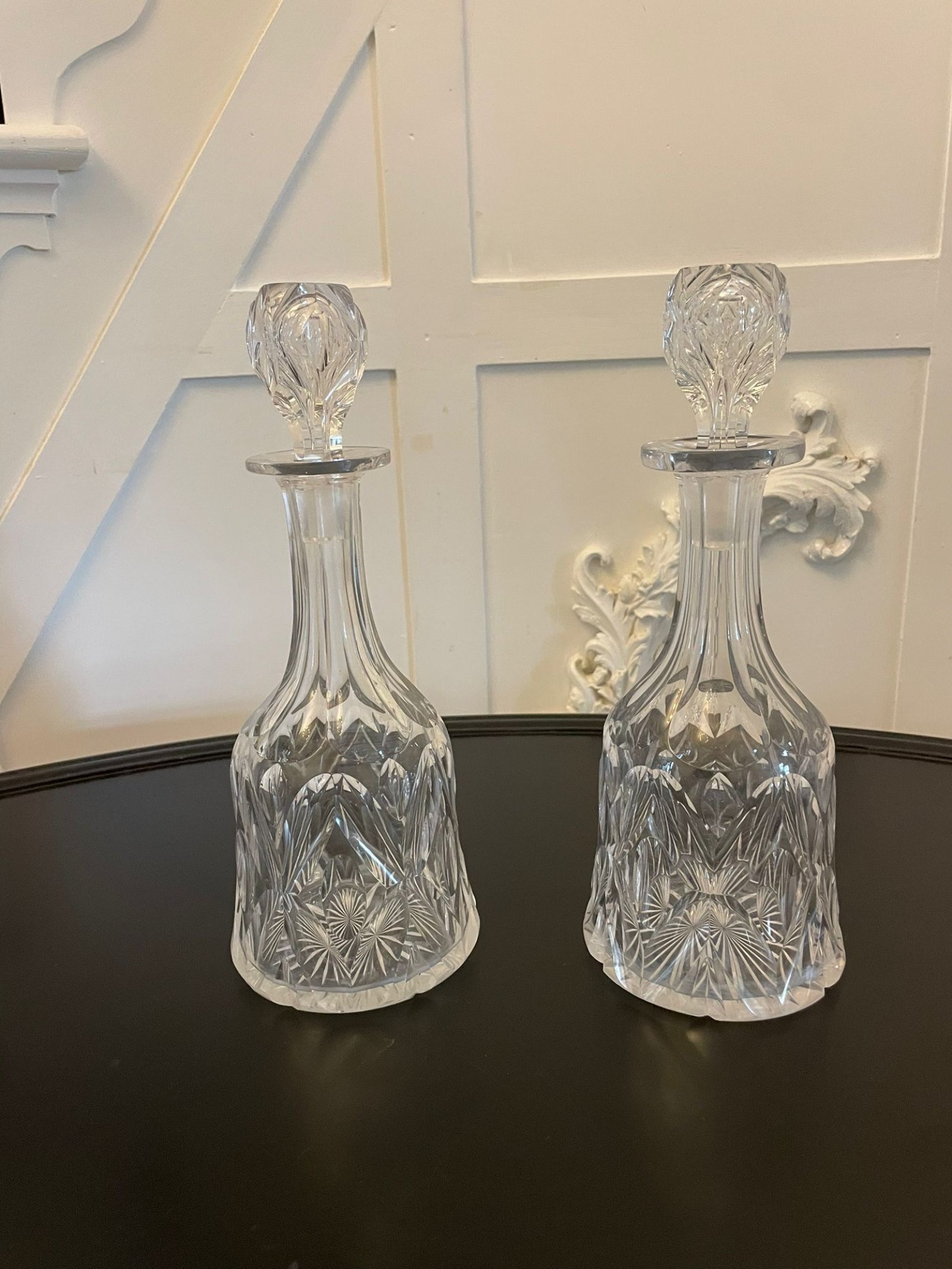 Quality pair of antique Victorian cut glass decanters having the original pair of stoppers above a quality cut glass bell shaped decanters