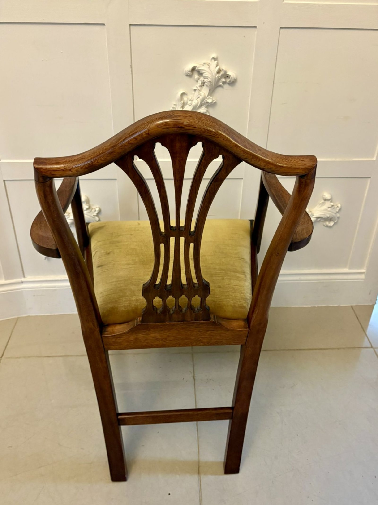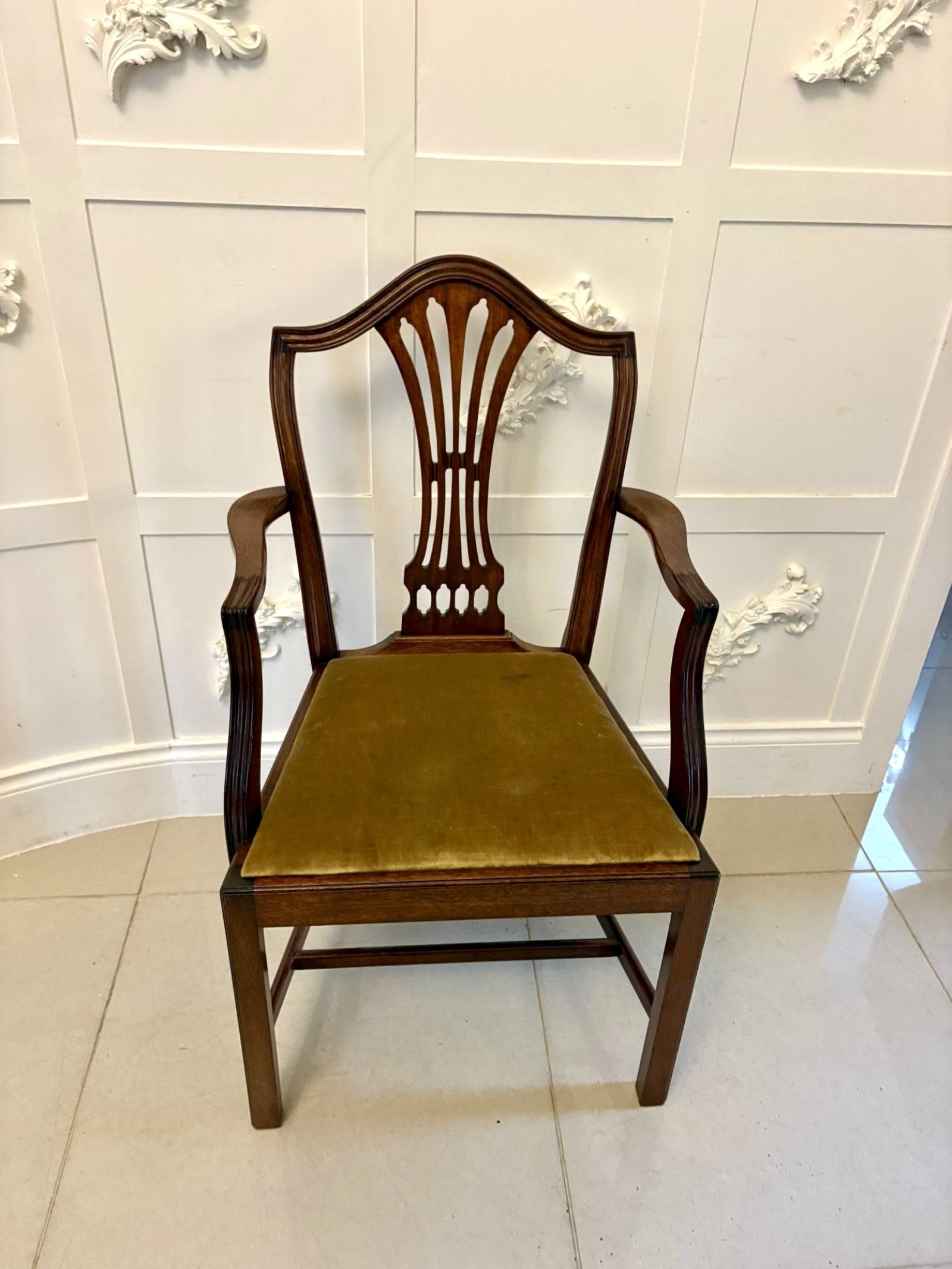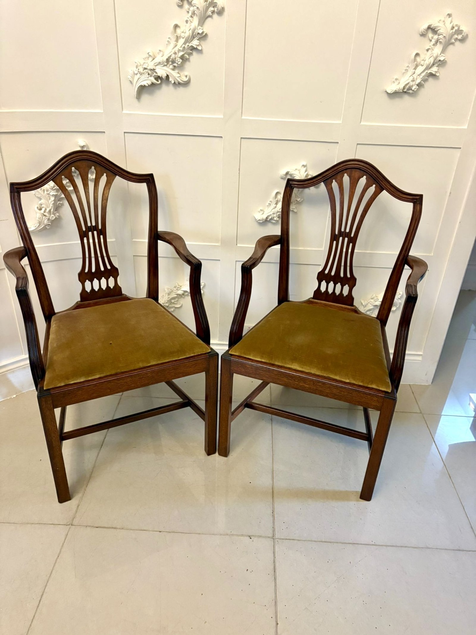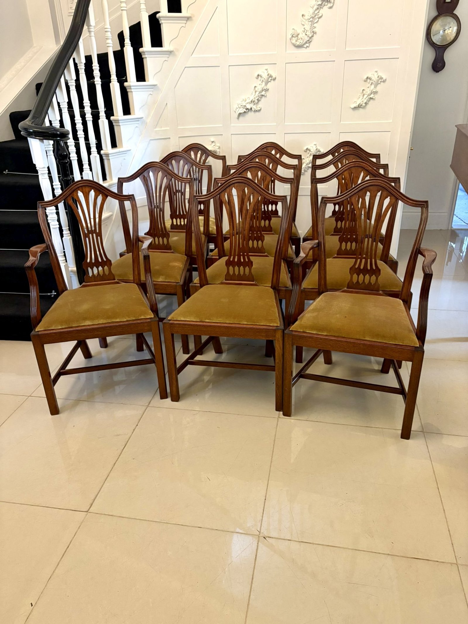 A fine antique set of twelve Hepplewhite-style dining chairs including two carvers beautifully crafted in solid mahogany and displaying the elegant shield-back profile typical of the Hepplewhite tradition. The pierced splats, gently shaped arms on the carvers and well-proportioned frames create a refined and cohesive suite, ideal for both formal and contemporary interiors.