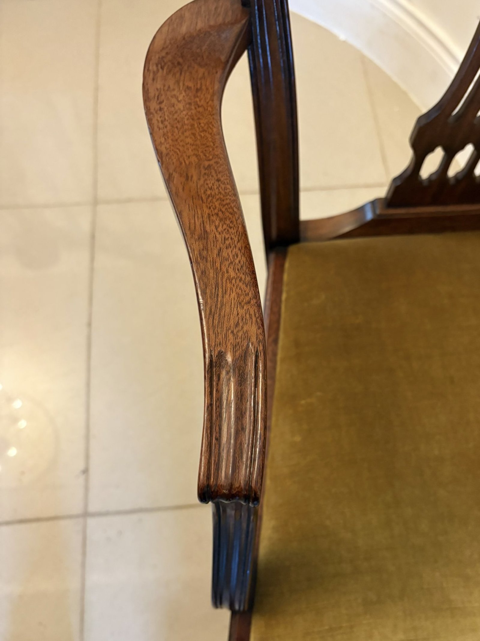 Each chair features a generous seat with upholstered drop-in pads offering comfortable support while maintaining a classic silhouette. The set stands on square chamfered mahogany legs united by stretchers giving excellent stability and durability.