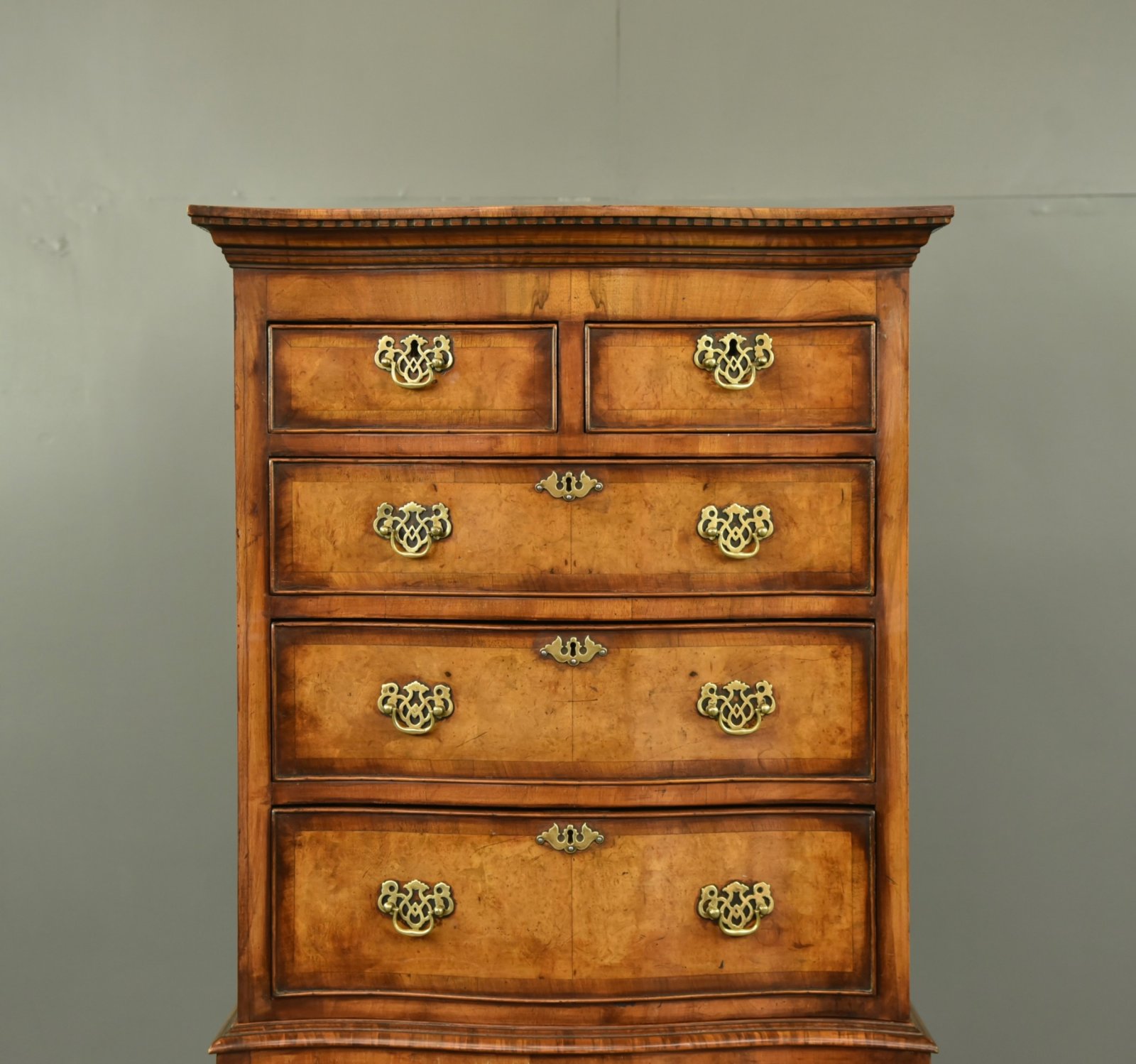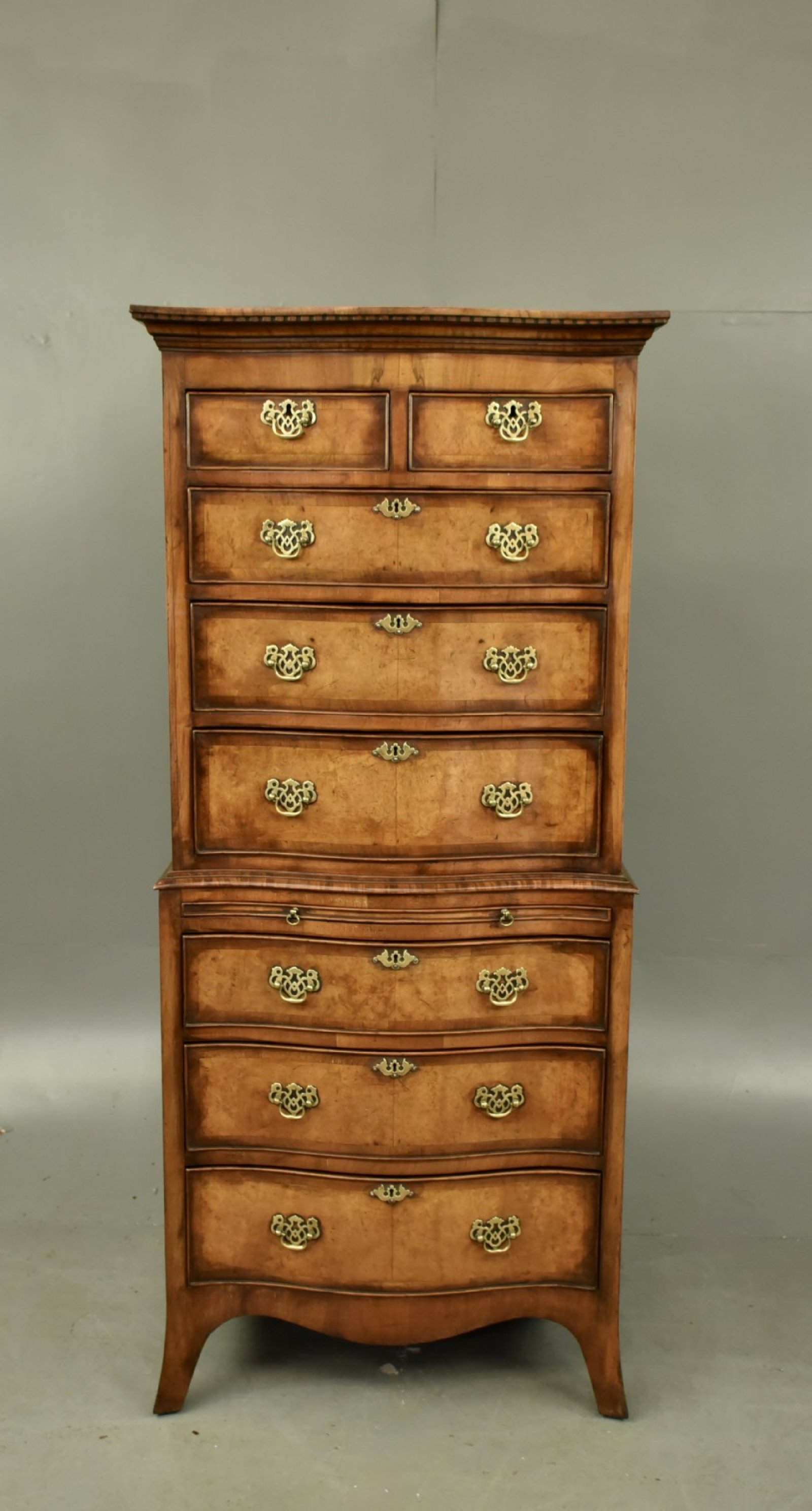 Fine quality burr walnut serpentine chest on chest in the Queen Anne style circa 1900