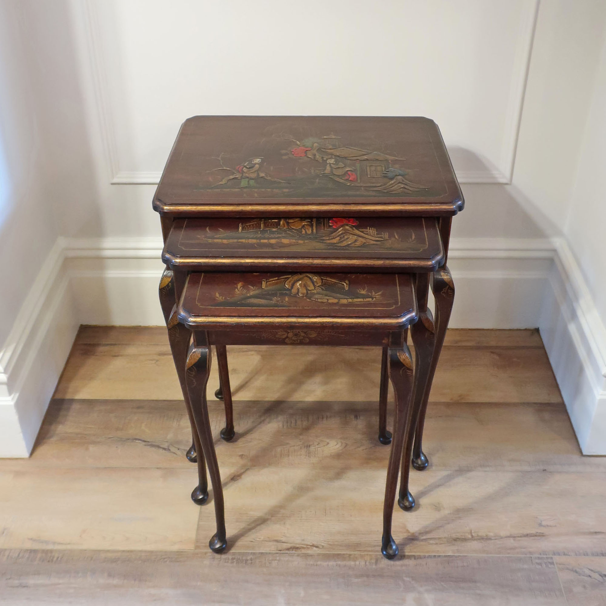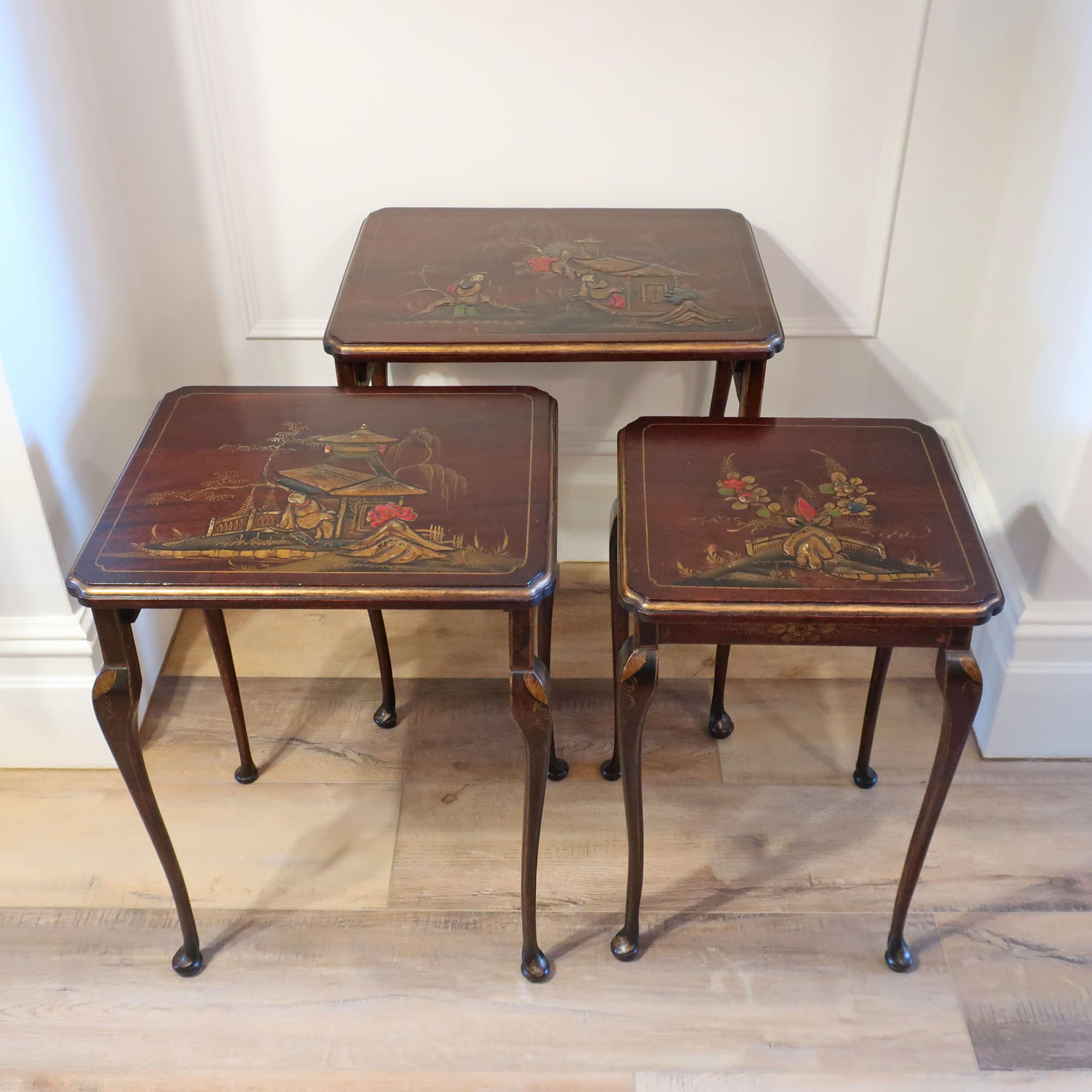 A lovely set of early 20th century mahogany antique nest of three tables decorated with traditional oriental chinoiserie design in relief in the Queen Anne style. The table have gilt borders and gilt floral decoration to the frieze and stand on slender shaped cabriole legs terminating to pad feet. The three tables fit compactly away when not needed.