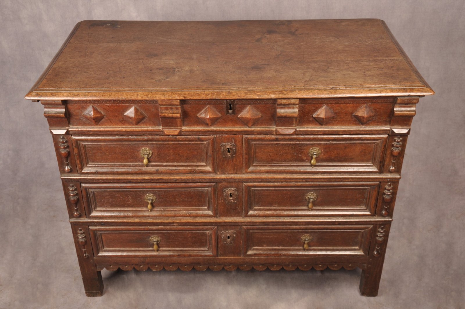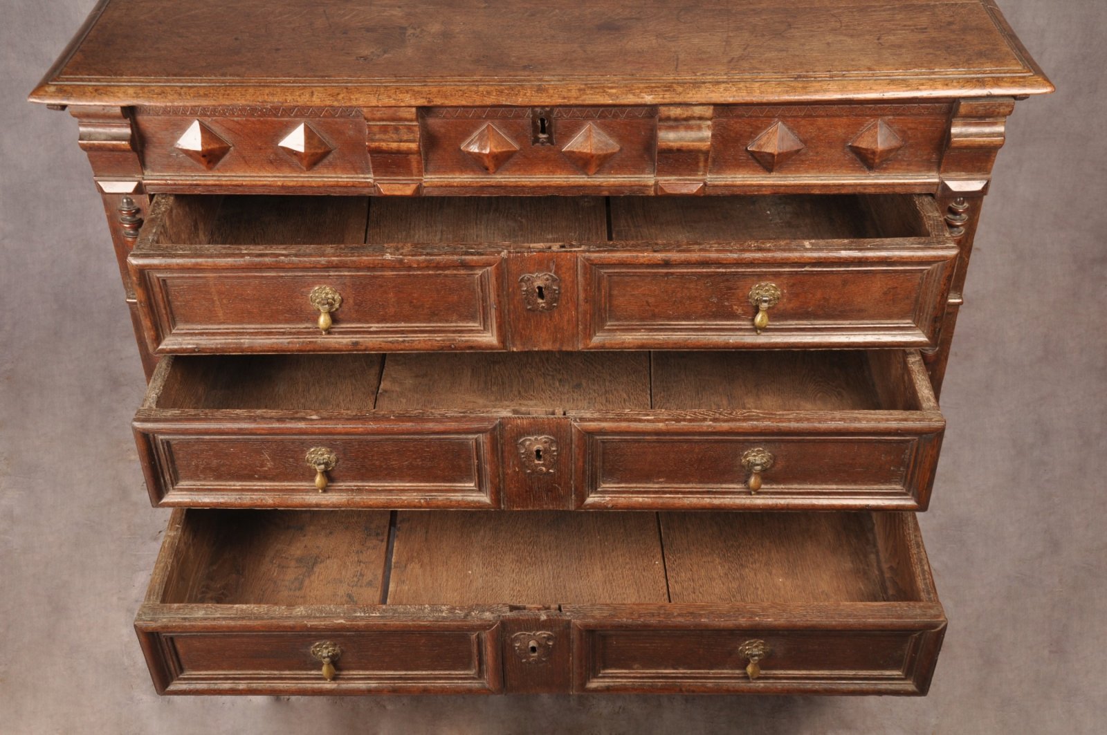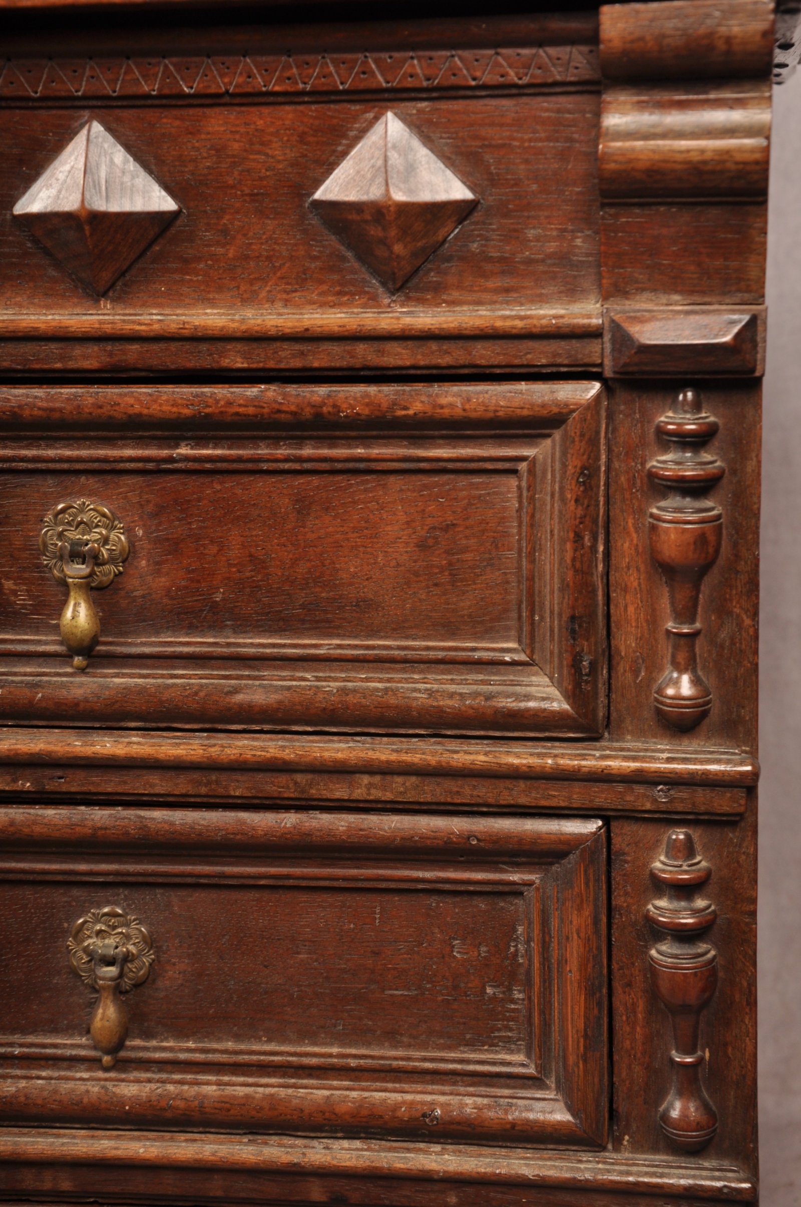 A rare and striking Charles II Oak Chest Of Drawers of wonderful dry untouched surface having superb light oak colour and patina. With the unusual feature of a lift up lid to the top retaining original strap hinges, opening to reveal a shallow compartment. The front decorated with Shaped brackets, applied mouldings, fruitwood split turnings and jewels. The drawer linings are fabulous clean original examples, made in Oak. Small amount added later to two of the feet. The handles replaced in keeping with the period are through the same holes as the originals, the escutcheons are original. The original early locks are extraordinary in the fact that they have an open section to the top rather than the usual metal plate hiding the works.