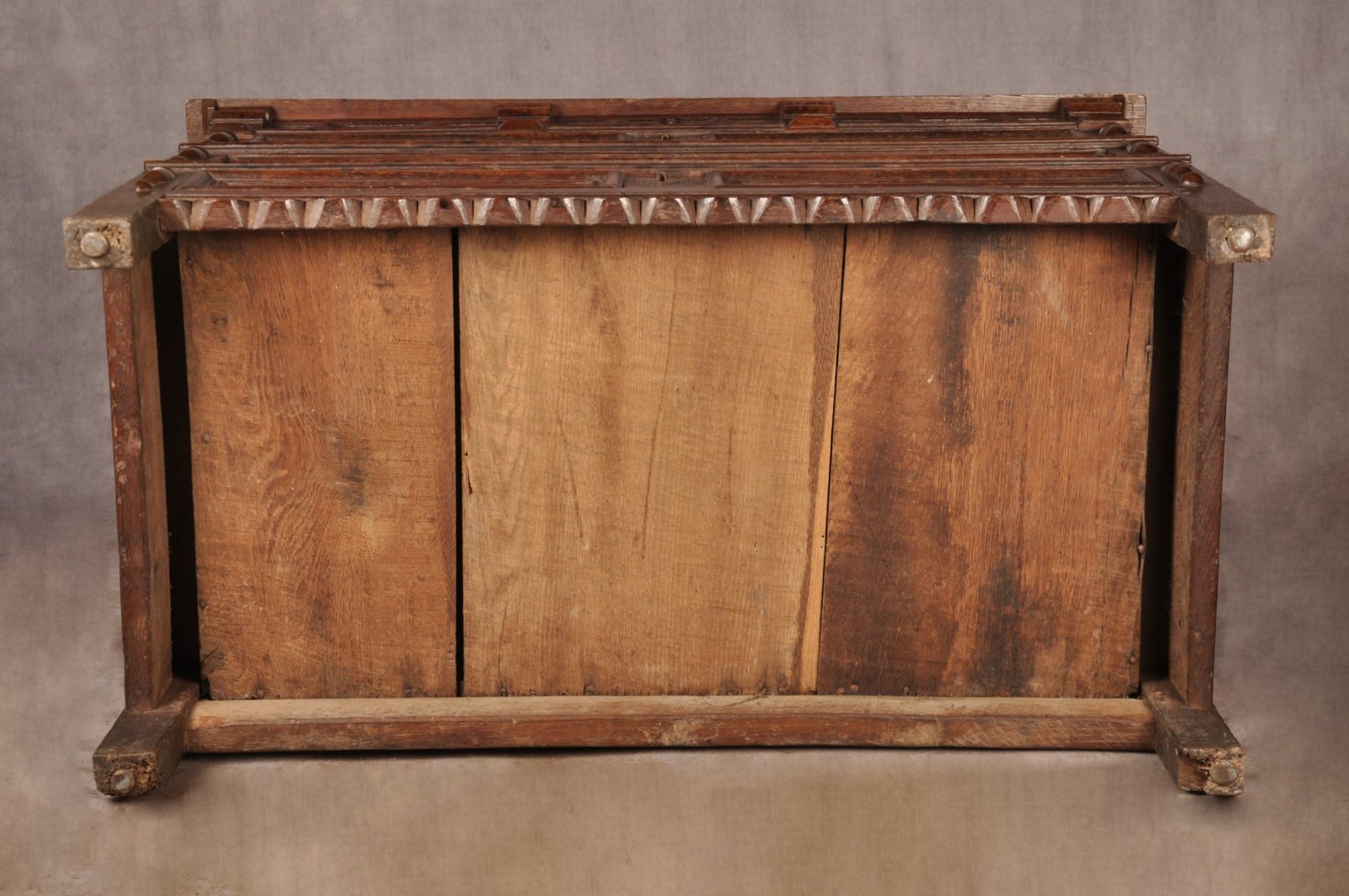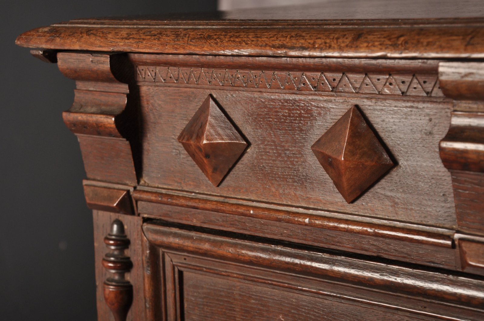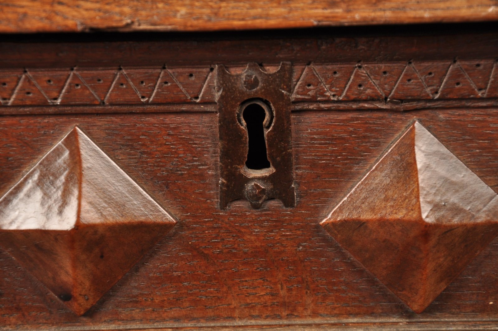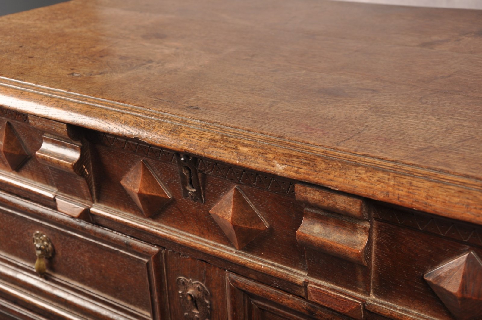 A rare and striking Charles II Oak Chest Of Drawers of wonderful dry untouched surface having superb light oak colour and patina. With the unusual feature of a lift up lid to the top retaining original strap hinges, opening to reveal a shallow compartment. The front decorated with Shaped brackets, applied mouldings, fruitwood split turnings and jewels. The drawer linings are fabulous clean original examples, made in Oak. Small amount added later to two of the feet. The handles replaced in keeping with the period are through the same holes as the originals, the escutcheons are original. The original early locks are extraordinary in the fact that they have an open section to the top rather than the usual metal plate hiding the works.