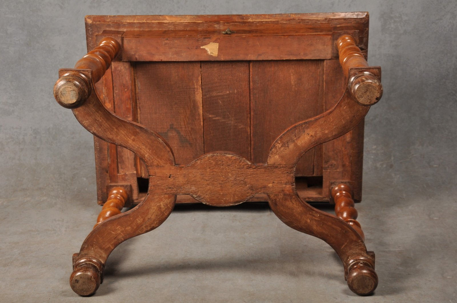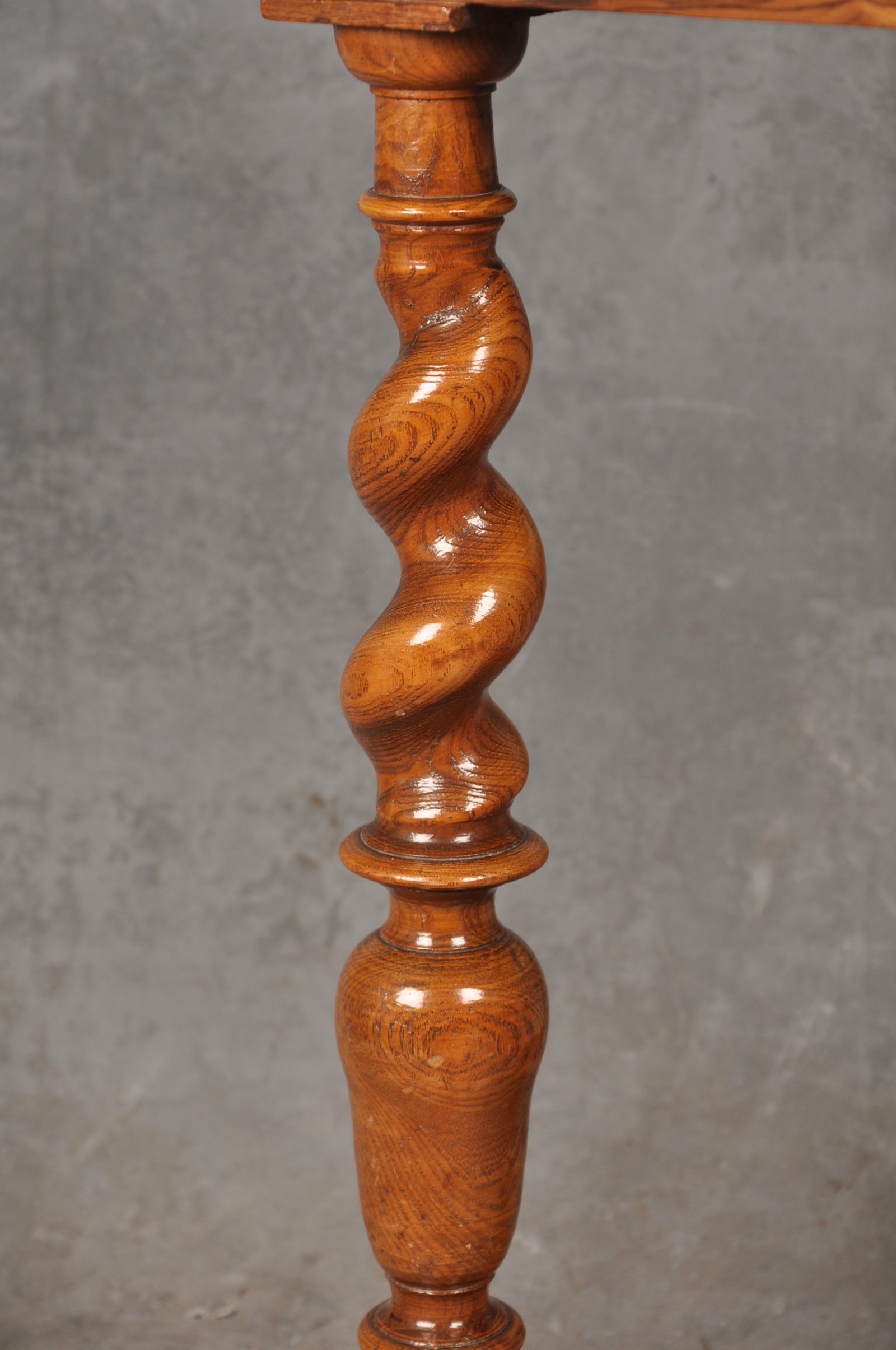 The top is lavishly decorated with oyster veneer and geometric boxwood stringing. The fabulous original twist legs are made in Ash as is very often the case at this period, the bun feet are later replacements. The clean original drawer linings are made in Oak, the ground wood for the veneer is pine. The table tips up to reveal the kind of clean dry golden untouched surface that we love to see.