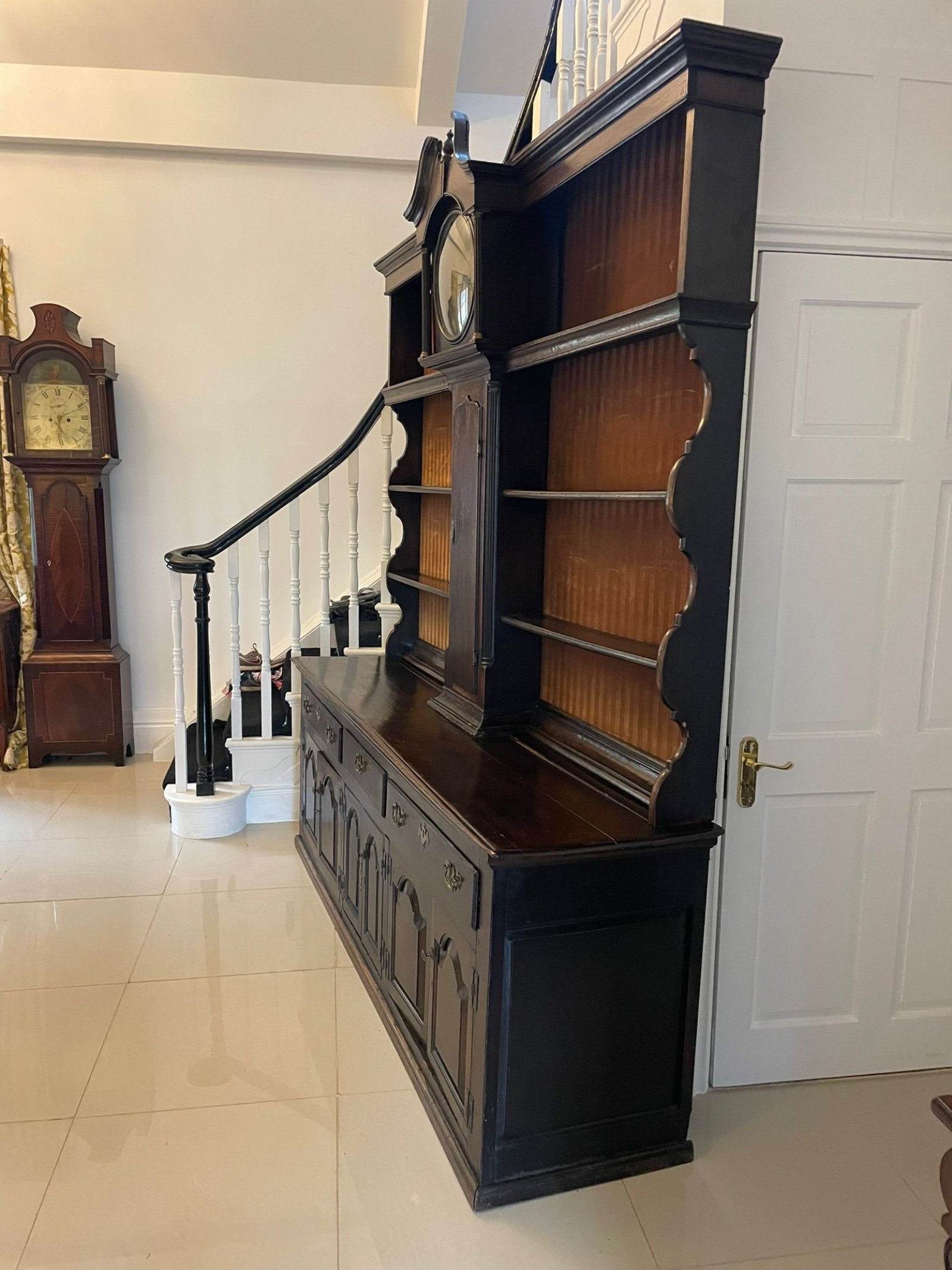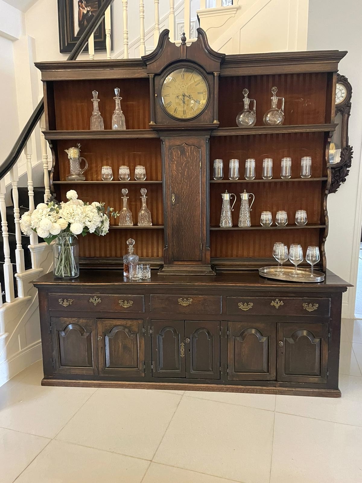 Rare 18th Century Large Antique George III Quality Oak Dresser with Rack and Longcase Clock