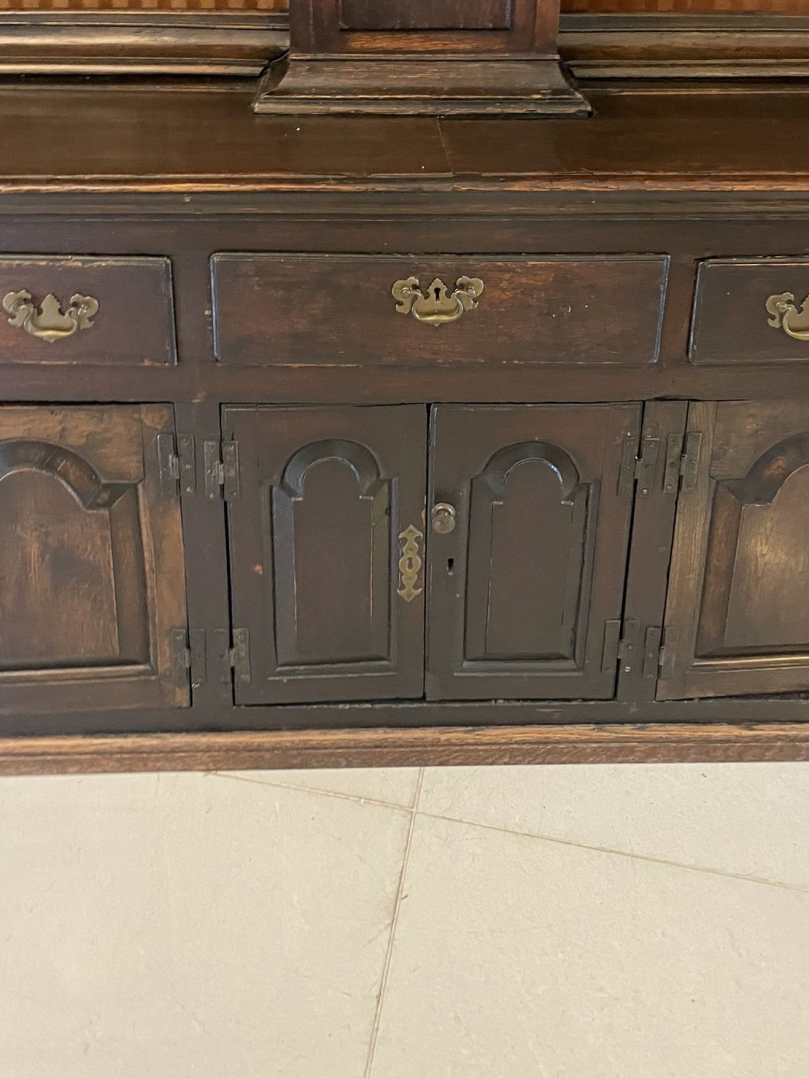 Rare 18th century large antique George III quality oak dresser with rack and longcase clock having a moulded cornice to the top, rare eight day brass face oak longcase clock to the centre having original weights, pendulum and winding key flanked by six shelves. The base having a quality oak rectangular shaped top above three drawers with brass handles, six oak panelled doors opening to reveal a shelf and storage compartments, panelled sides and standing on a plinth base