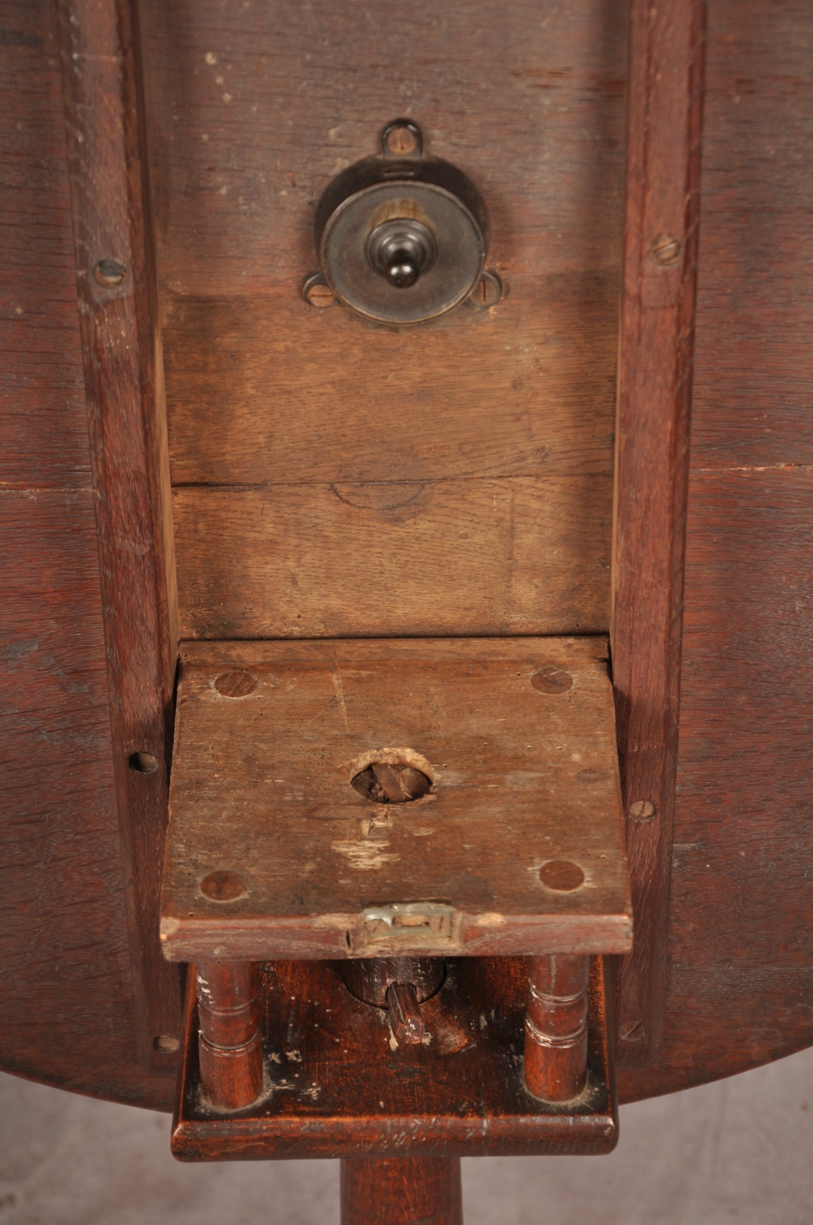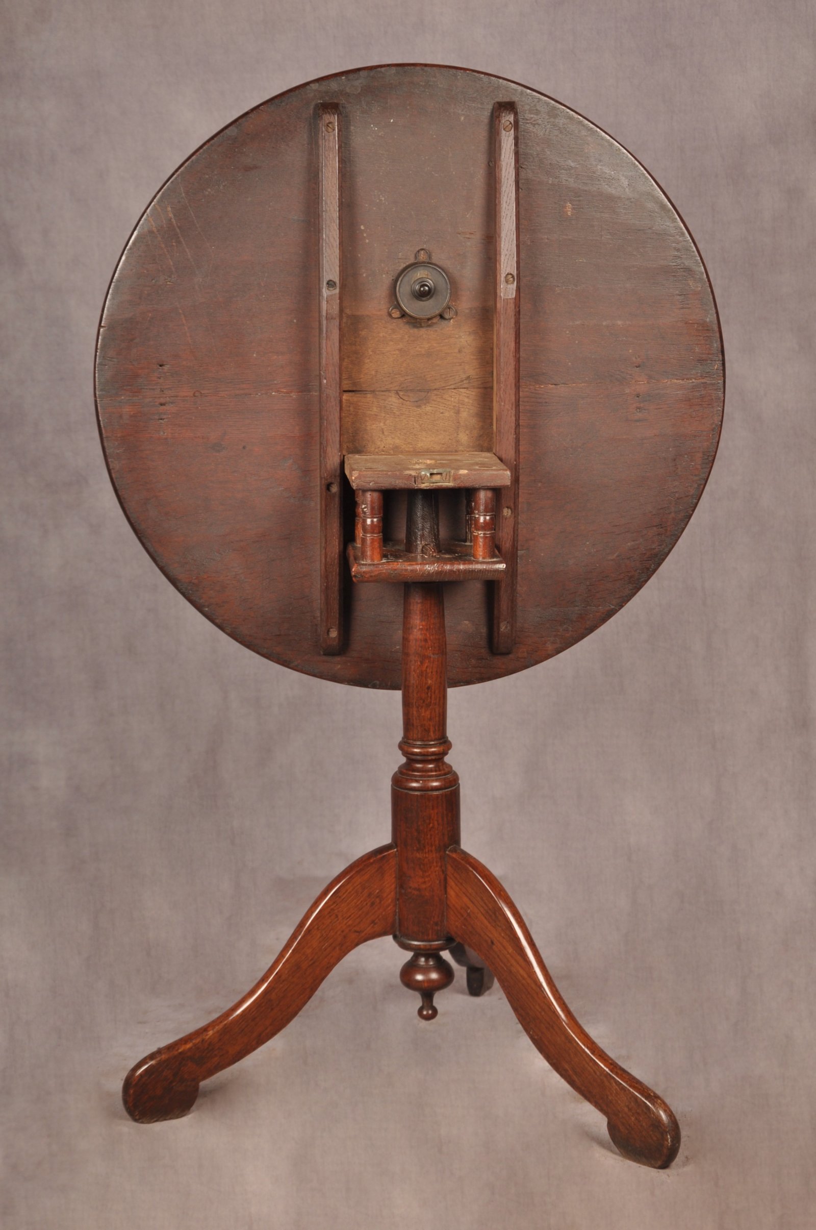 A rare 18th Century Country Oak Tripod Table with bird cage action of pleasing proportions having a good thick top and of very good colour. With barrel stem, unusual shaped legs and to the base is a nicely turned dropper. A well drawn and interesting piece of English Country Furniture.