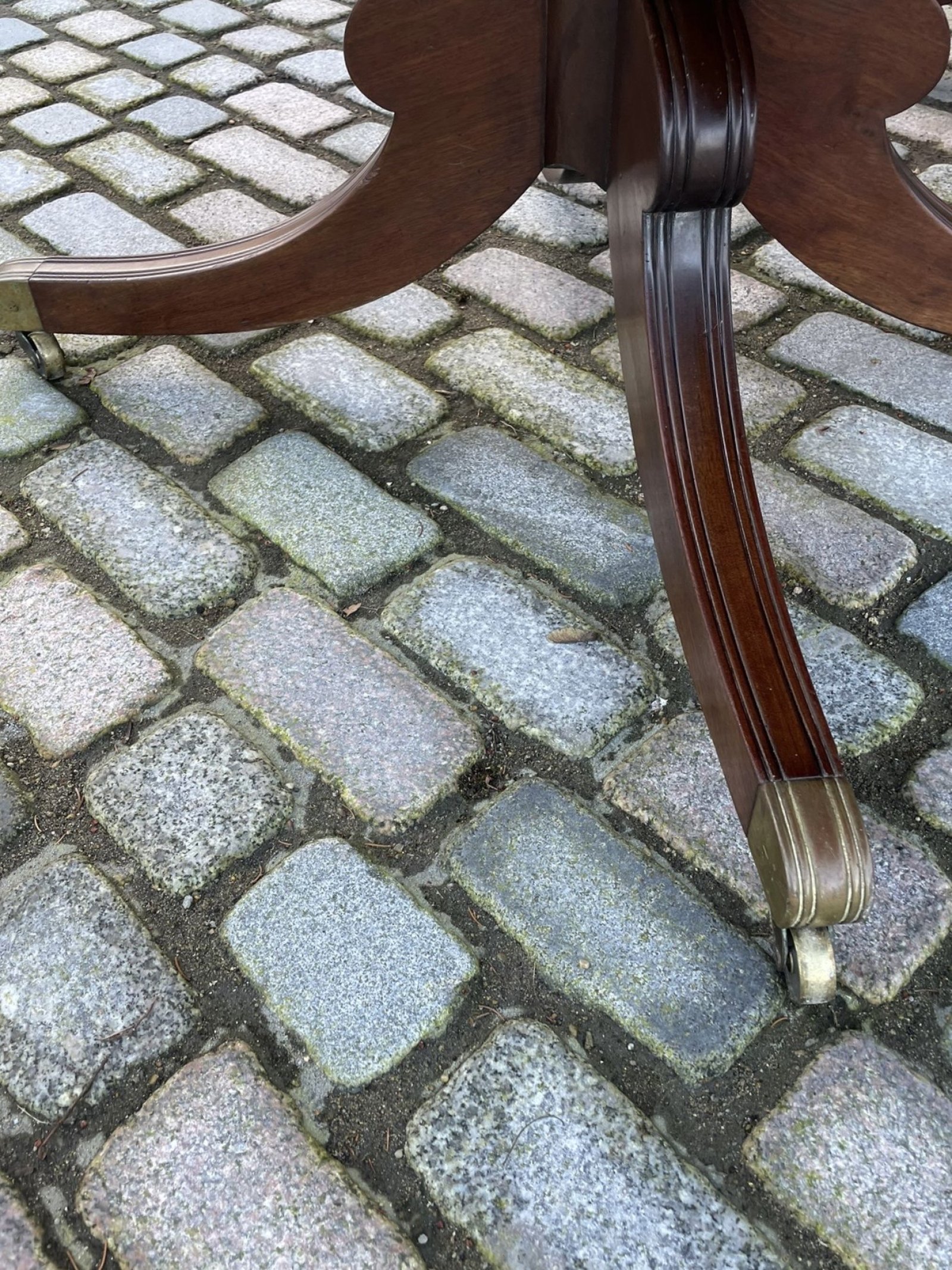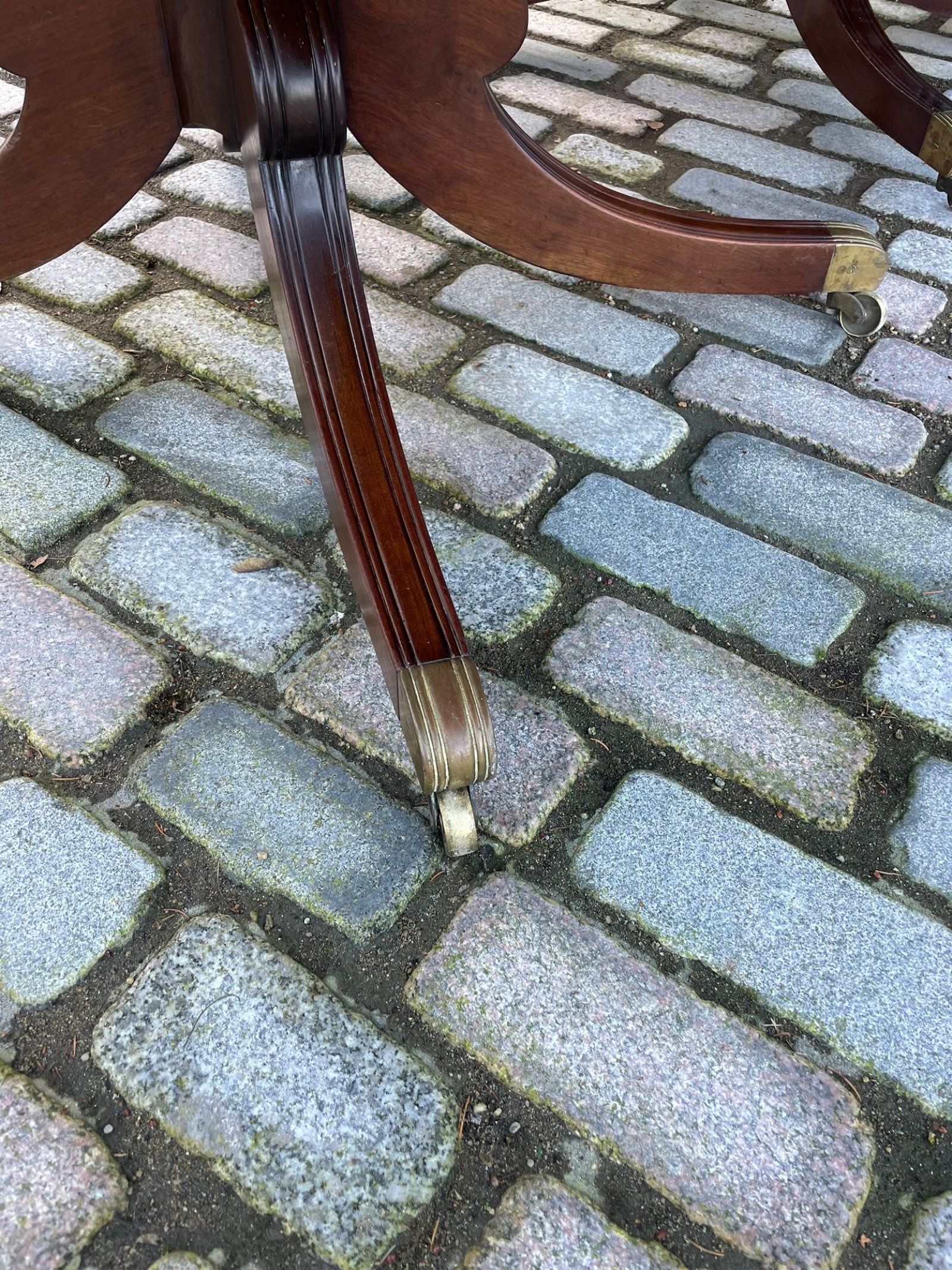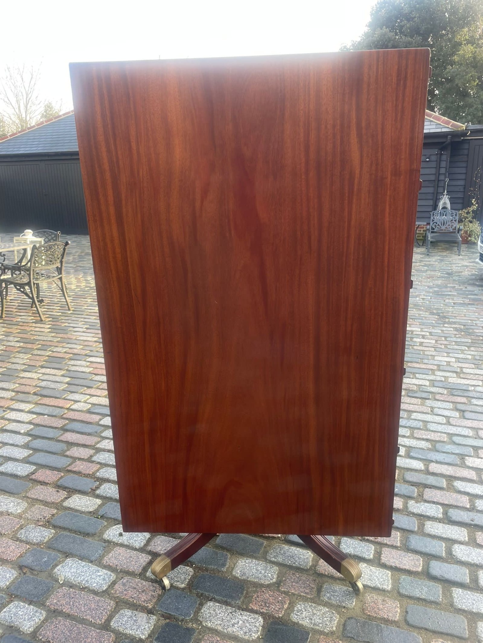 Rare 28 seater 6 pilar antique George III quality mahogany dining table having a large quality figured mahogany top supported by six turned shaped pedestal columns. Each pedestal column stands on 4 reeded sabre legs with original brass feet and castors and original brass clips