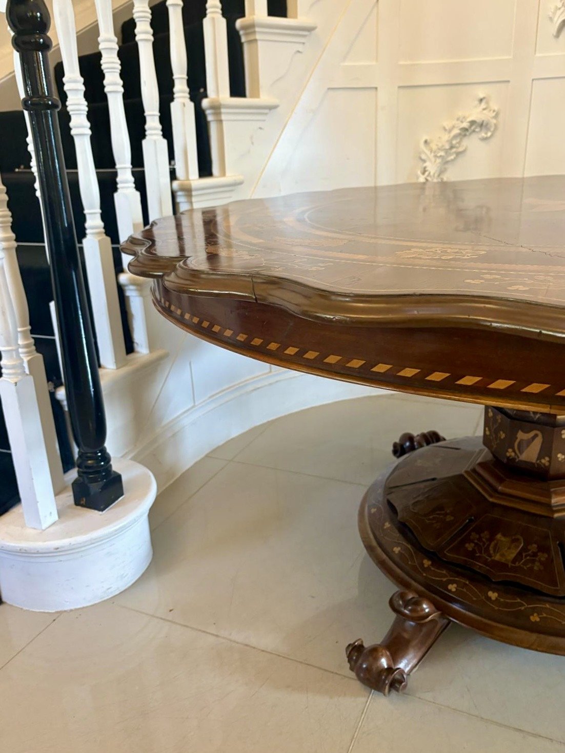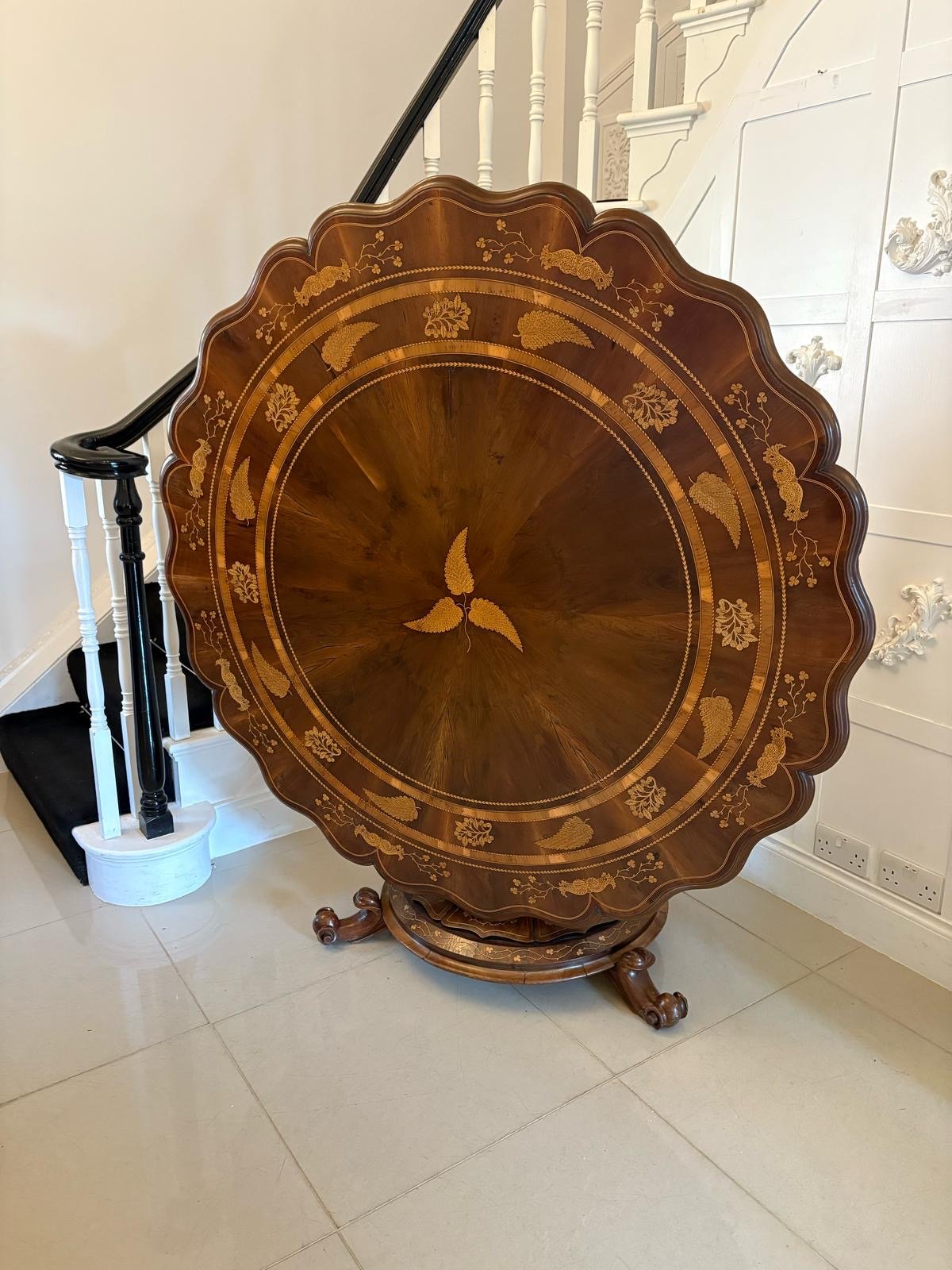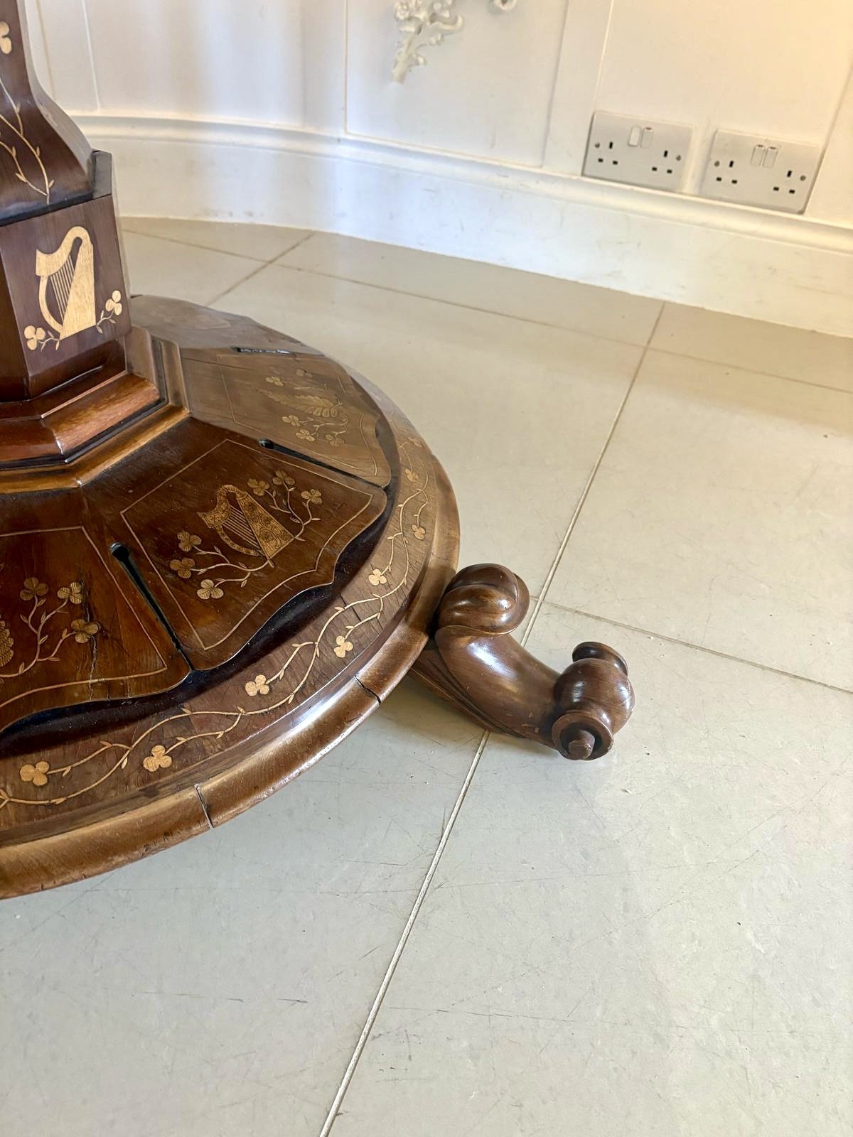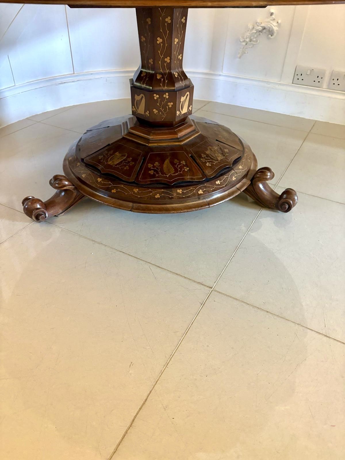 This majestic table boasts a quality large circular yew top with a serpentine moulded edge with exquisite marquetry inlaid shamrocks, foliage and double crossbanding. The top is supported on a magnificent shaped hexagonal pedestal column inlaid with shamrocks and harps raised on a circular platform base inlaid with shamrocks, foliage and harps standing on three shaped scroll feet.