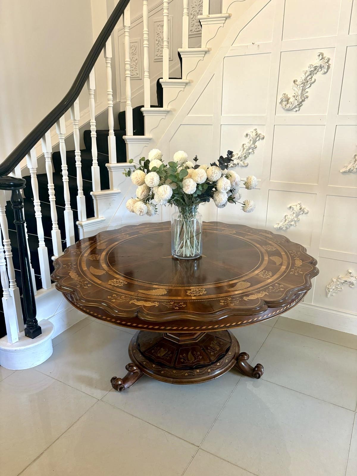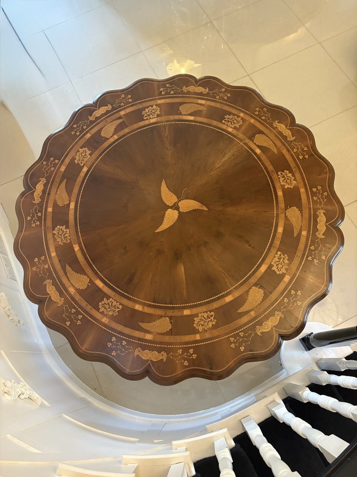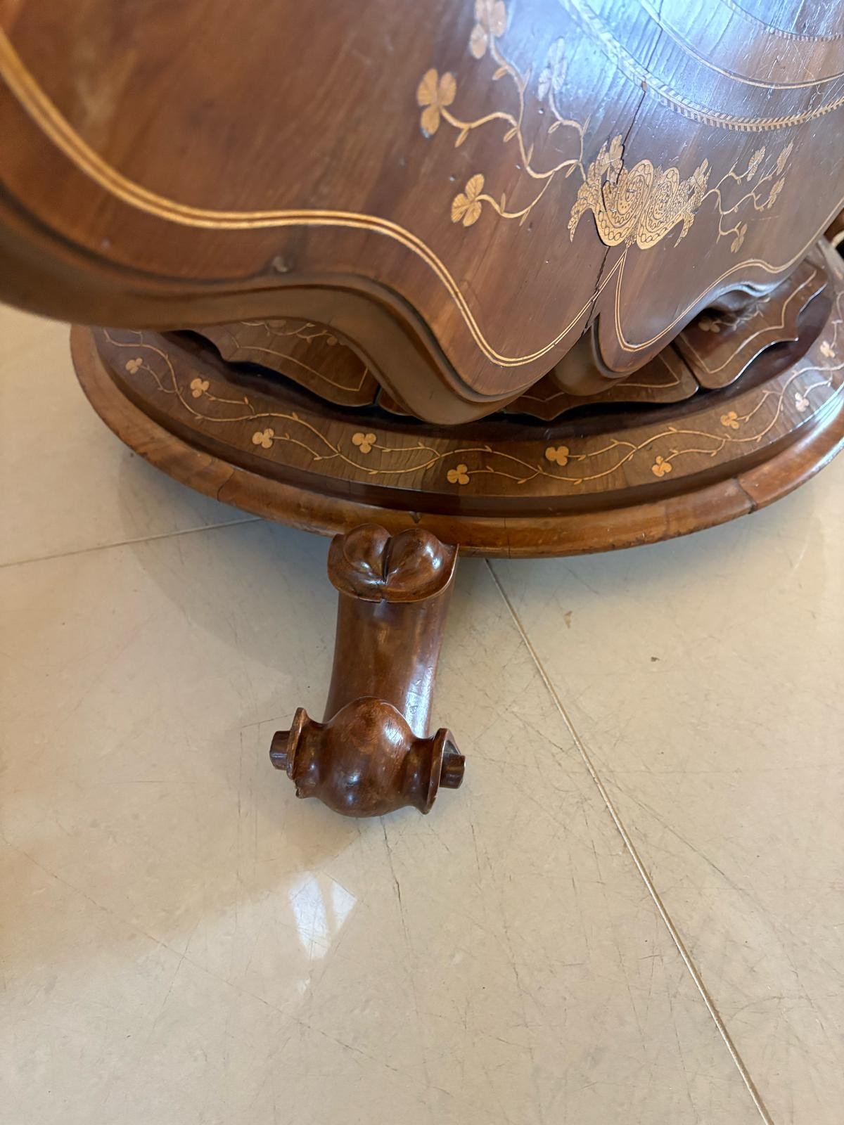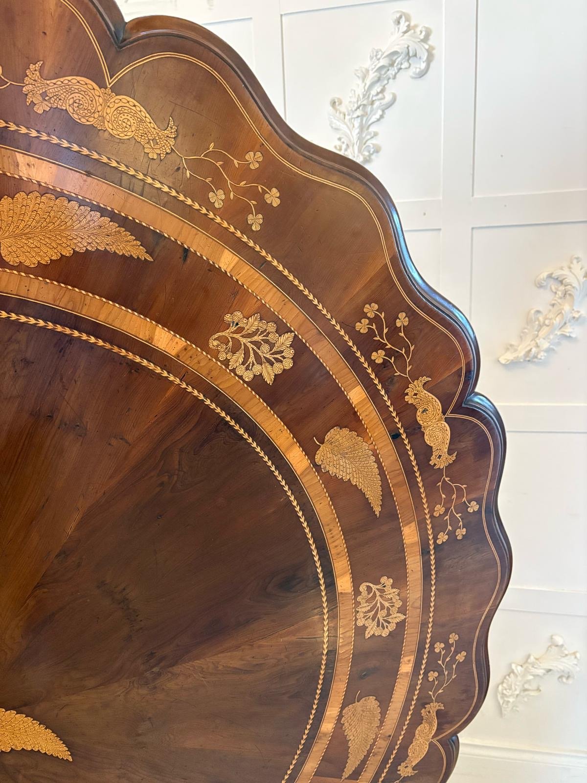 This majestic table boasts a quality large circular yew top with a serpentine moulded edge with exquisite marquetry inlaid shamrocks, foliage and double crossbanding. The top is supported on a magnificent shaped hexagonal pedestal column inlaid with shamrocks and harps raised on a circular platform base inlaid with shamrocks, foliage and harps standing on three shaped scroll feet.