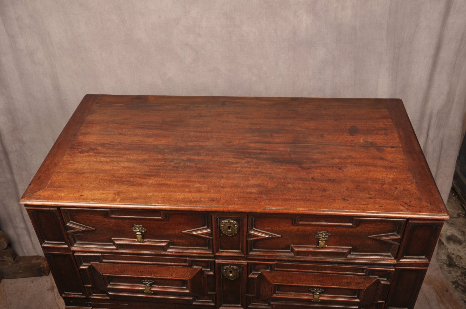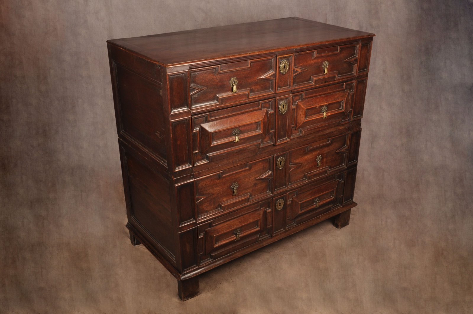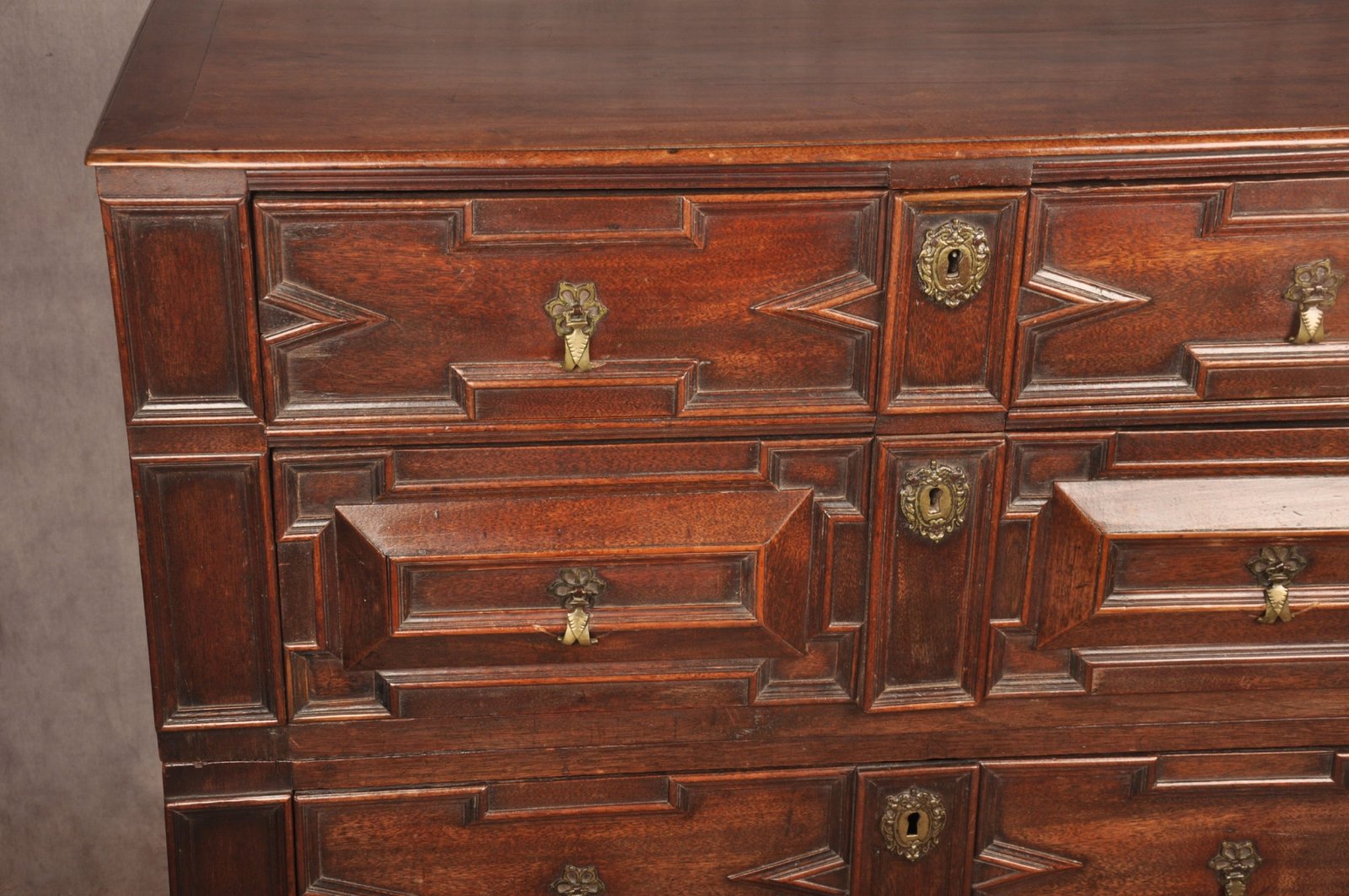 A rare 17th Century Walnut and Fruitwood geometric moulded Chest of drawers in outstanding condition retaining the wonderful original brass drop handles and escutcheons, standing tall on all original feet. Having applied sections of Walnut and fruitwood to the front. The chest has a very good untouched colour and surface throughout. Made originally in two parts with loose drop in mortise and tenon joints that still work perfectly.
