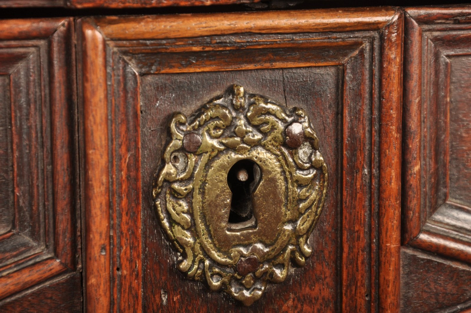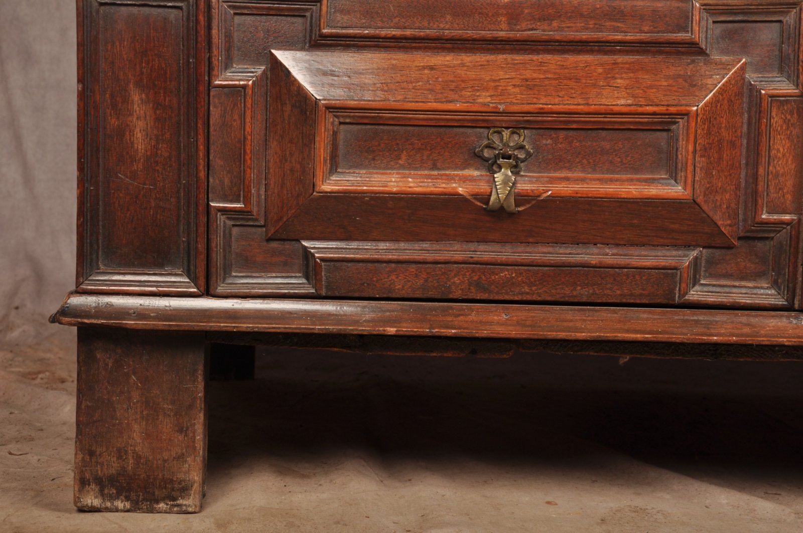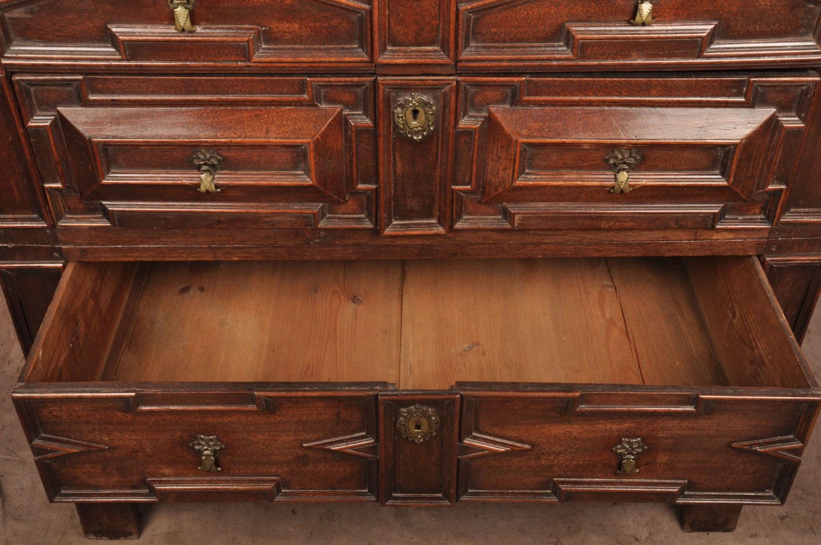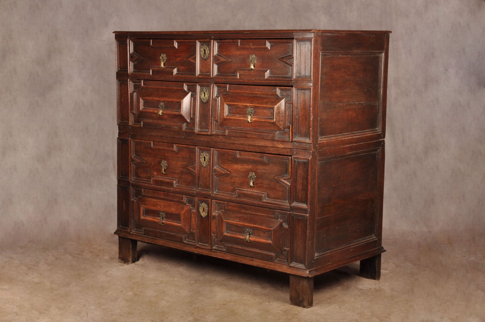 A rare 17th Century Walnut and Fruitwood geometric moulded Chest of drawers in outstanding condition retaining the wonderful original brass drop handles and escutcheons, standing tall on all original feet. Having applied sections of Walnut and fruitwood to the front. The chest has a very good untouched colour and surface throughout. Made originally in two parts with loose drop in mortise and tenon joints that still work perfectly.