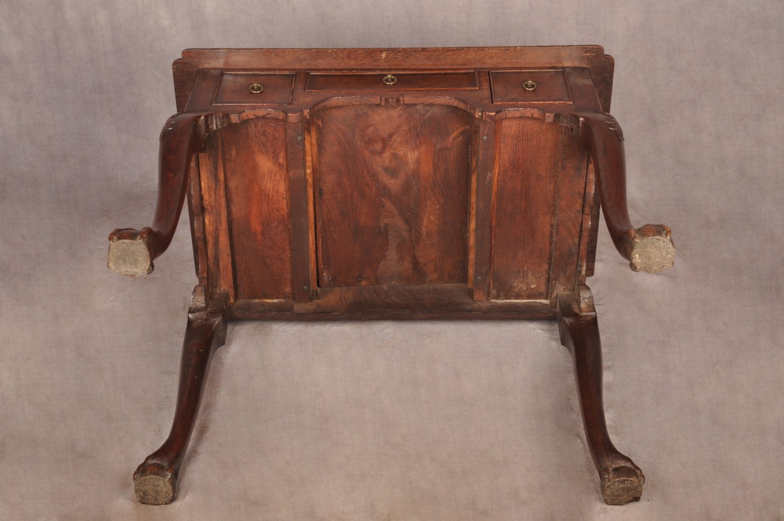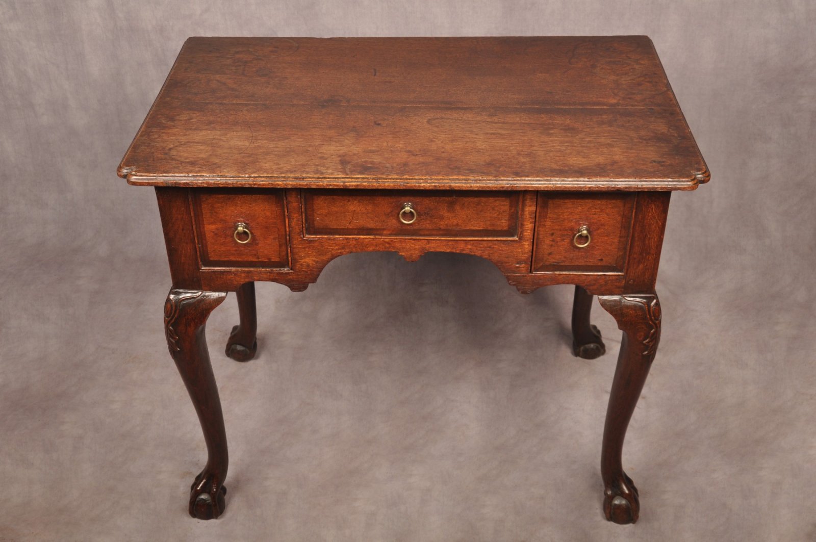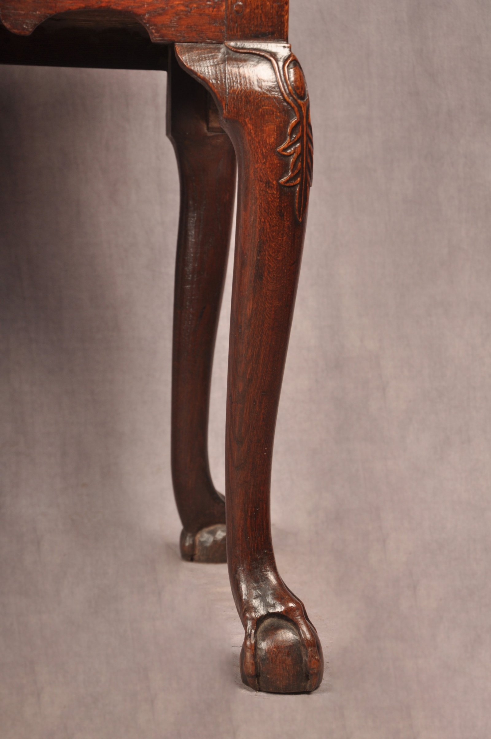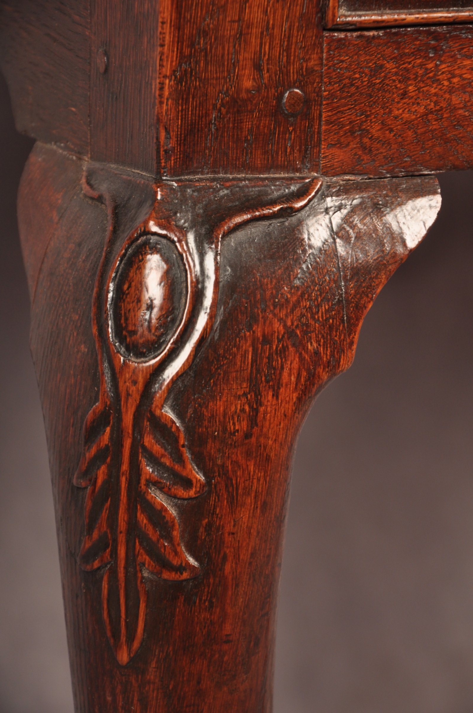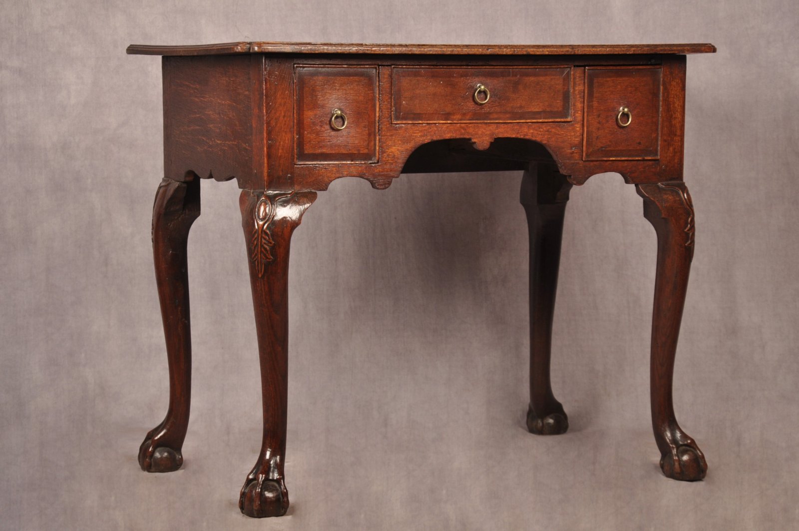 A fine and rare early 18th Century Oak Lowboy of superb colour and condition, a most unusual feature being the wonderful carved splayed legs. Carved with cabochon and leaf work to the knee and having claw and ball foot. The top with caddy mould and nicely carved inverted corners. The drawers with original ring drop handles, mahogany cross banding and cock beading to the edge, having good clean oak drawer linings.