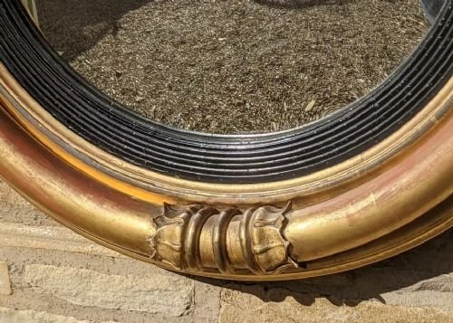 This has its original soft gilded finish with nice antique patina and original convex mirror glass in good clean condition.