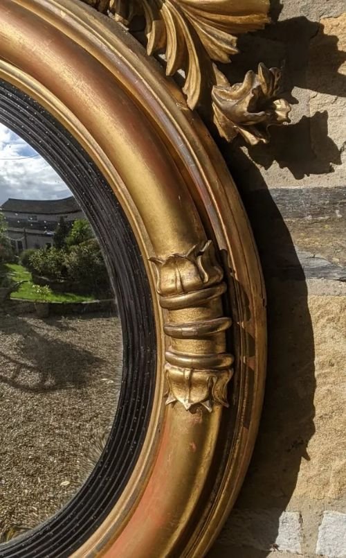 A good Regency period hand carved giltwood convex mirror with rare deer crest dating from around 1800.