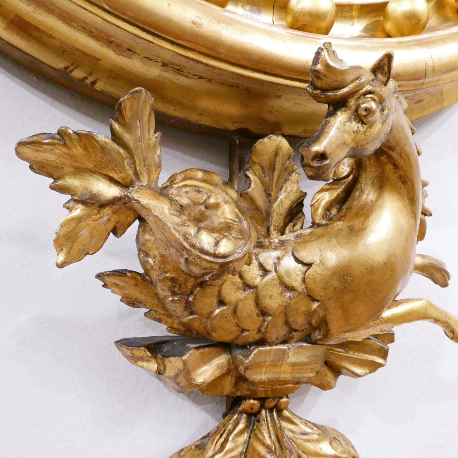 A decorative giltwood wall mirror dating from the Regency period, with very good quality carvings of an eagle perched on rocks to the pediment, and a mythical seahorse to the base which is finished with leaf carving. The frame has cushion moulding with ball design, which is centred by its original circular convex mirror plate which measures 43 cm in diameter.