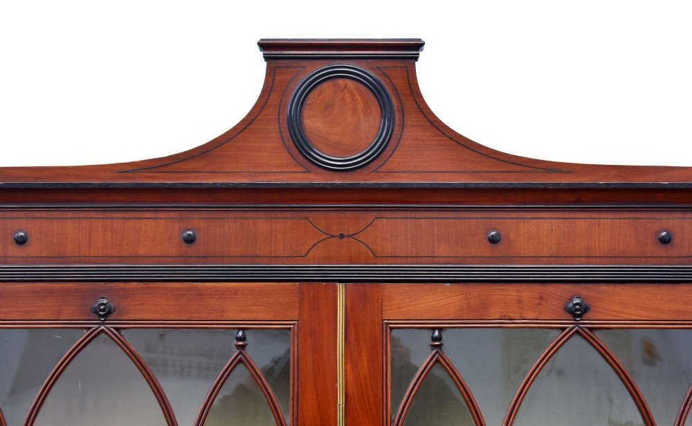 A superb Regency mahogany bookcase of imposing scale and refined architectural form, showcasing the elegance and craftsmanship characteristic of the early 19th century. The upper section features a beautifully shaped pediment centred by a roundel, flanked by turned finials, and above a pair of tall glazed doors with Gothic arched astragals. Inside, adjustable shelves offer excellent display space.