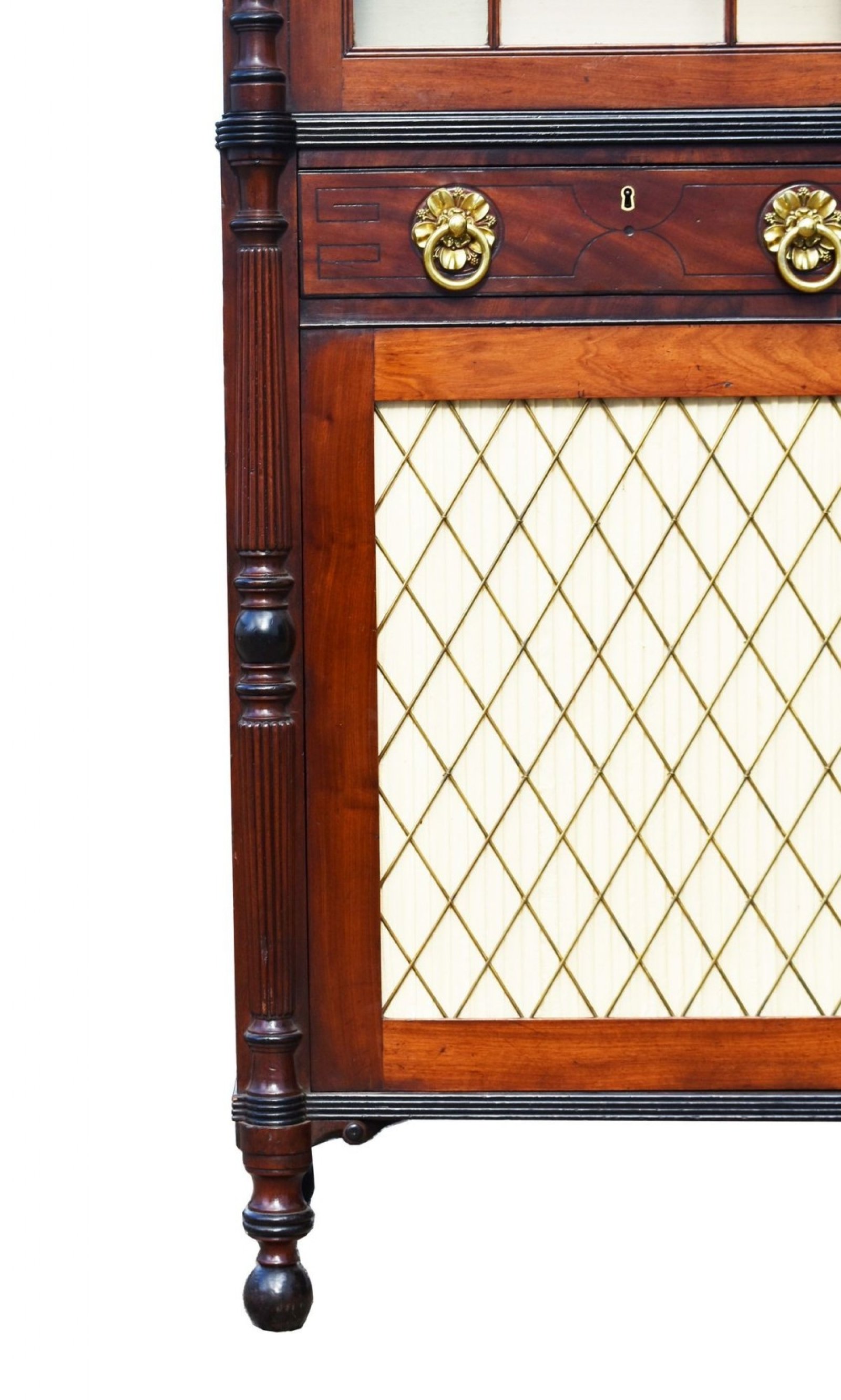 The lower section is fitted with three frieze drawers adorned with fine brass lion-mask ring handles, over a pair of cupboard doors with original Regency brass grillework and pleated silk panels. Bold reeded pilasters, turned feet, and ebonised detailing complete the piece with classical Regency presence.
