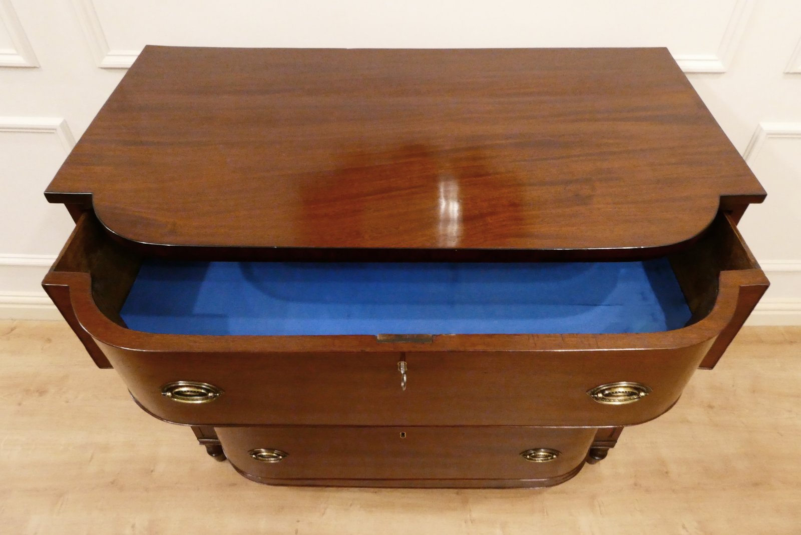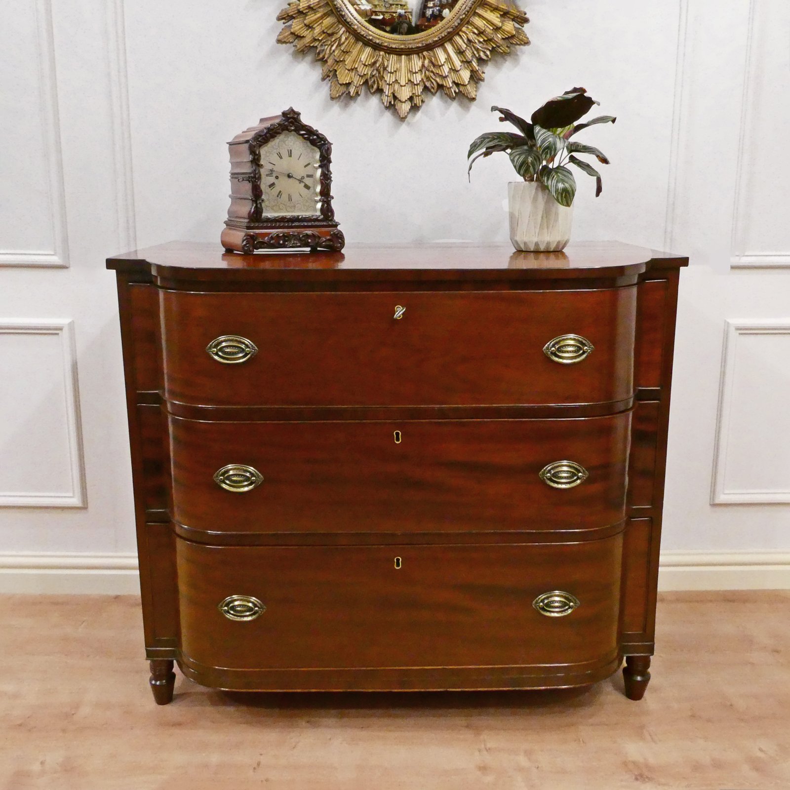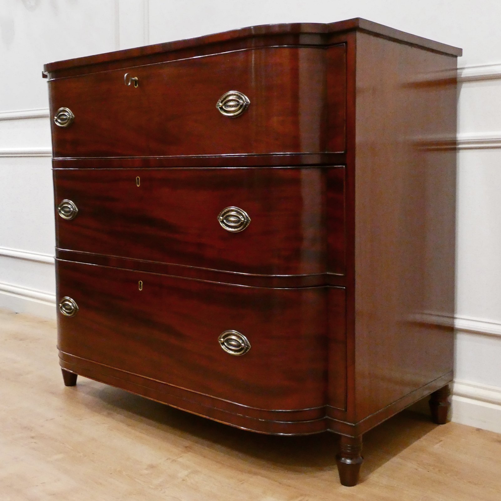A very good quality Regency figured mahogany bow fronted chest of drawers in the manner of Gillows, standing on vase turned feet with reeded moulding. The three drawers each have decorative brass handles and inset brass key escutcheon finished with cockbeaded edges. All the drawers have a working lock and the chest comes with a key.