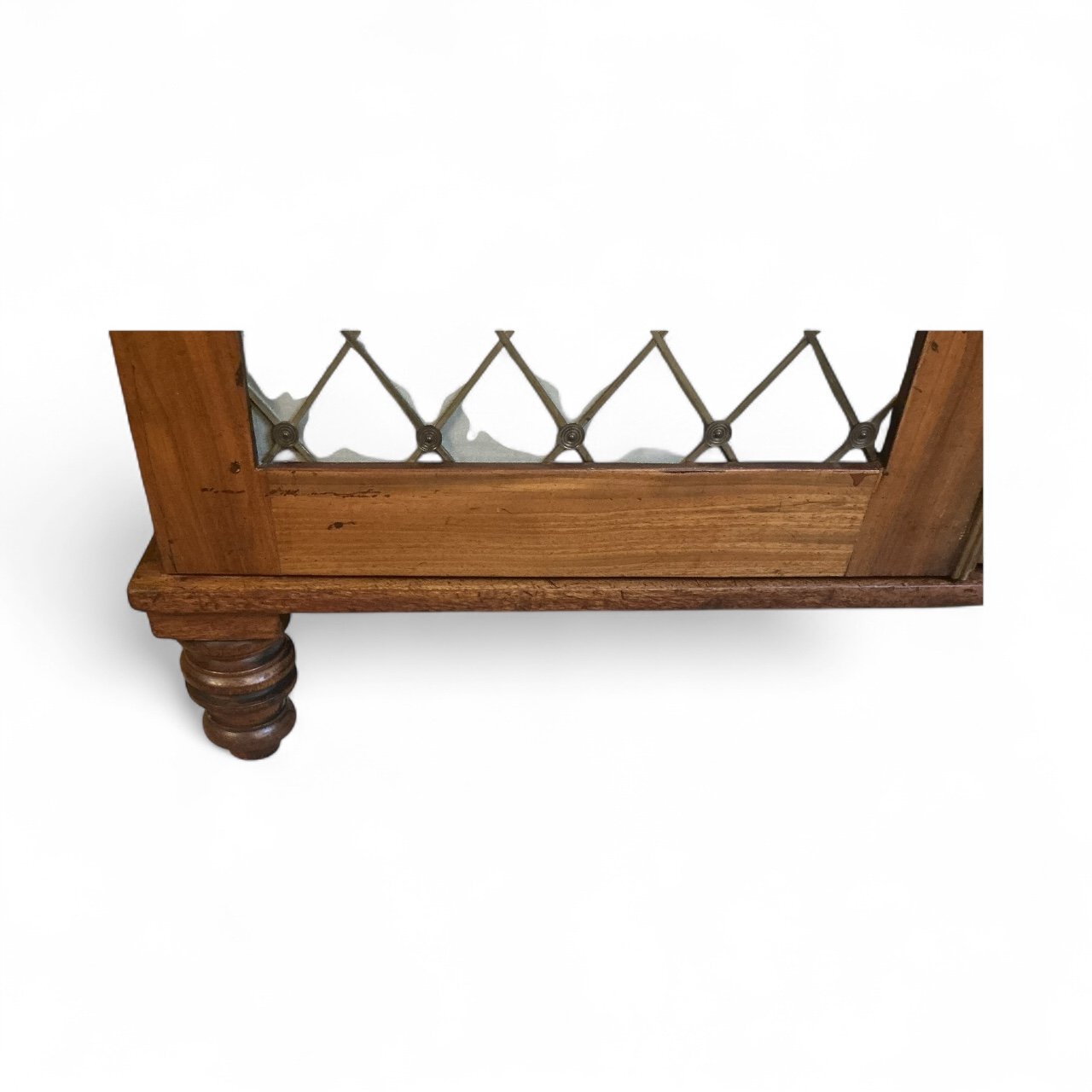 Regency mahogany chiffonier with a frieze drawer, over brass latticed doors, with brass strip moulding sitting on a plinth and turned feet.