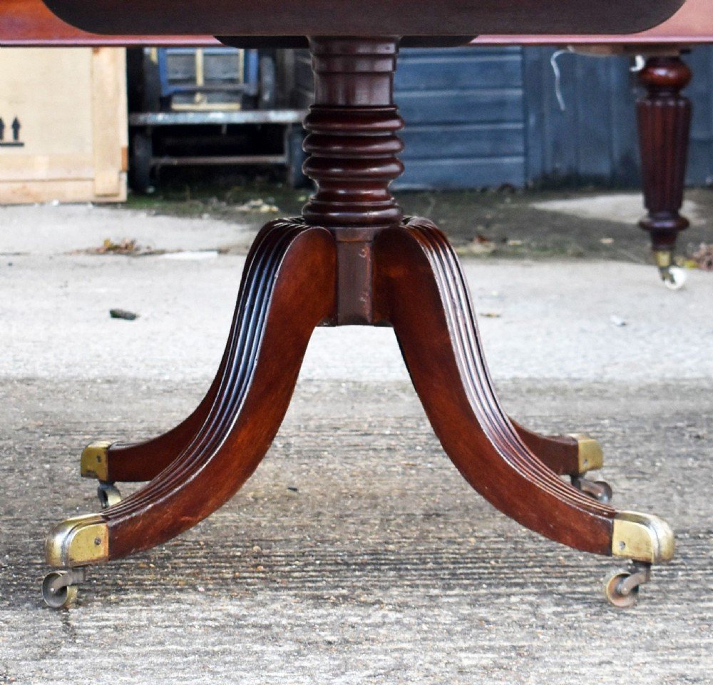 For sale is a fine quality Regency Mahogany Dining Table. Each end is supported by a turned pedestal above four swept legs, terminating on brass castors, flanking a centre section on six ring turned and tapered legs, opening with a gateleg action to support the final two sections.