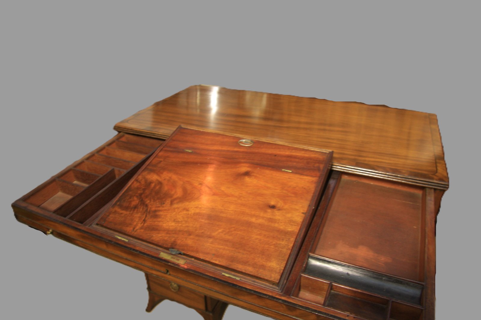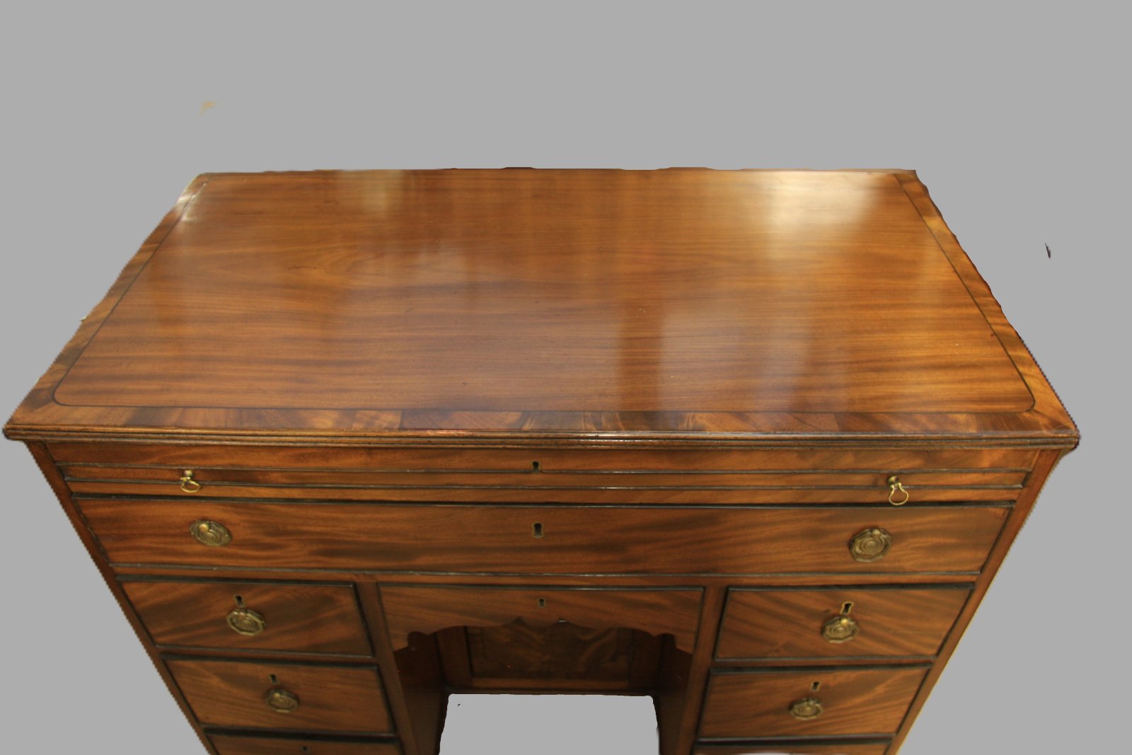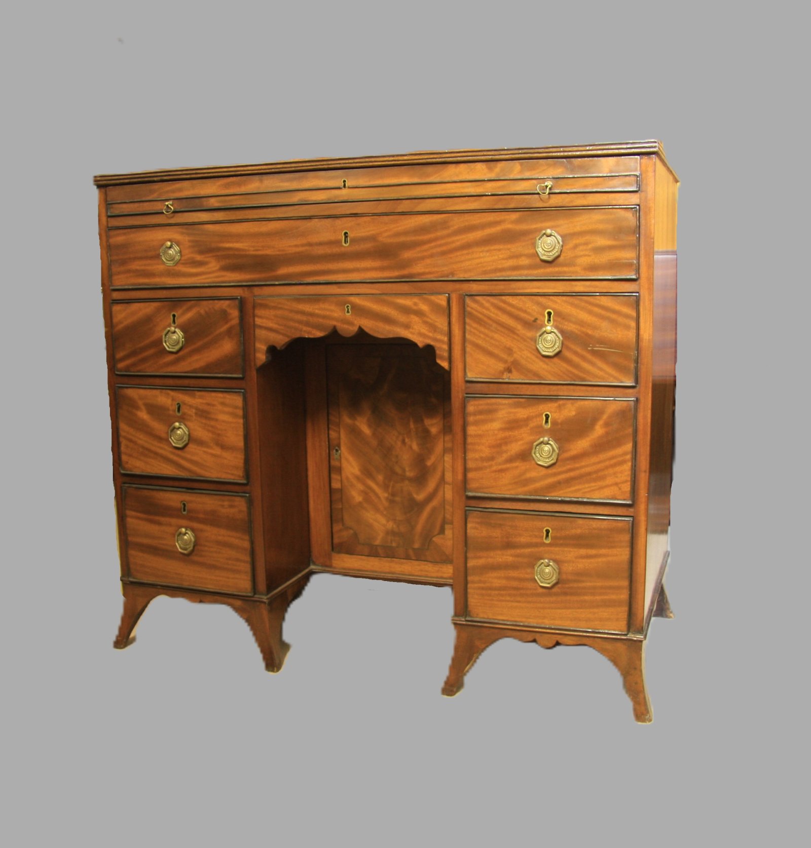 Exceptional quality Regency mahogany kneehole desk having a figured top over a pull out writing surface over a single cupboard flanked either side by graduated drawers all standing on splayed bracket feet.