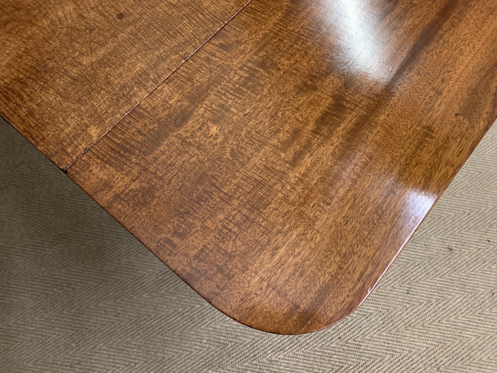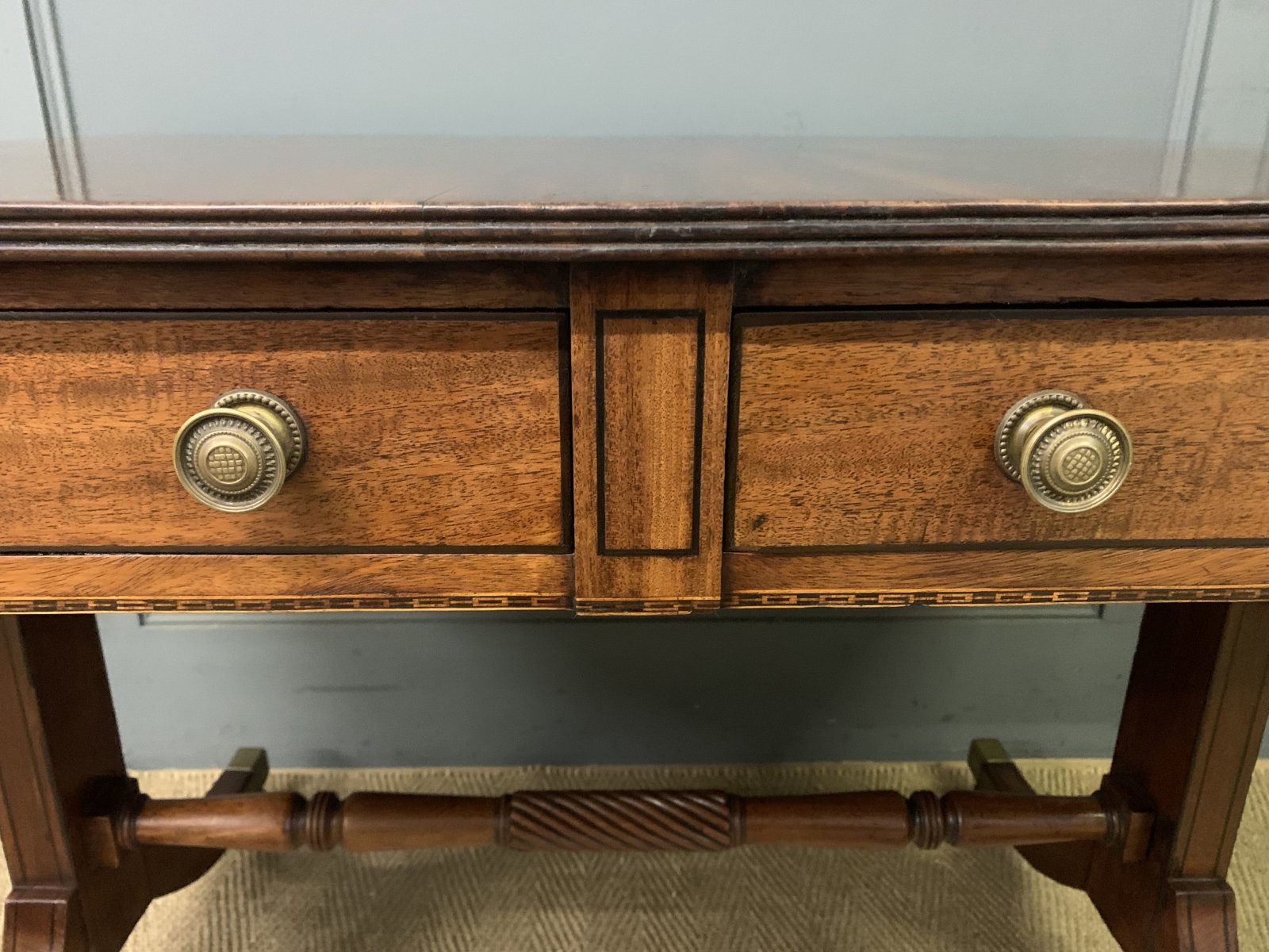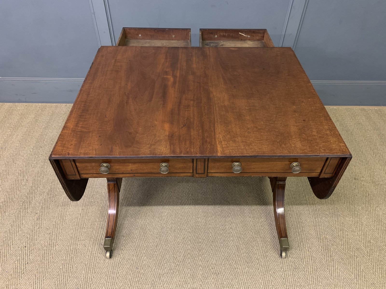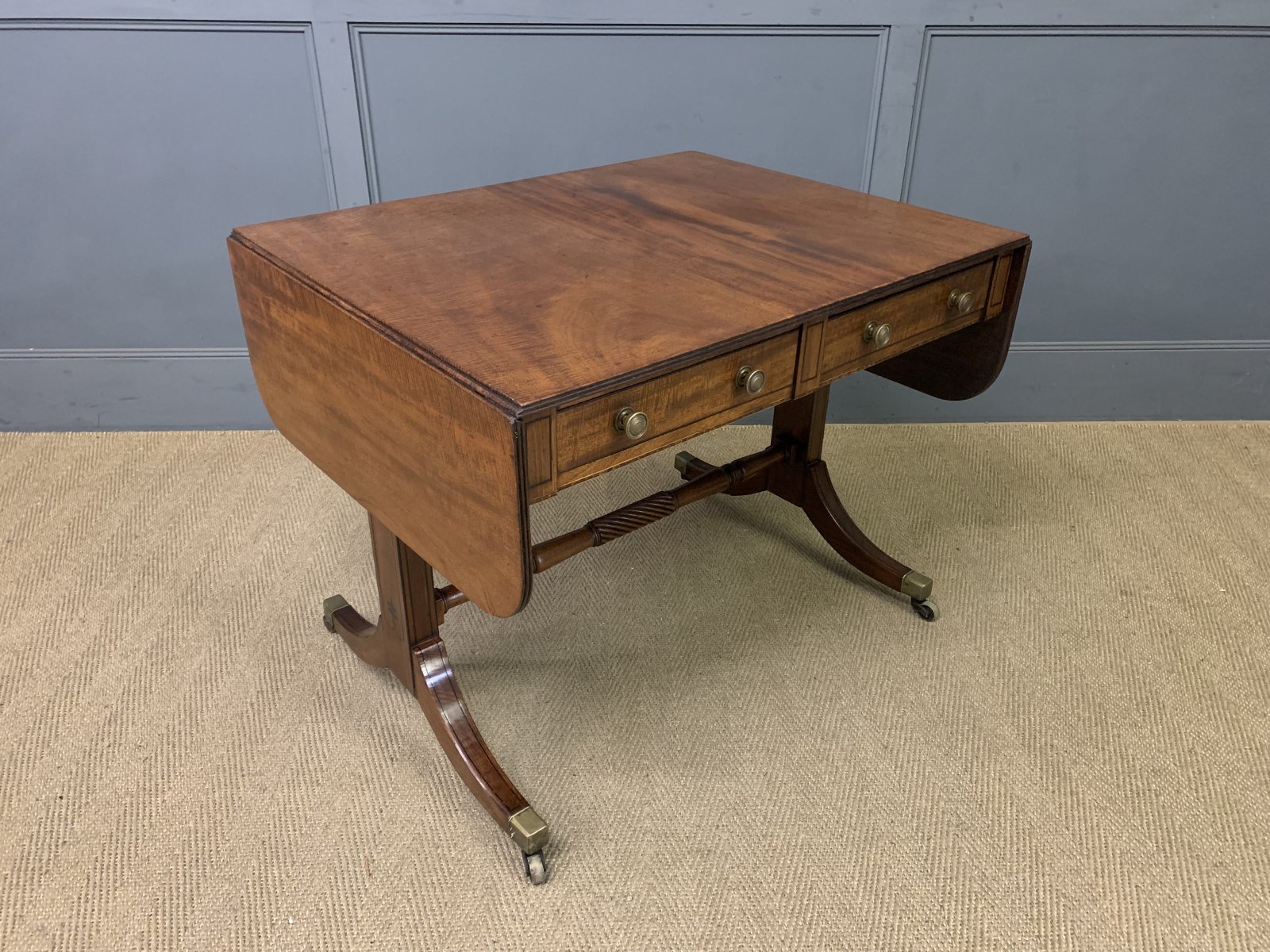 A lovely Regency period mahogany sofa table. Well constructed in solid mahogany and decorated with ebony inlay. With a pair of drawers to the front and with opposing "dummy" drawers to the rear. With a pair of lift-up flaps. Standing on splayed legs which terminate in the original brass caps and castors, united by a turned stretcher. Cleaned and waxed in our workshops and now offered for sale in very good original condition with a good colour and patina.
