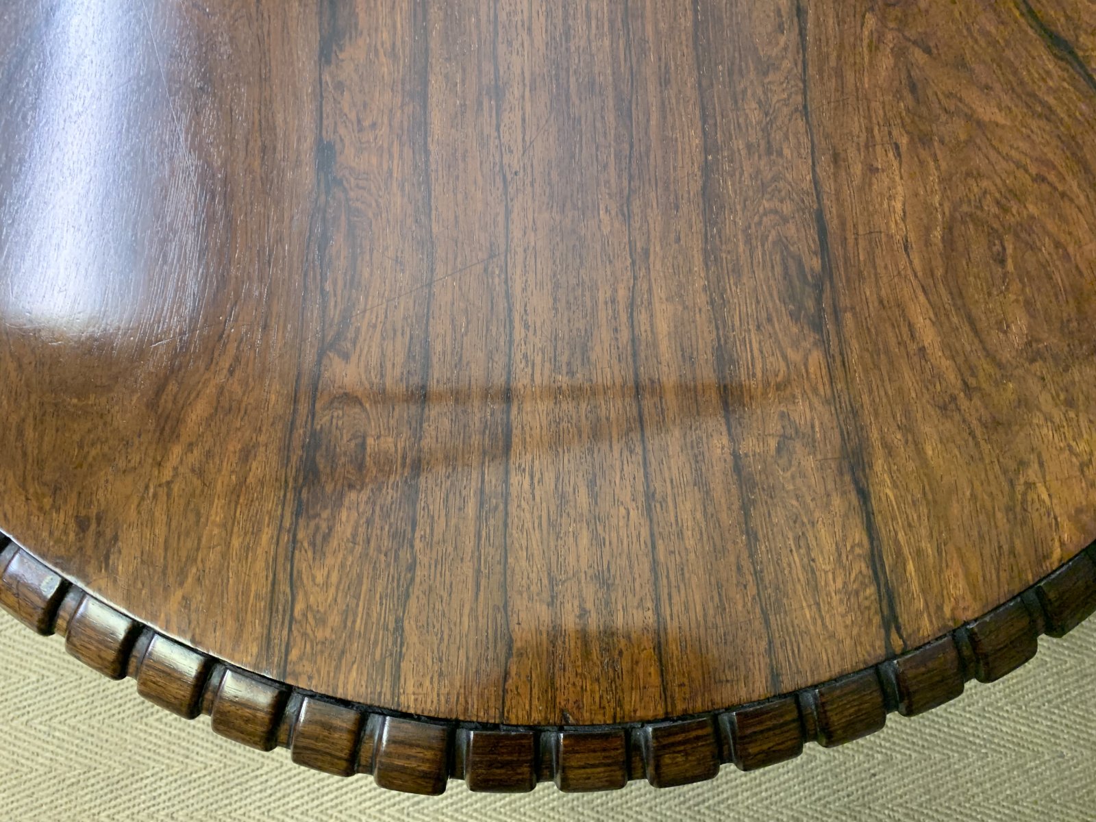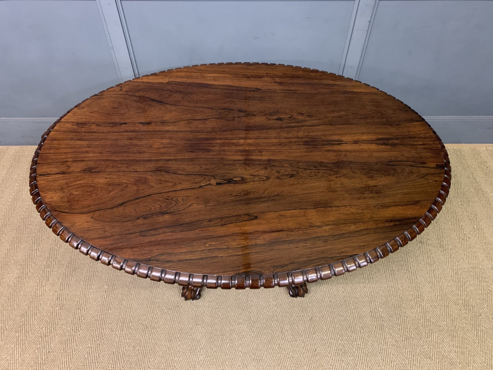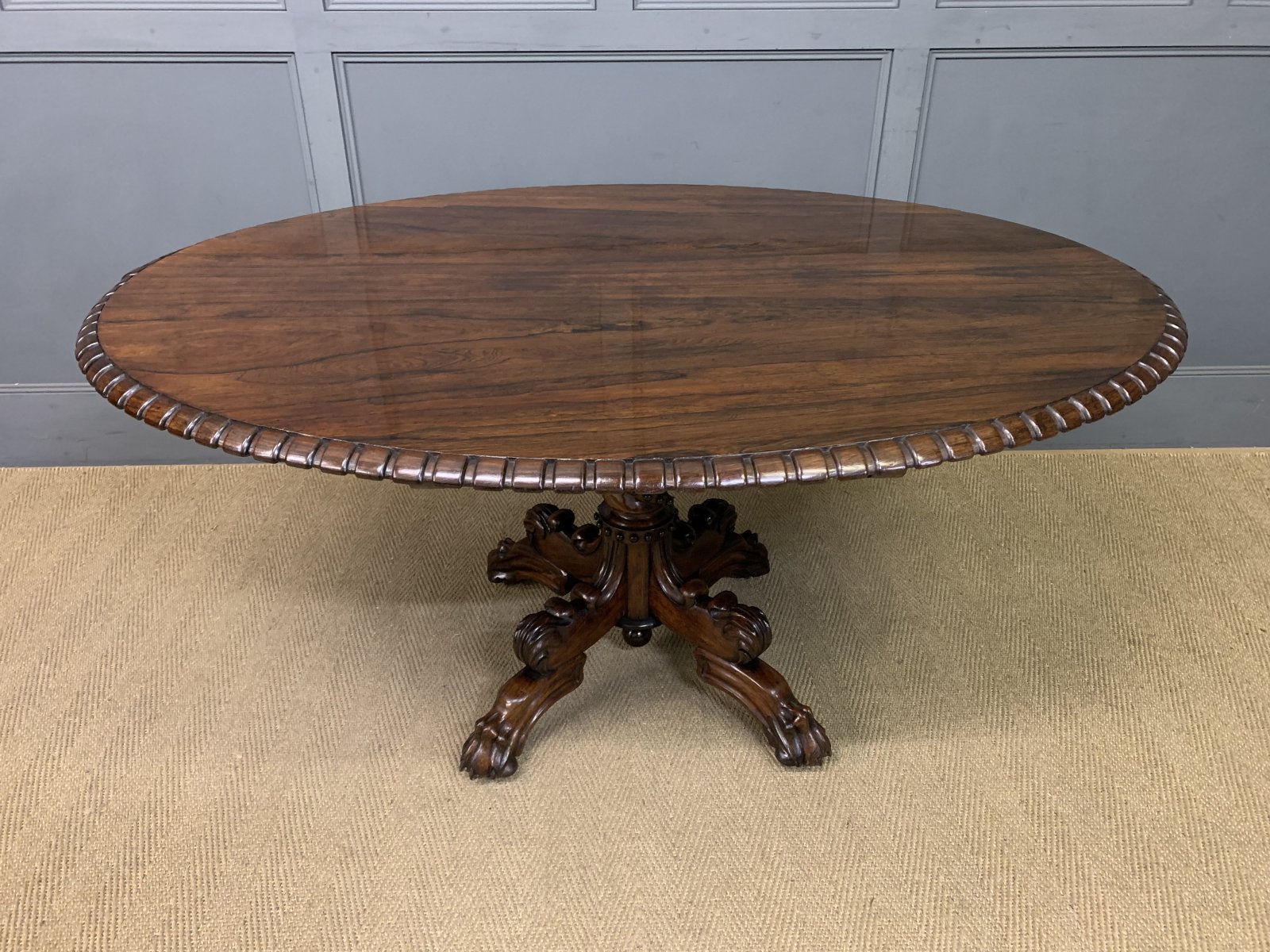 See shipping detailsA superb late Regency period centre, or breakfast table. Very well constructed in solid rosewood with attractive rosewood veneers. The oval top has a gadrooned border. The elaborate base has a spiral twist column with four legs terminating in lions paw feet with recessed brass castors beneath. The top can be tilted up if desired. Sympathetically repolished in our workshops and now offered for sale in very good condition, with a great colour and patina. Splits into two sections for ease of installation.