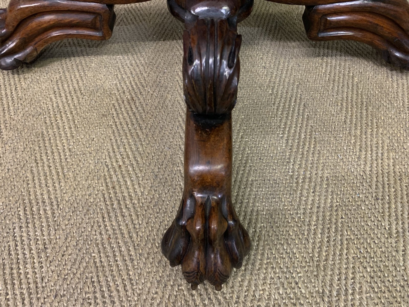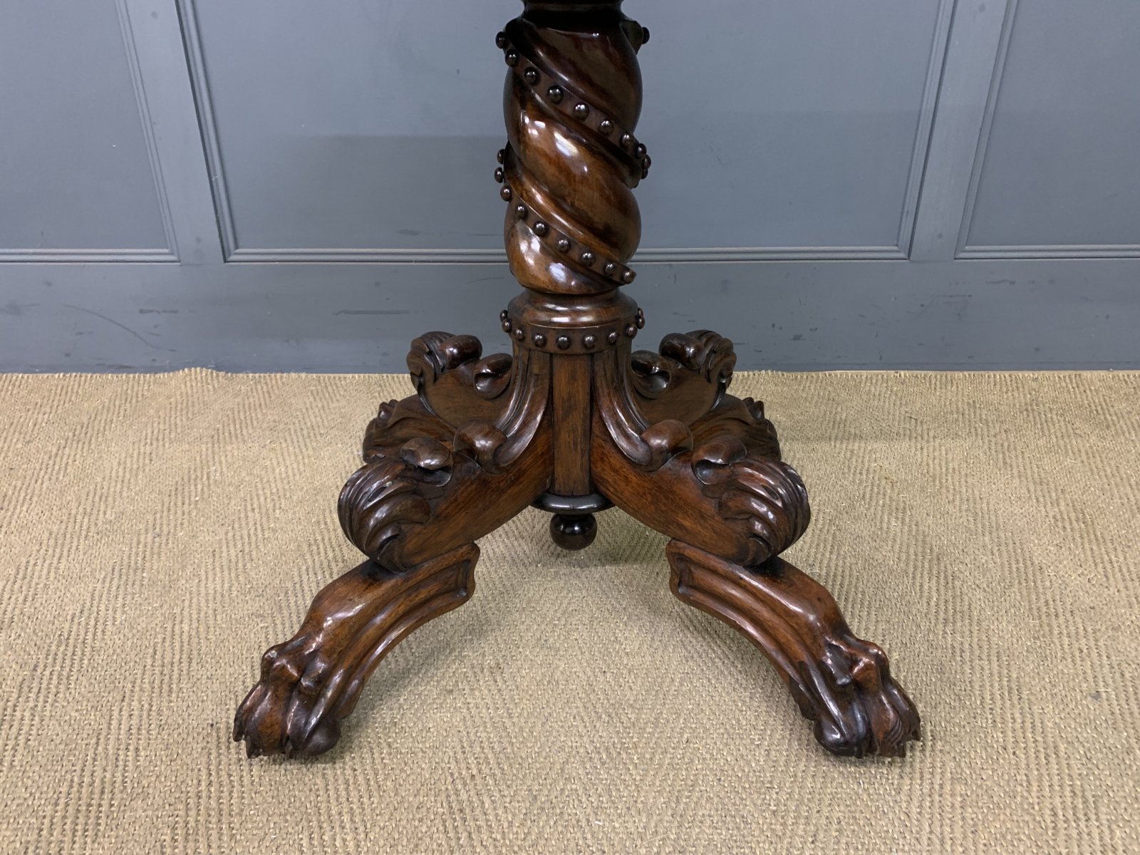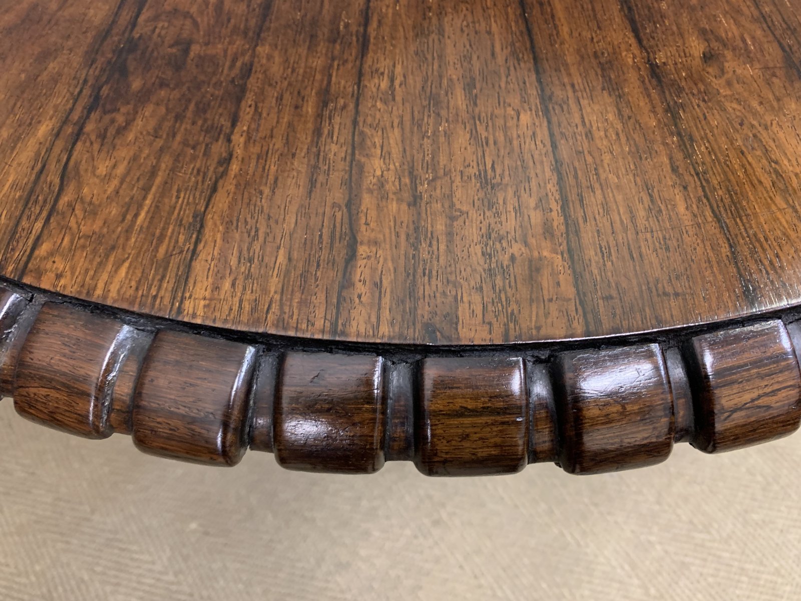 See shipping detailsA superb late Regency period centre, or breakfast table. Very well constructed in solid rosewood with attractive rosewood veneers. The oval top has a gadrooned border. The elaborate base has a spiral twist column with four legs terminating in lions paw feet with recessed brass castors beneath. The top can be tilted up if desired. Sympathetically repolished in our workshops and now offered for sale in very good condition, with a great colour and patina. Splits into two sections for ease of installation.