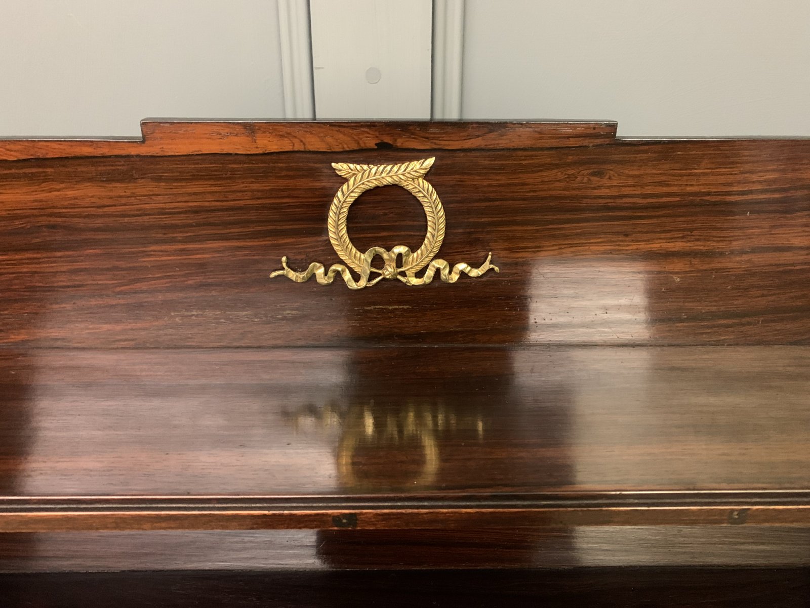 An attractive Regency period rosewood waterfall bookcase , or side cabinet. Very well constructed in solid rosewood with lovely rosewood veneers. Embellished with crisply cast gilt metal mounts throughout. With a series of 4 graduated shelves, a pair of drawers and a pair of cupboard door