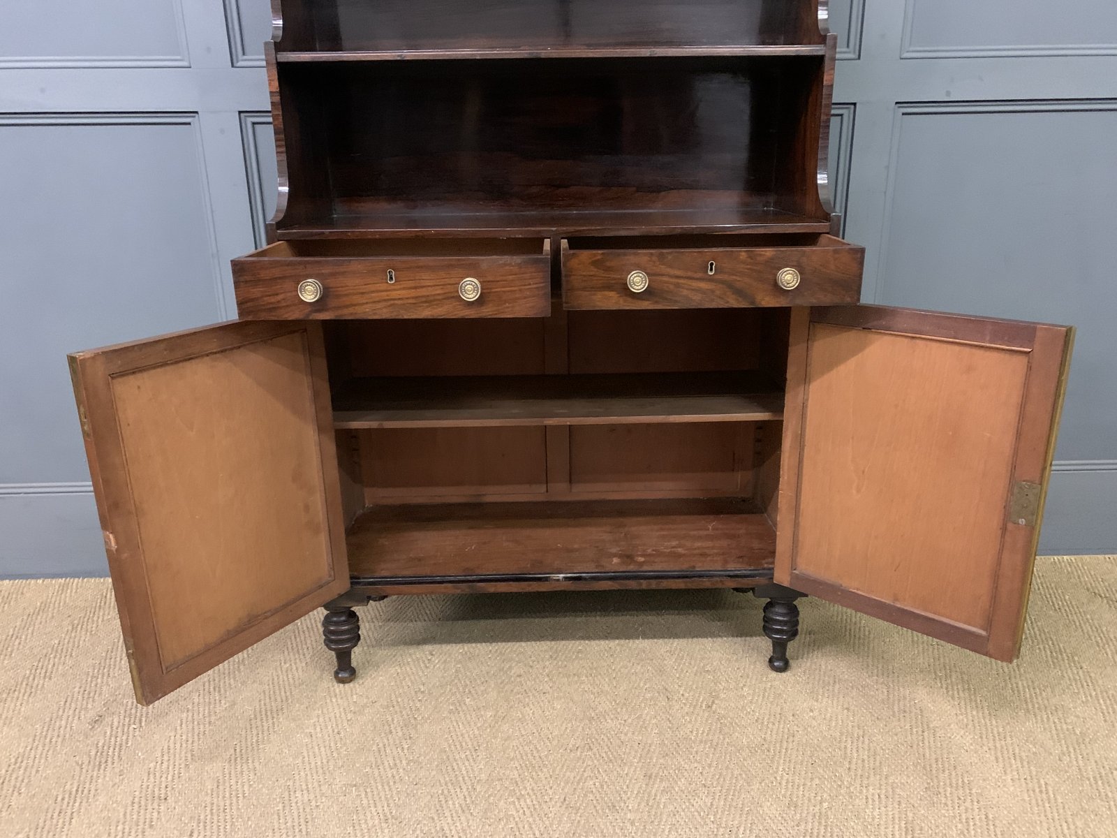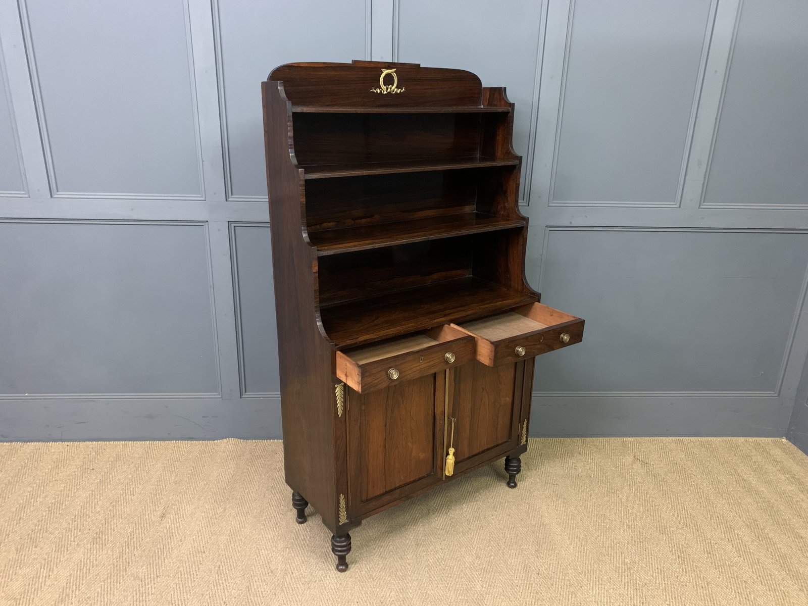 An attractive Regency period rosewood waterfall bookcase , or side cabinet. Very well constructed in solid rosewood with lovely rosewood veneers. Embellished with crisply cast gilt metal mounts throughout. With a series of 4 graduated shelves, a pair of drawers and a pair of cupboard doors beneath. All standing on elegant turned feet. The cupboard doors are lockable (key supplied) and open to reveal a shelved interior. Cleaned and waxed in our workshops. Now offered for sale in very good original condition with a great colour and patina.