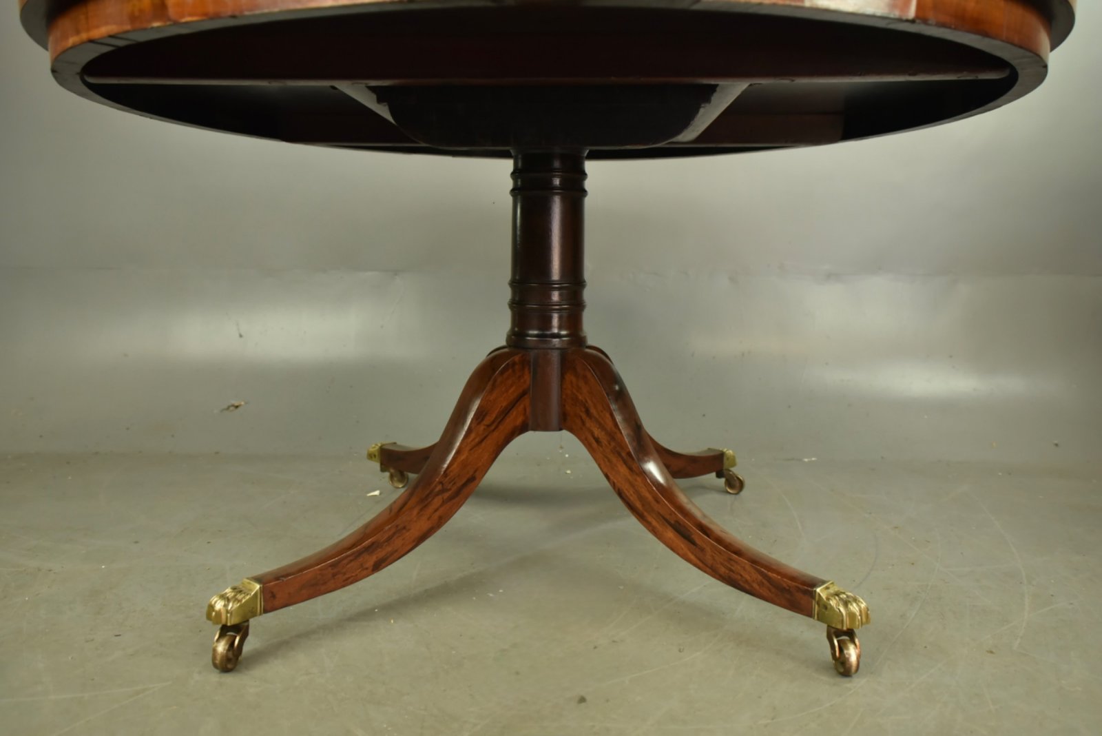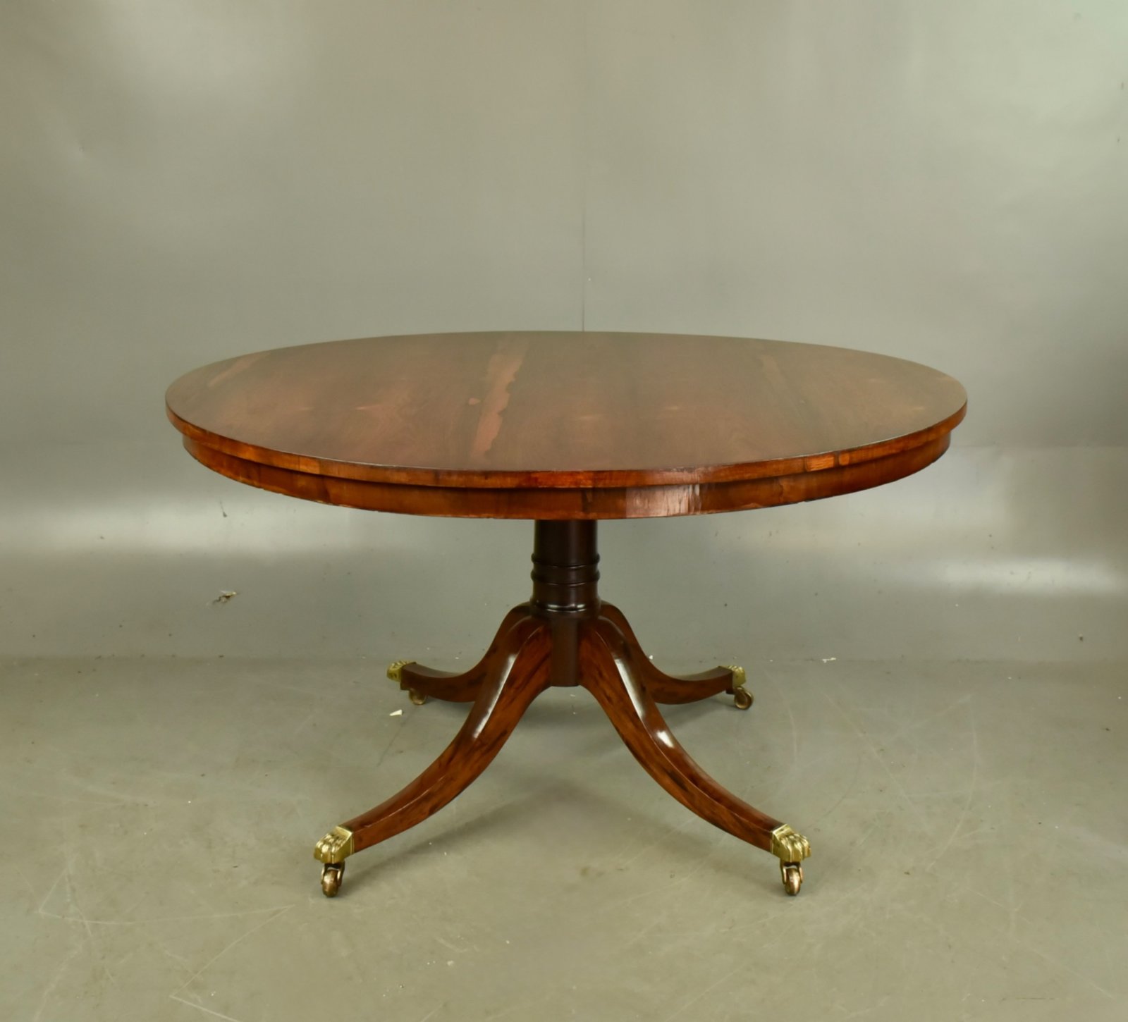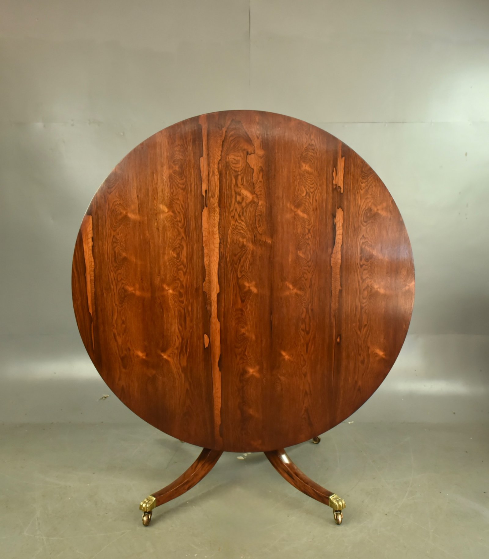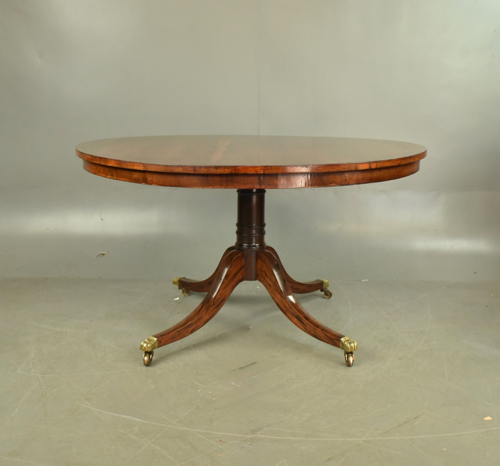 Fine quality table with a fantastic grain and colour to the top ,the tilt top action works as it should and locks down holding the top very solid with no wobbles , It stands on a fine turned column with four out swept legs terminating with fine quality brass paw caps and brass castors .It will seat 6 with comfort .