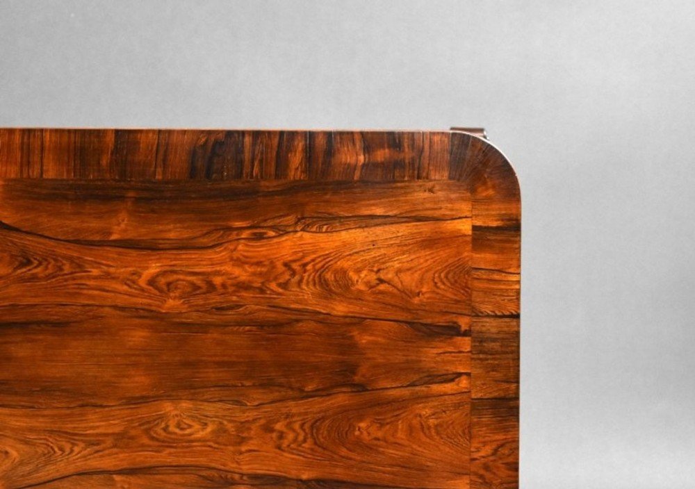 For sale is a good quality Regency rosewood library table, having a cross banded edge surrounding a well figured rosewood top, with two drawers below and two dummy drawers on the opposing side. Standing on tapered legs, united by a turned stretcher, the table is raised on its original brass castors and remains in very good condition for its age.