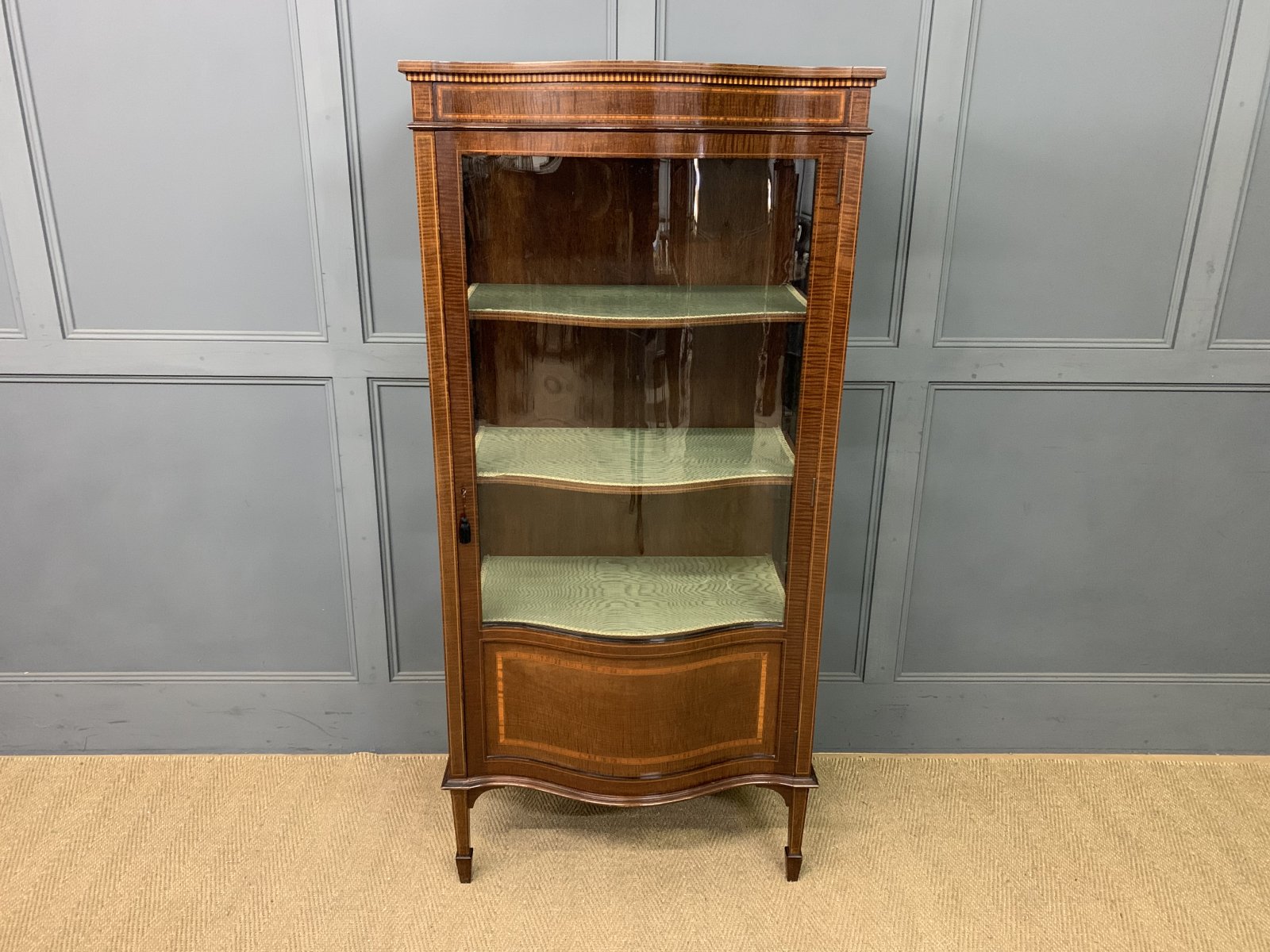 See shipping detailsA charming Edwardian period inlaid mahogany display cabinet. Of serpentine form and very well constructed in solid mahogany with attractive fiddle-back mahogany veneers. Probably made by Maple & Co of London. Decorated with satinwood cross banding and boxwood stringing throughout. The single door opens to access a shelved and lined display space. The door is lockable (key supplied). All standing on short square tapering legs which terminate in spade feet. Cleaned and waxed in our workshops. Now offered for sale in very good original condition with a good colour and patina.