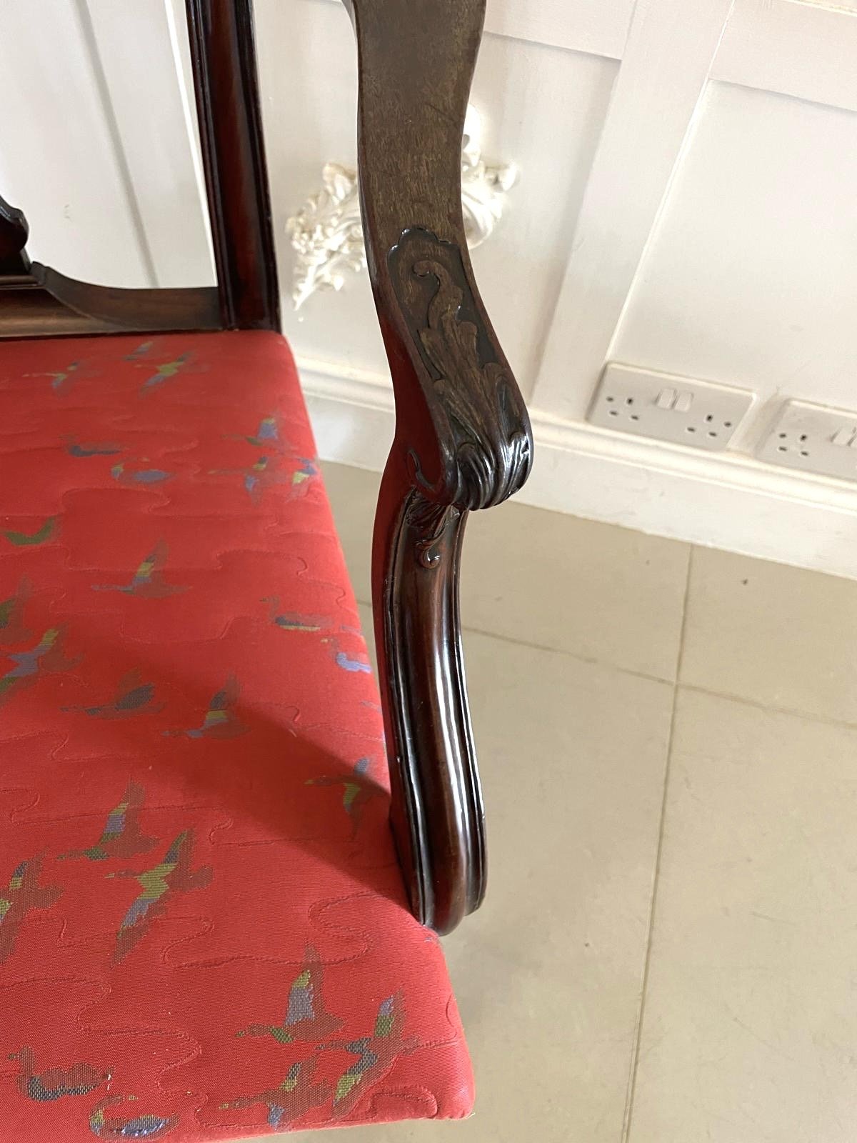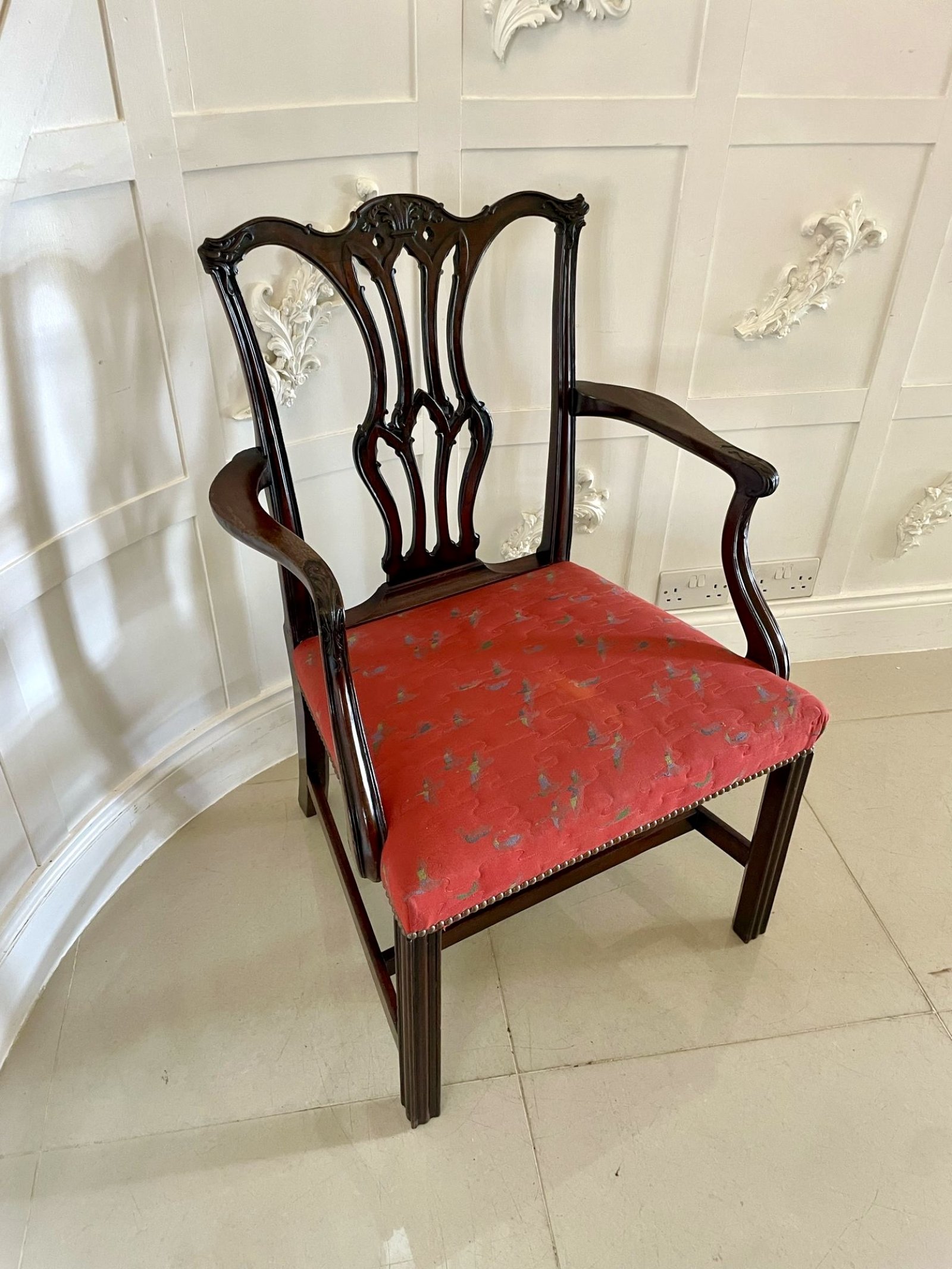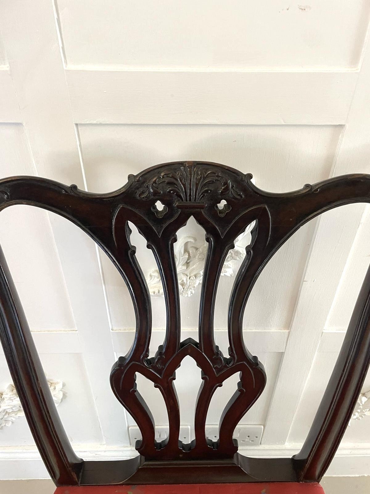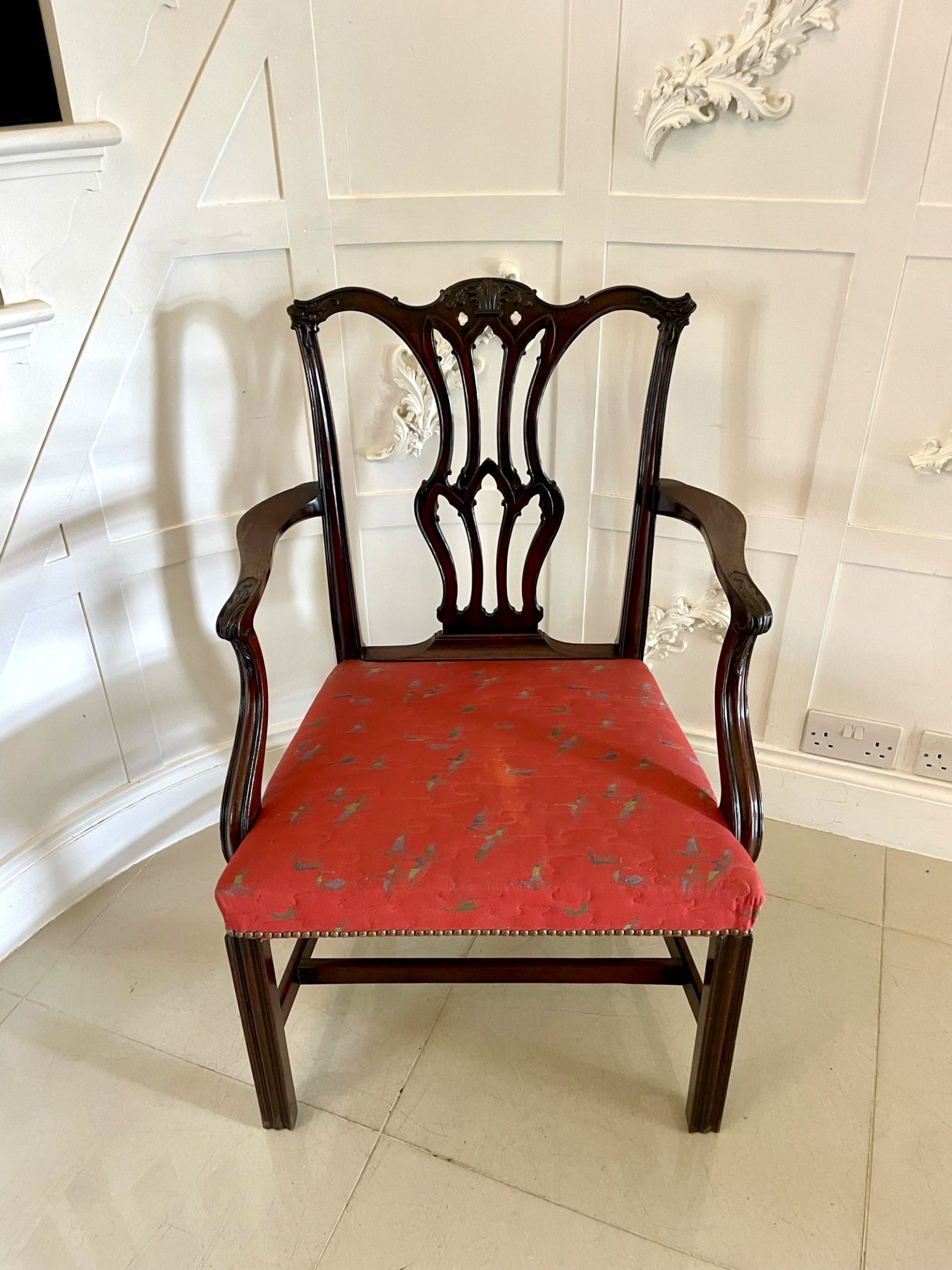 Set of 12 antique Victorian quality carved mahogany dining chairs consisting of two elbow chairs and ten side chairs, elbow chairs having shaped open carved arms supported by reeded supports, fantastic carved mahogany backs with a gothic design, shaped splat to the centre, stuff over seats in a quality red fabric standing on square moulded front legs and out swept back legs united by mahogany stretchers