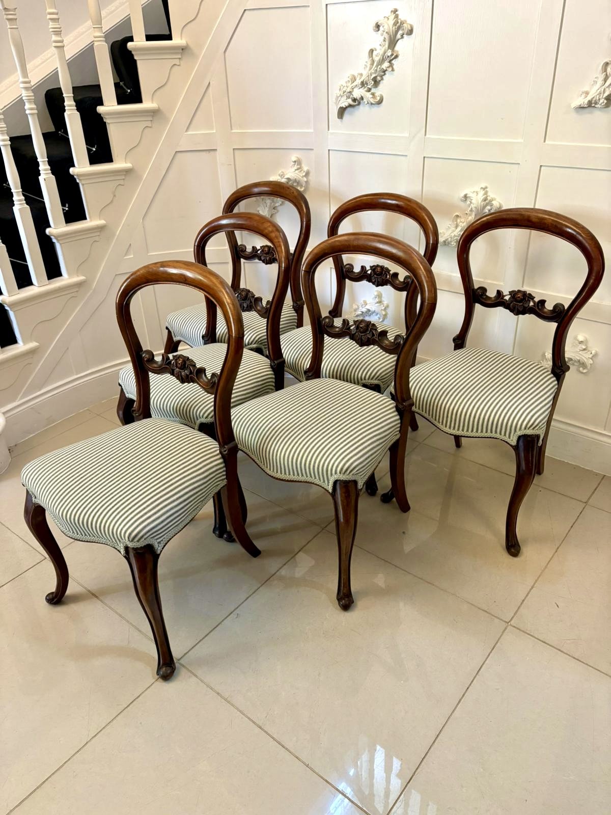 Set of 6 antique Victorian quality carved mahogany balloon back dining chairs
