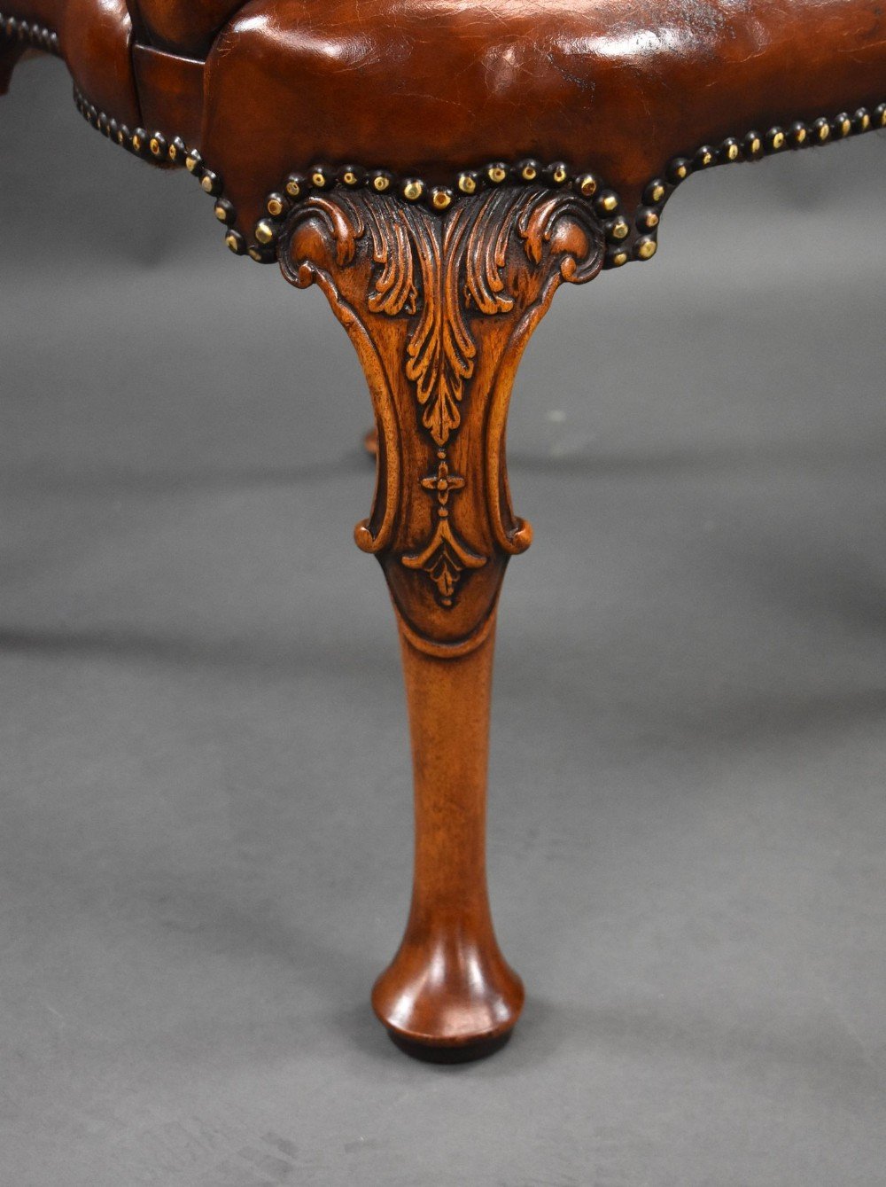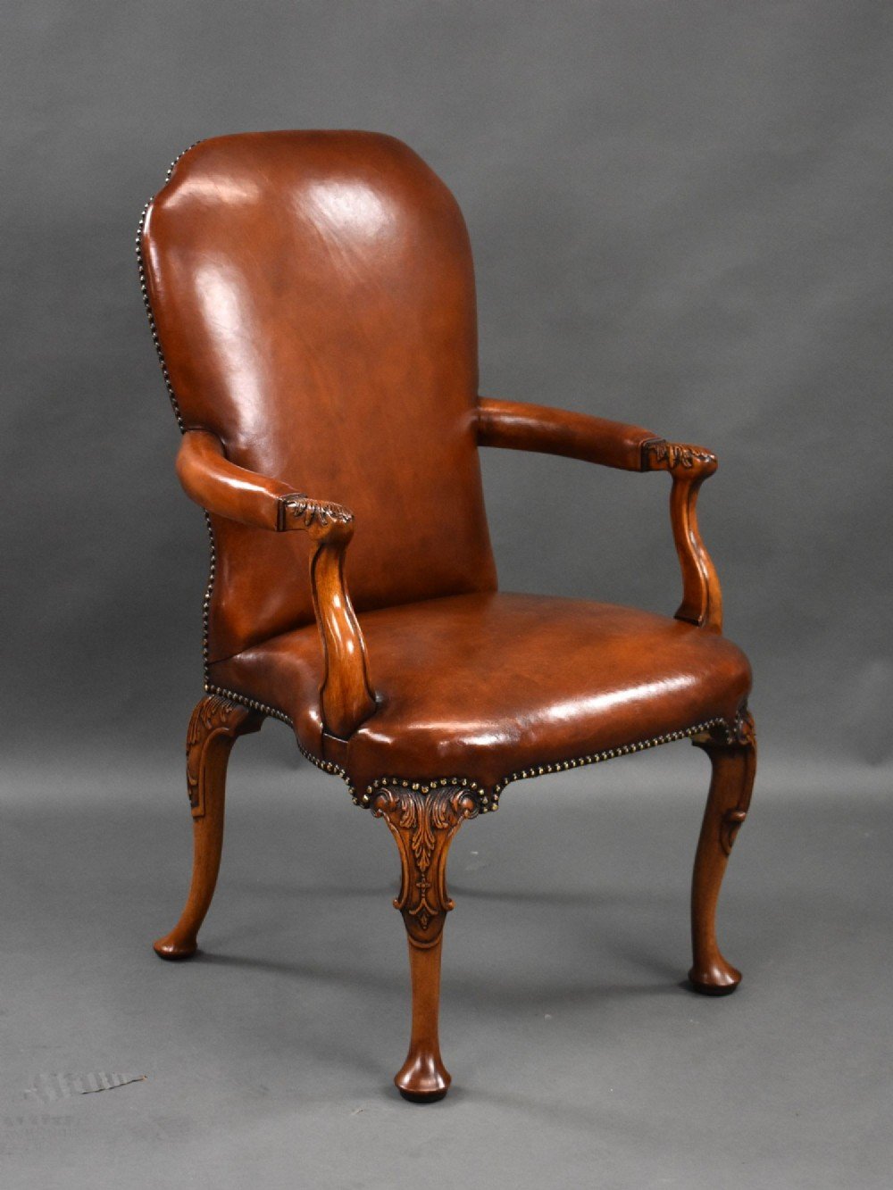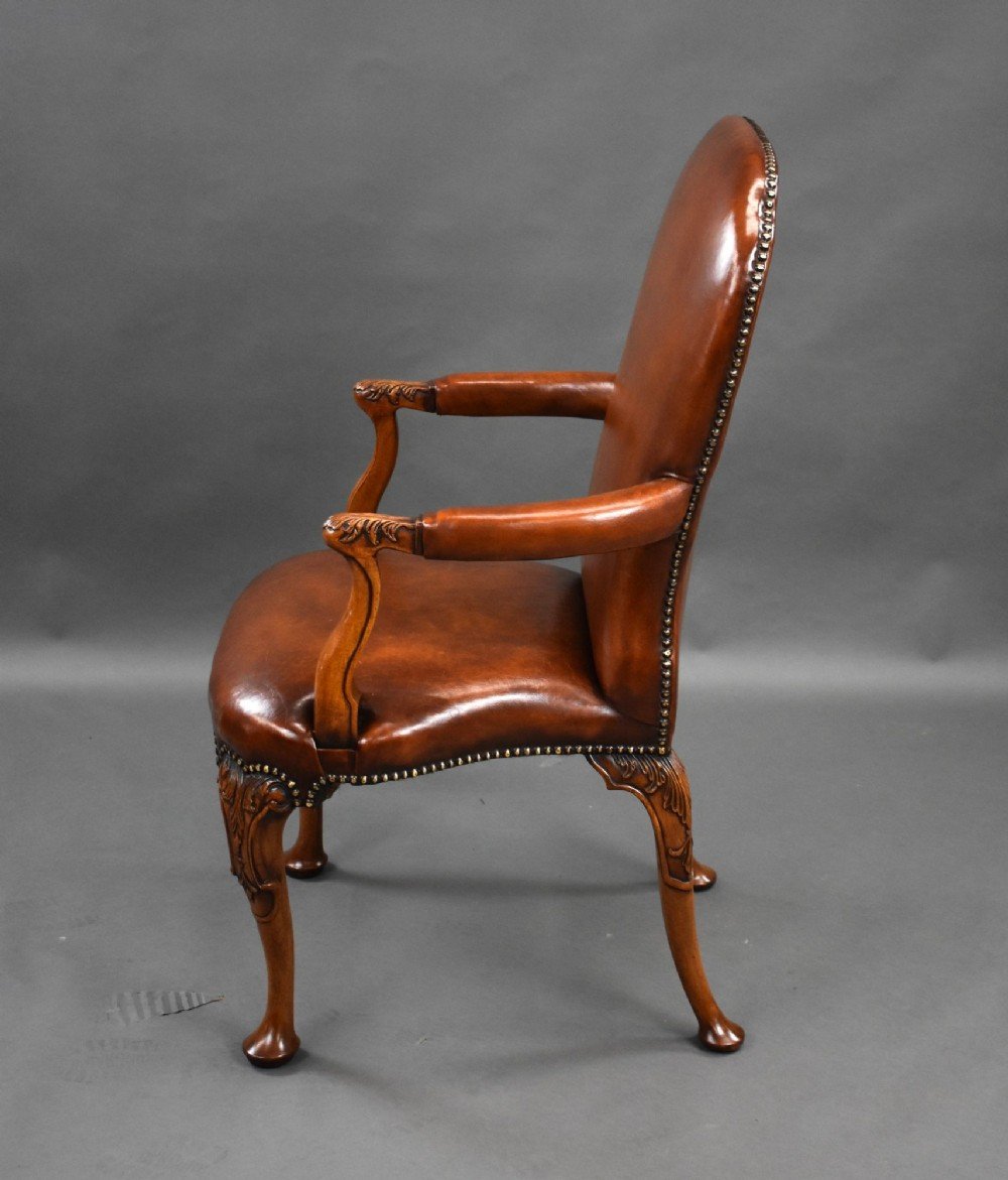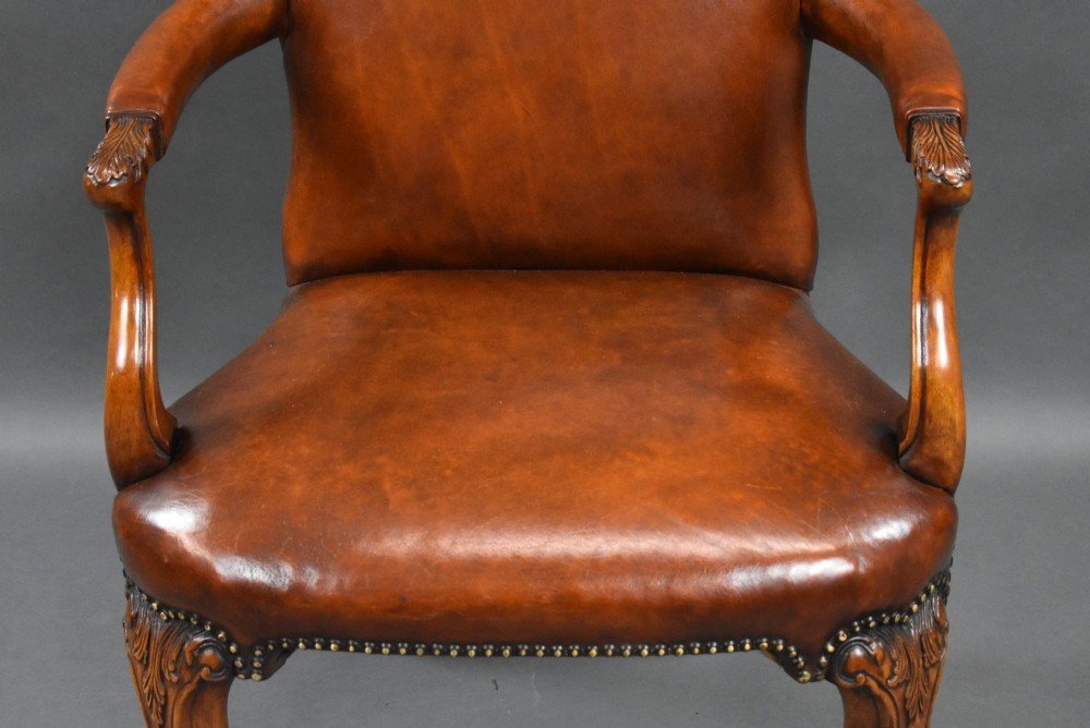 For sale is a good quality set of 7 hand dyed leather armchairs, each chair with open arms, stands on carved cabriole legs. Each chair is in excellent condition. Can be sold as pairs.