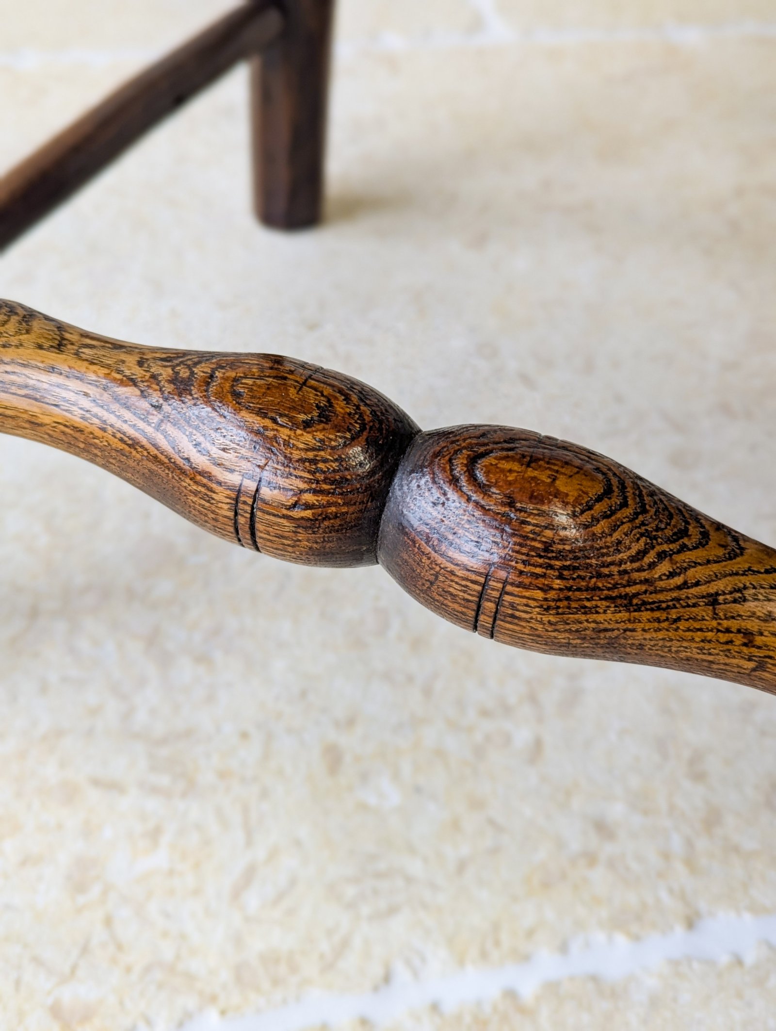 Charming, authentic examples of English country furniture from the turn of the nineteenth century, these chairs retain their honest, practical character, the later rush seats are well fitted and comfortable, while the warm colour and tactile finish make them equally at home in a farmhouse kitchen or a more refined dining setting.