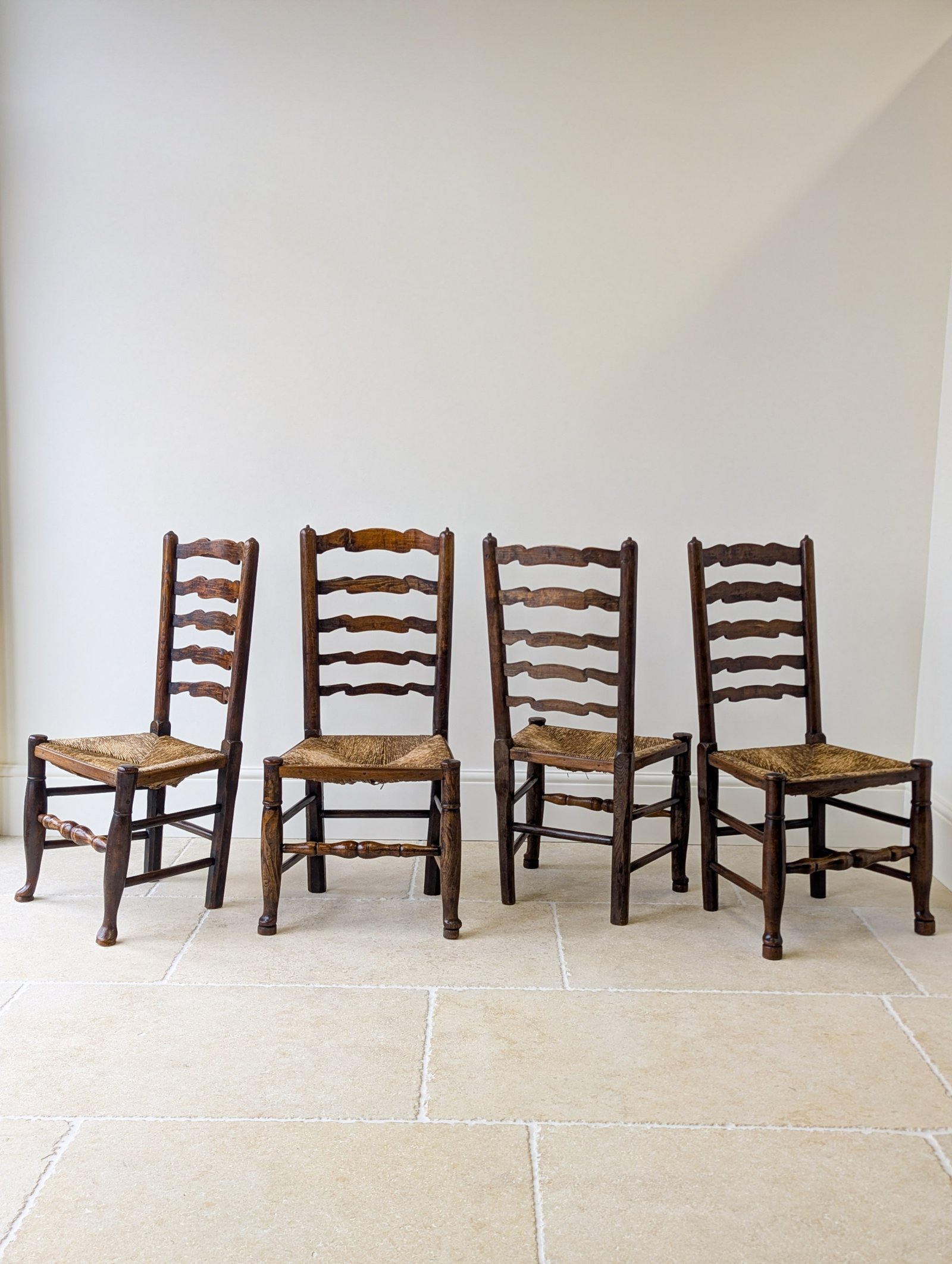 A characterful set of four late Georgian country ladderback chairs in solid oak, each with shaped back rails and hand-rushed seats, all standing on turned legs united by stretchers, the front with a characteristic waisted central turning typical of late Georgian country work. The oak has matured to a deep, even colour with the kind of surface quality only achieved through centuries of natural use.
