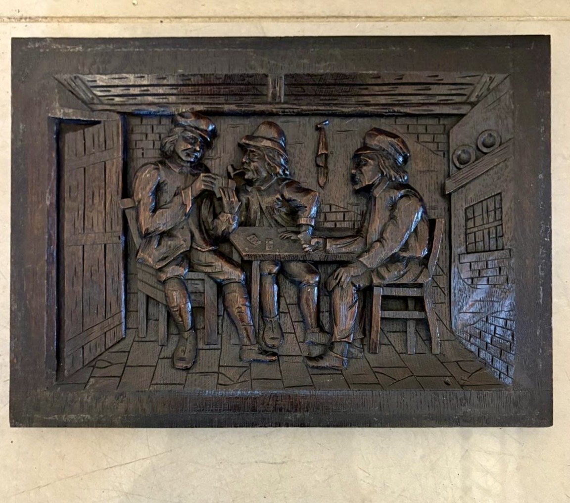 A fine and complete set of nine matching hand-carved antique oak panels dating from the late Victorian period. Each panel is beautifully worked in solid English oak, carved in deep relief with Tudor and Renaissance-inspired motifs including stylized foliage, flowerhead rondels, and geometric tracery each depicting lively 17th-century tavern and village scenes in deep relief. The panels capture rustic life with remarkable detail—featuring figures drinking, dancing, playing music, and socialising—evocative of Flemish or Dutch Golden Age genre paintings inspired by artists such as Teniers or Jan Steen.