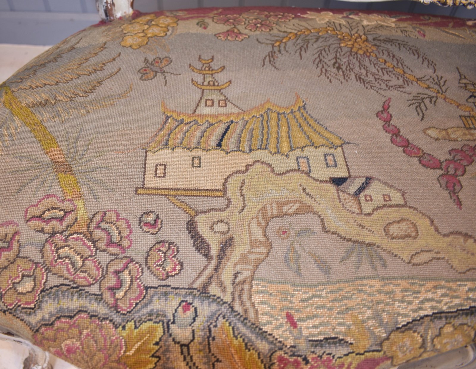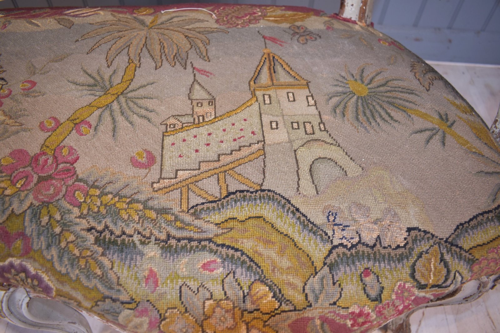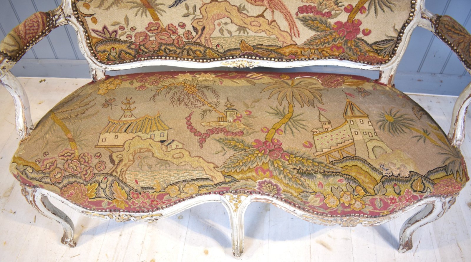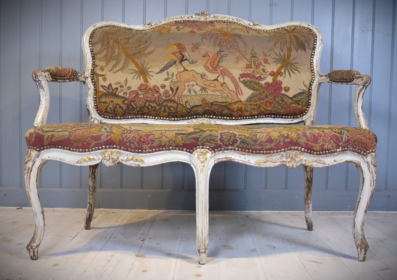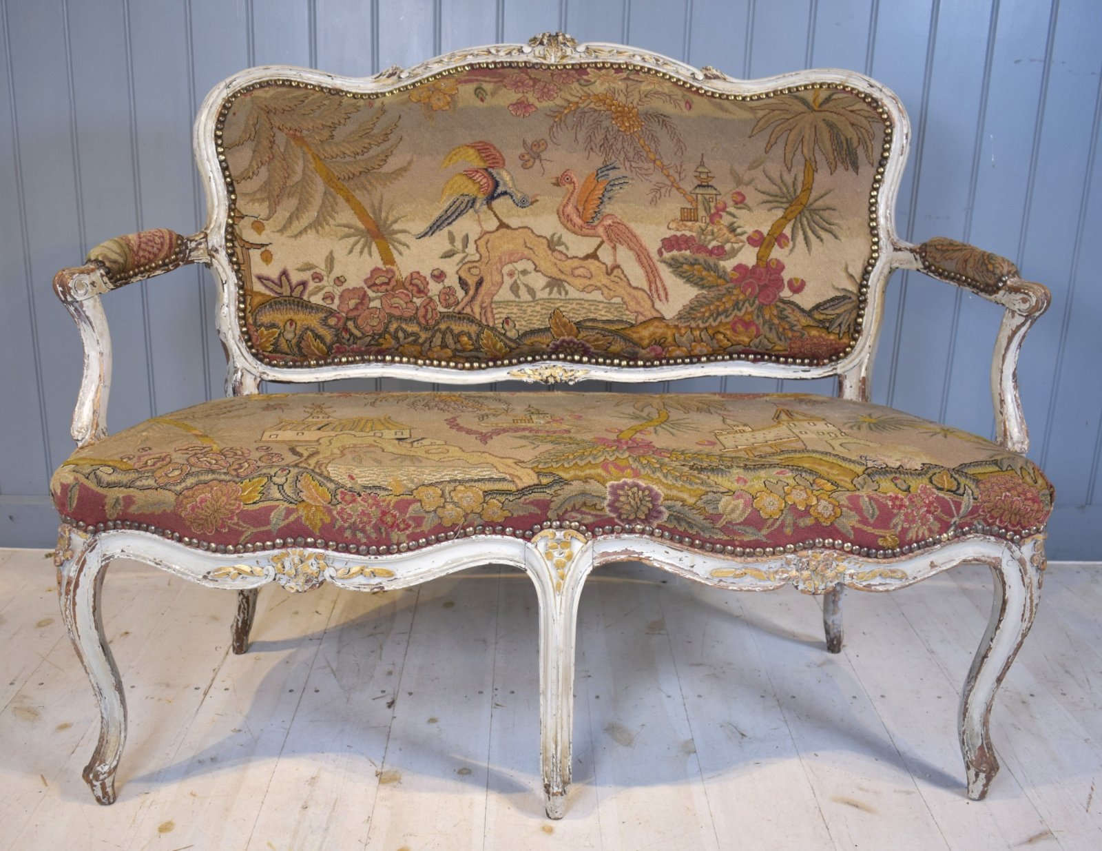 19th century french canape (settee) with original needlework . The needlework is in good condition for the age , and not really faded. The frame has its original paint and is a little distressed but this adds to the country house look of the piece. The frame is constructed throughout with wooden pegs.