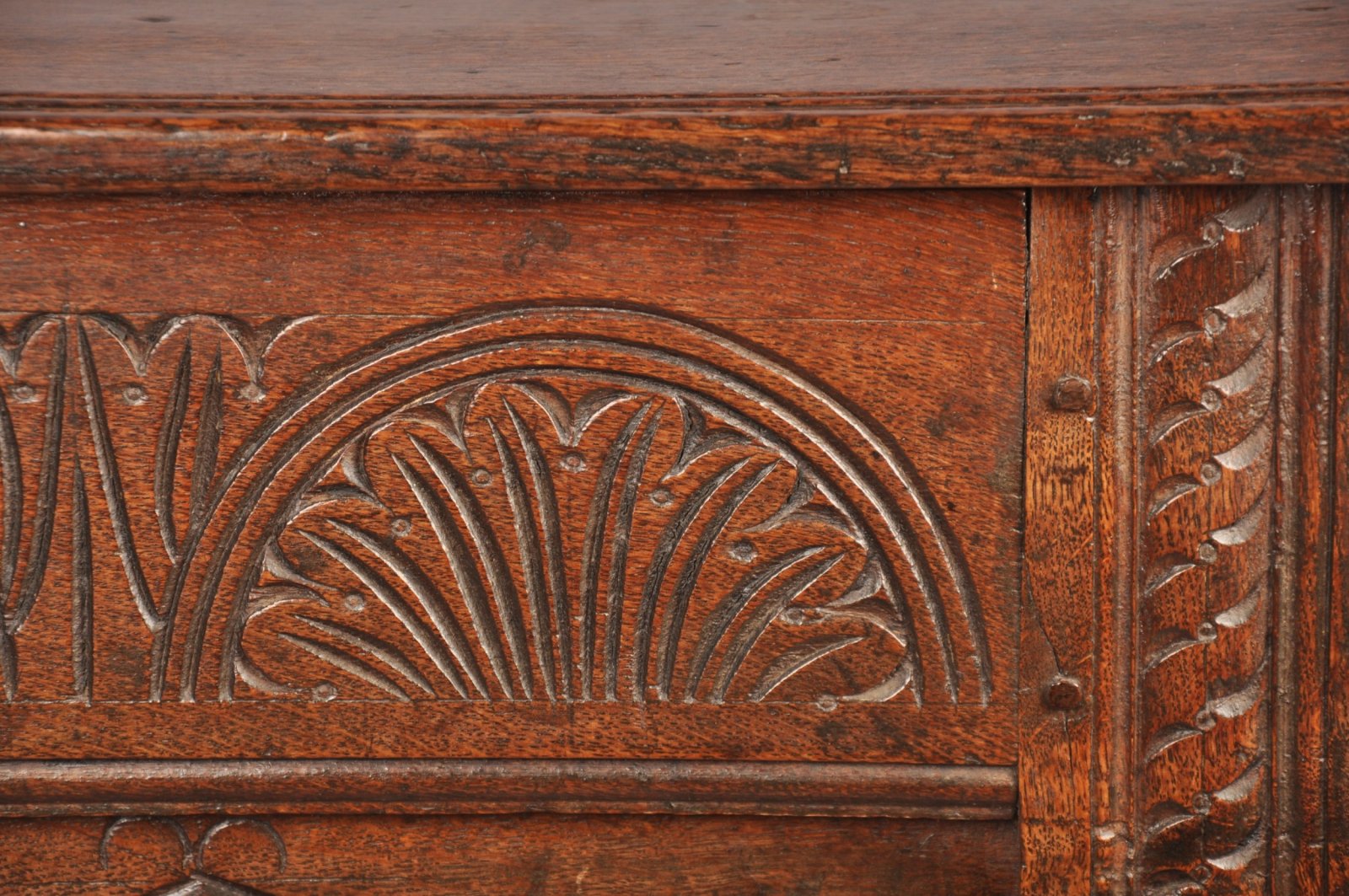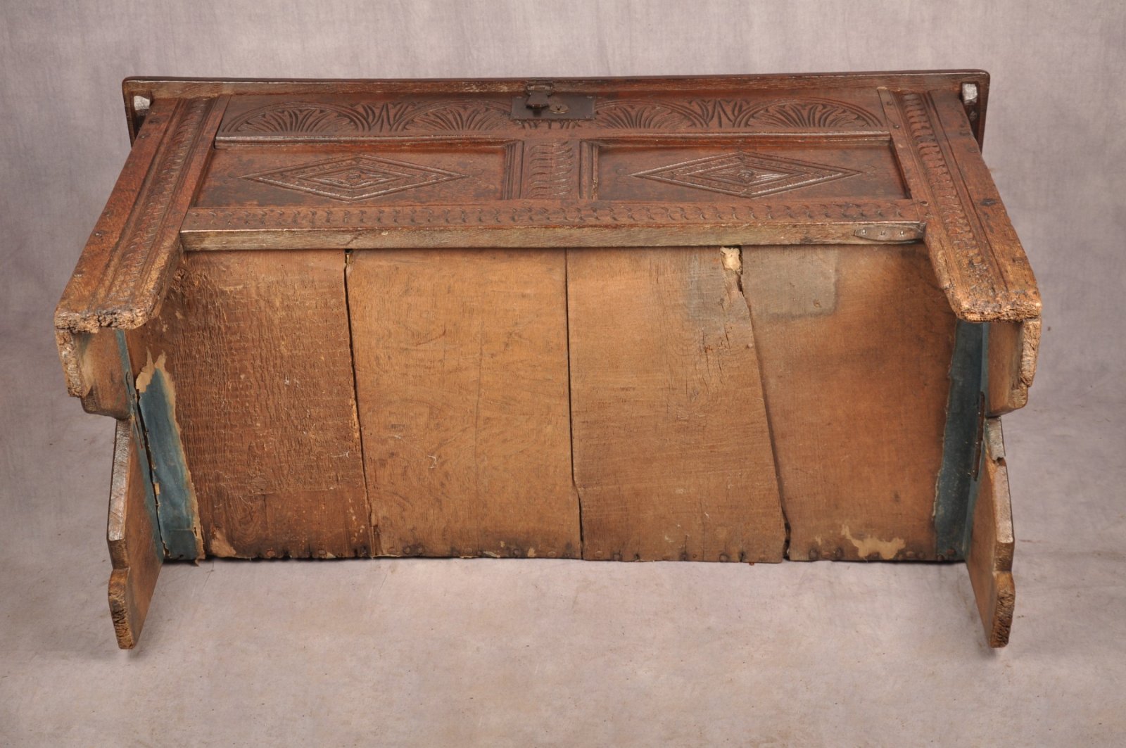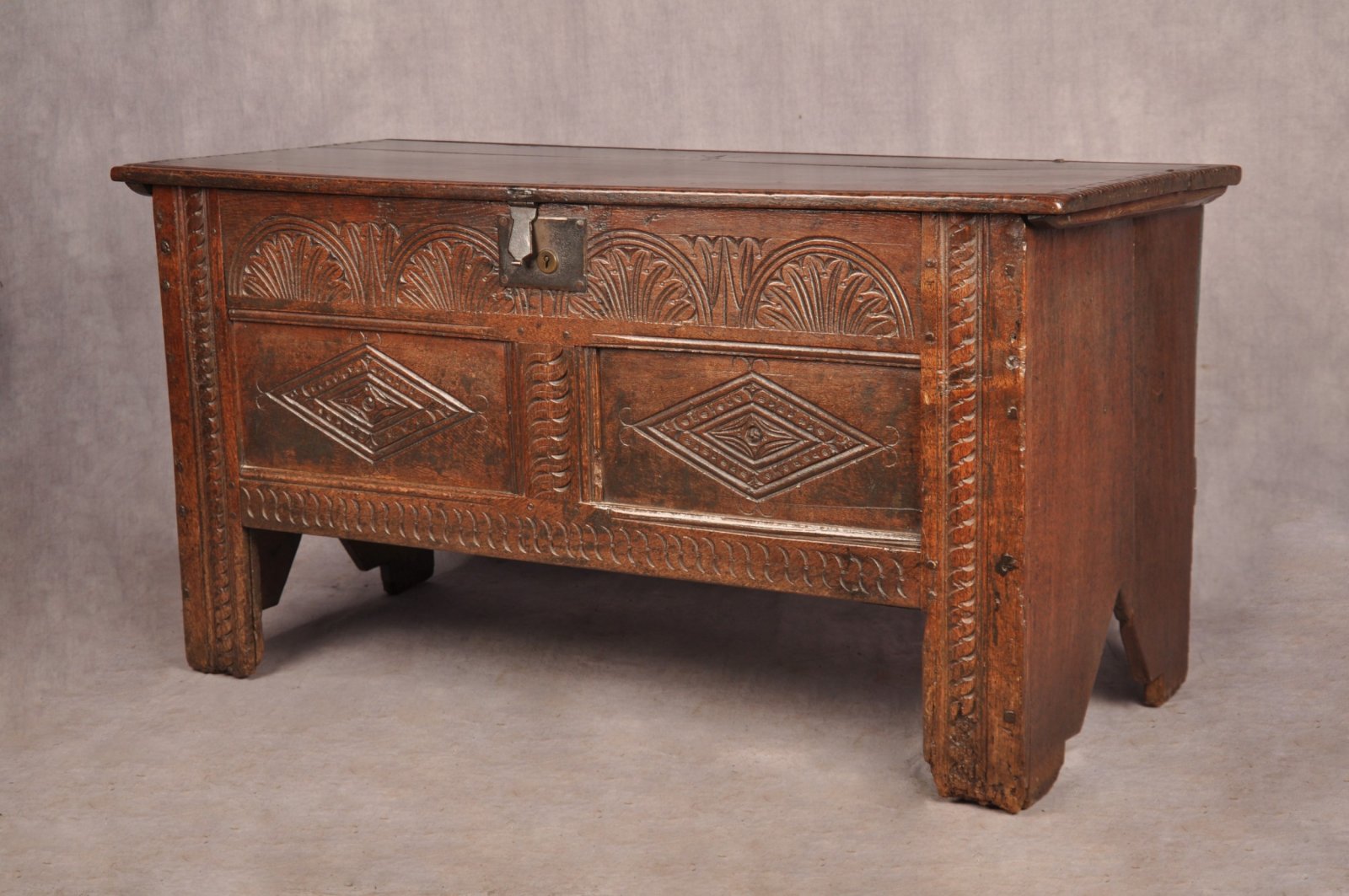 A very honest 17th Century Oak Coffer of good small proportions having wonderful glowing rich warm colour and patina. The front with nicely carved decoration featuring lunette pattern to the top rail and lozenge to the panel. The coffer has original ring hinges, candle box and all boards throughout, the plank ends with shaped feet.