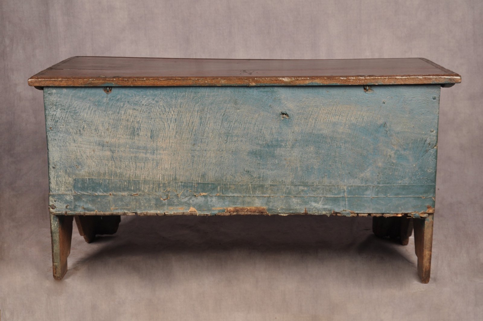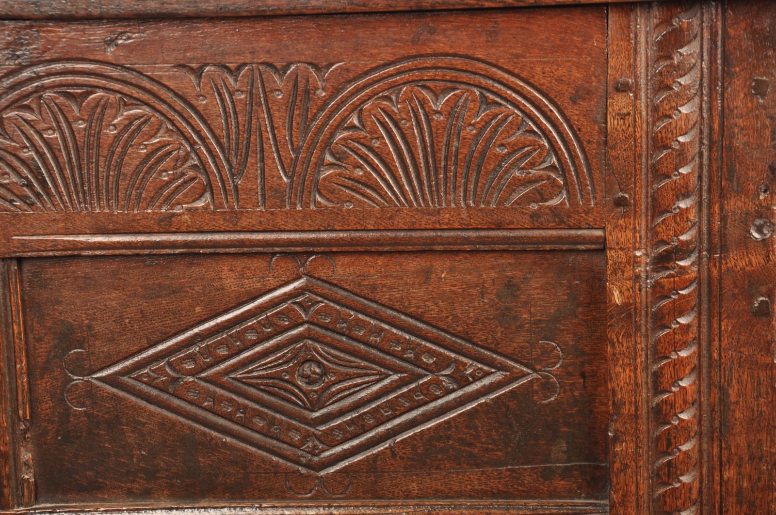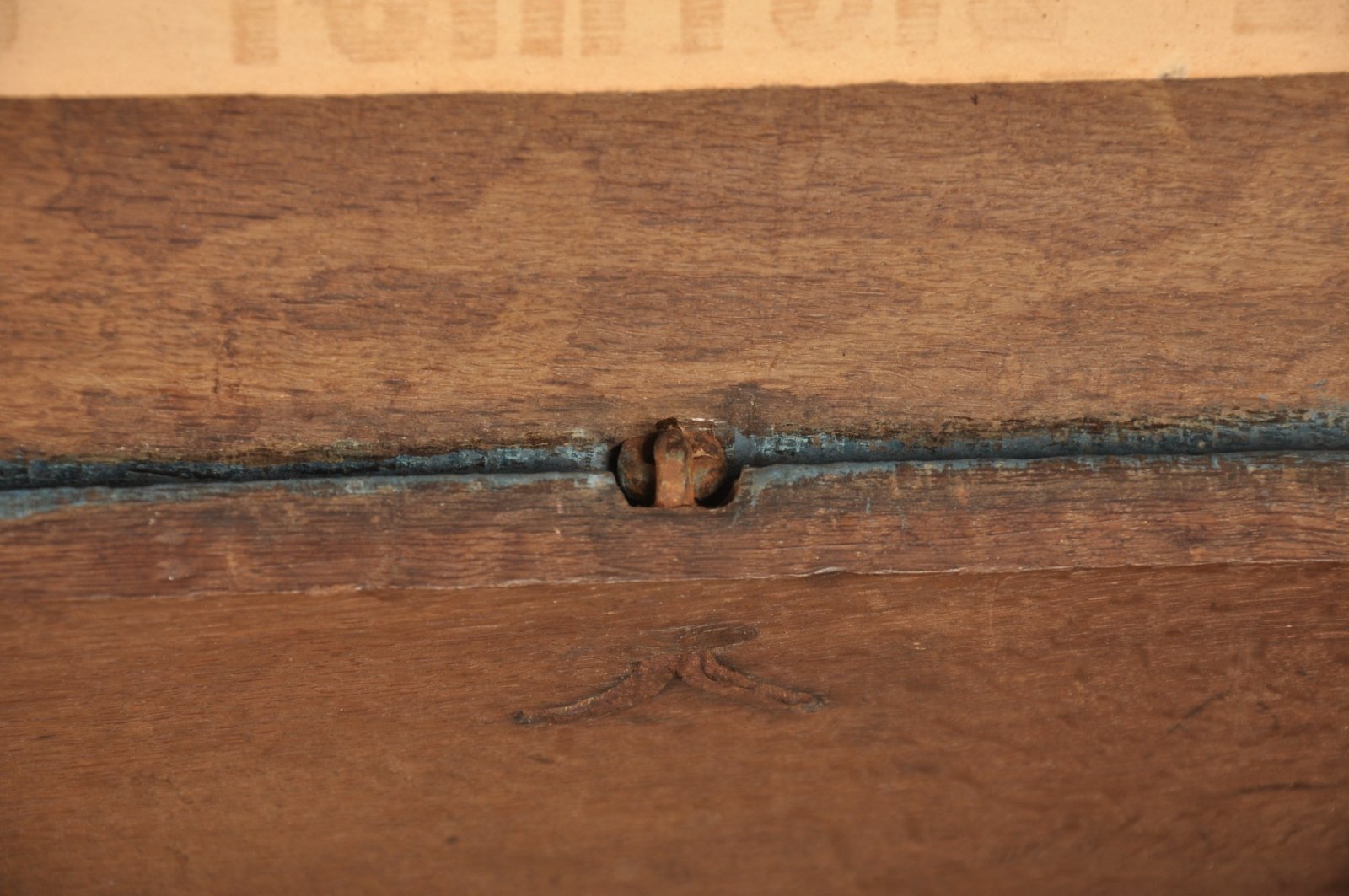 A very honest 17th Century Oak Coffer of good small proportions having wonderful glowing rich warm colour and patina. The front with nicely carved decoration featuring lunette pattern to the top rail and lozenge to the panel. The coffer has original ring hinges, candle box and all boards throughout, the plank ends with shaped feet.