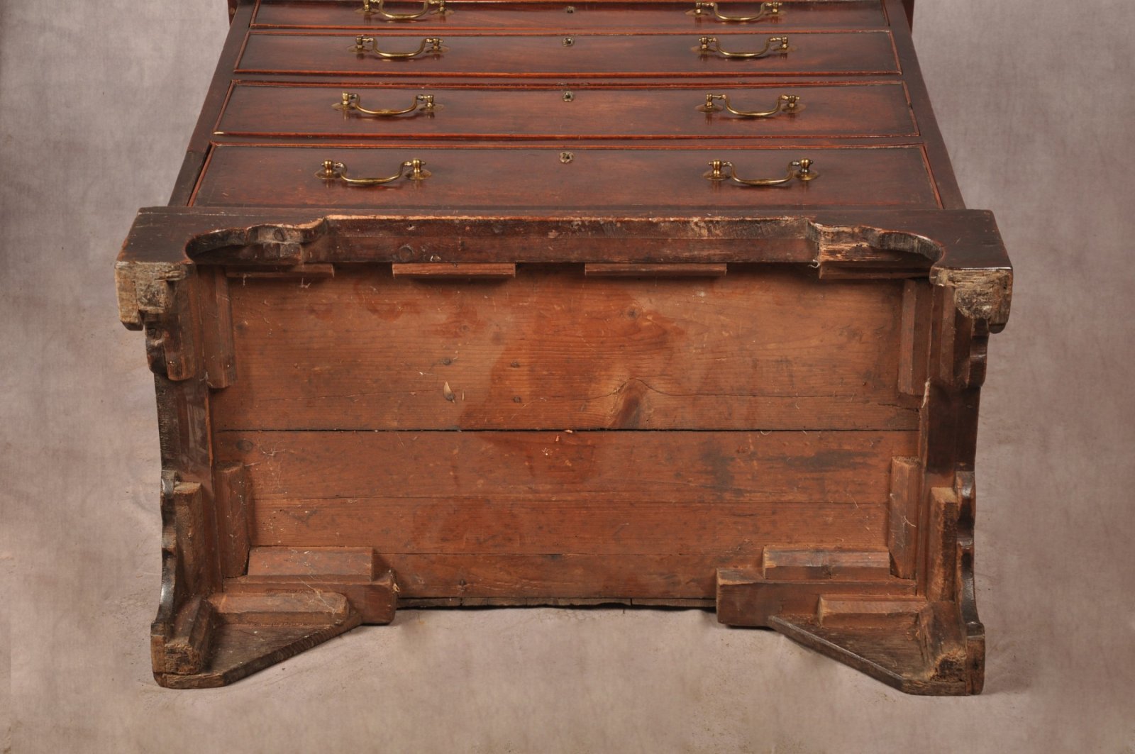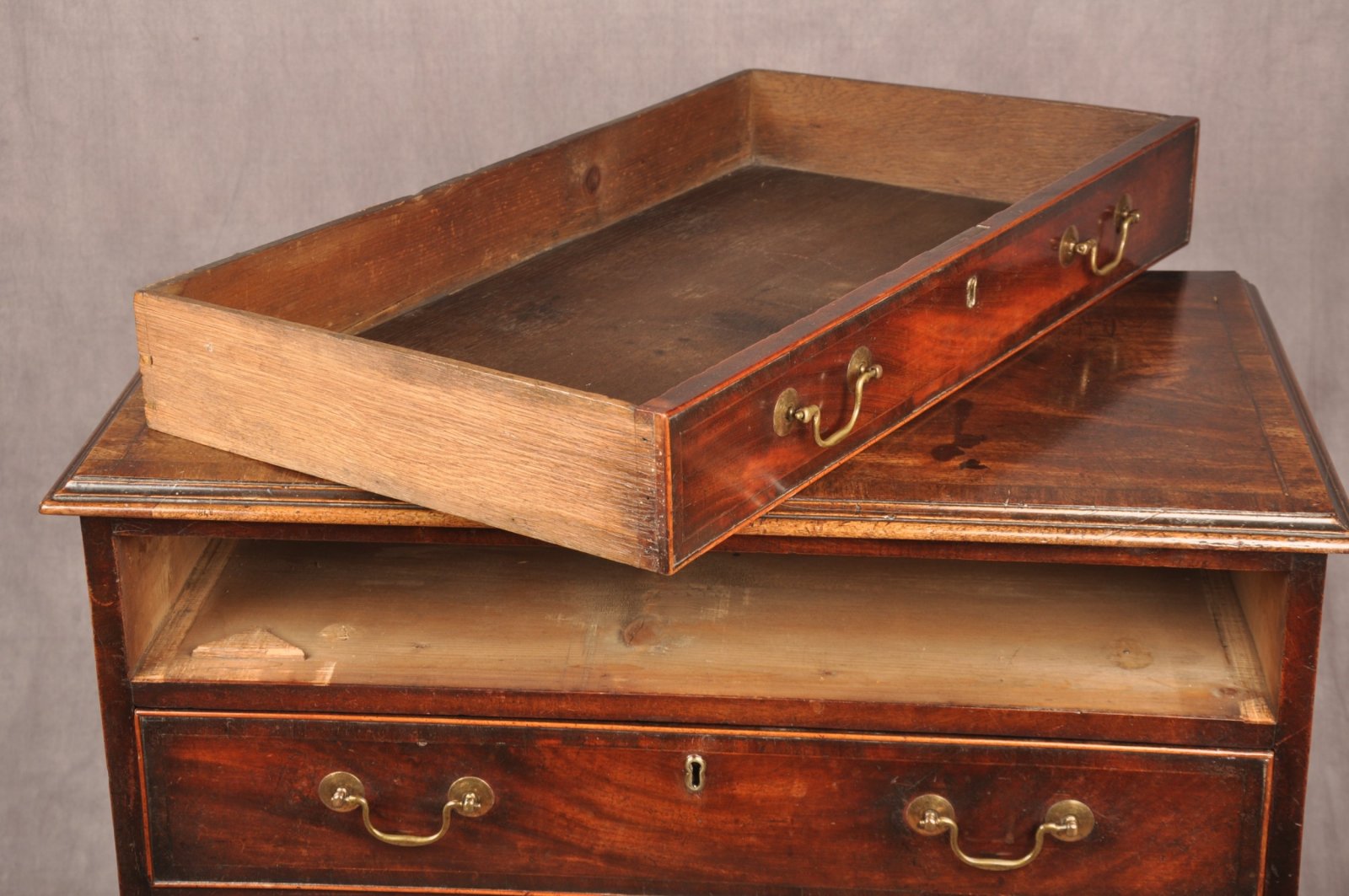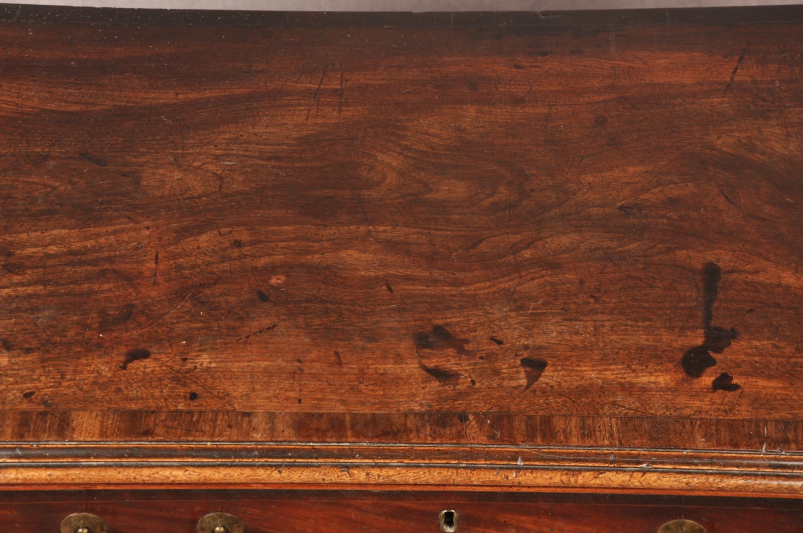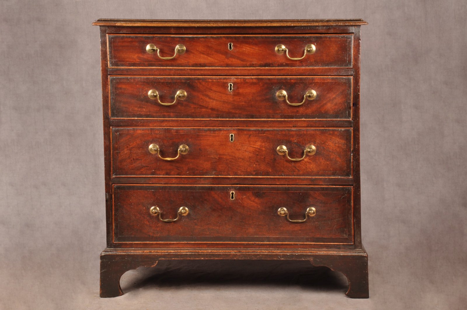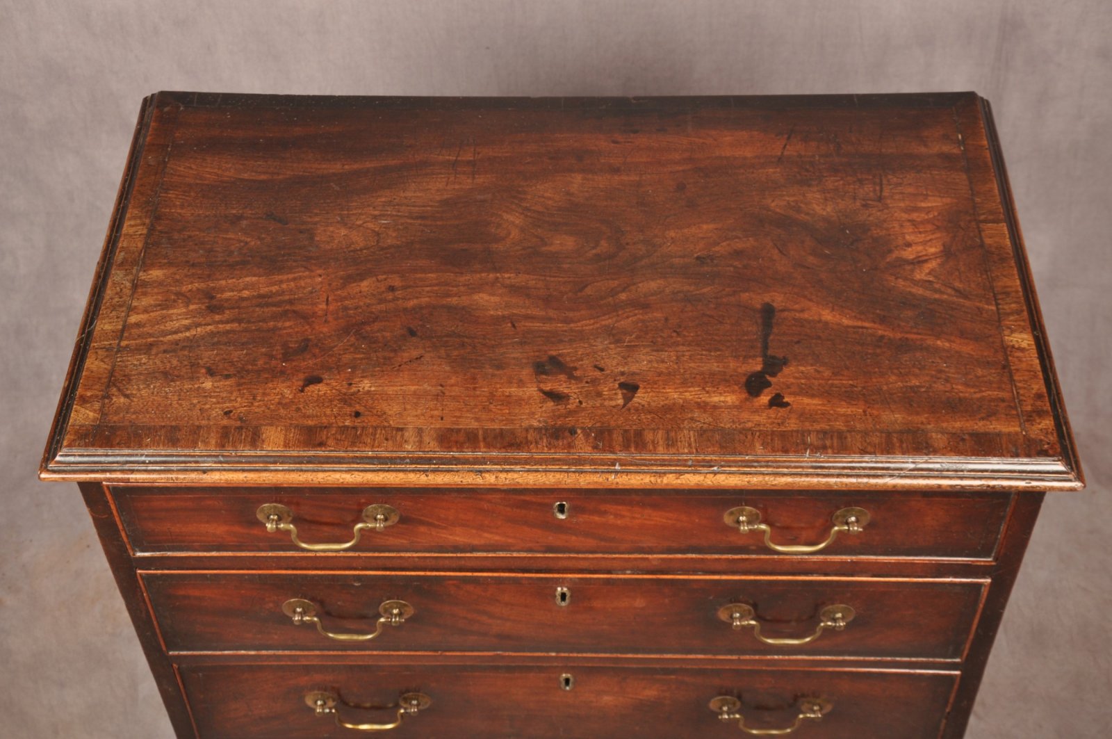 The soft glow of the uncleaned period brass handles adds further to the beauty of this piece of such pleasing small proportions. The nicely shaped curved bracket feet are completely original as remarkably is the blocking to the underneath. On the underneath of the piece are four nails, one with a scrap of paper attached, we believe this was probably an original makers label, what a shame it has now gone and there is no trace of where this lovely quality little chest was made.