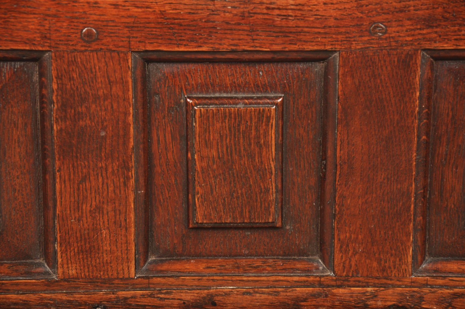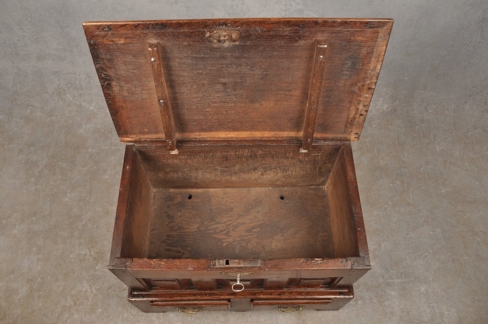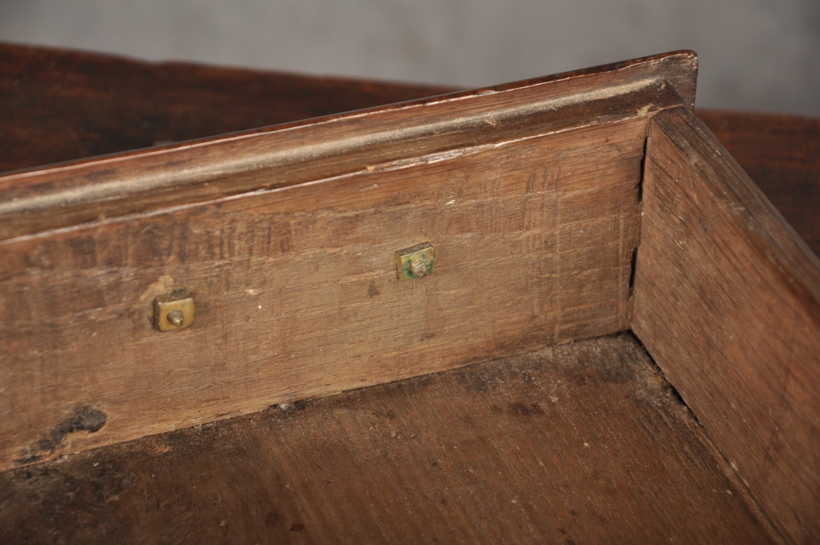 The drawers were originally locked into place with pegs from inside , the holes are still visible on the bottom of the interior and the drawer backs.