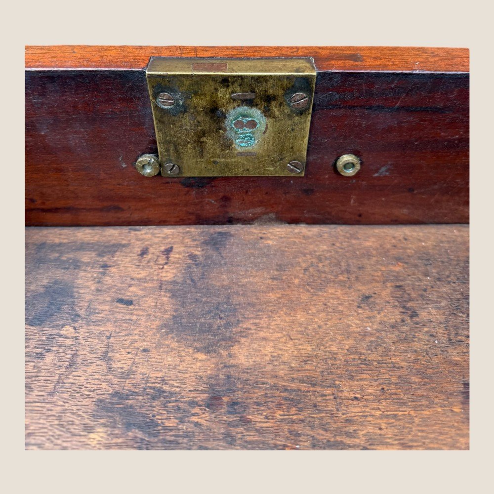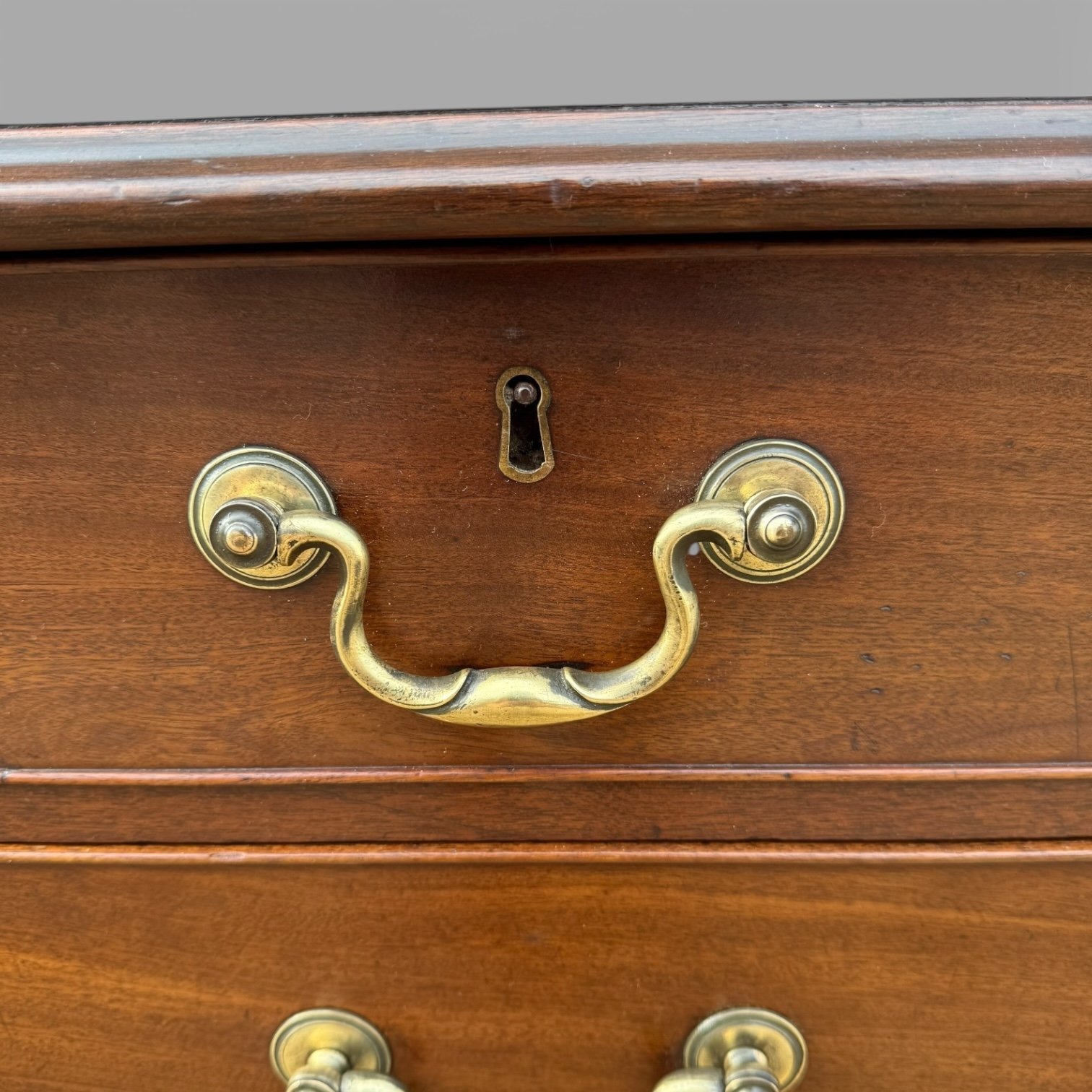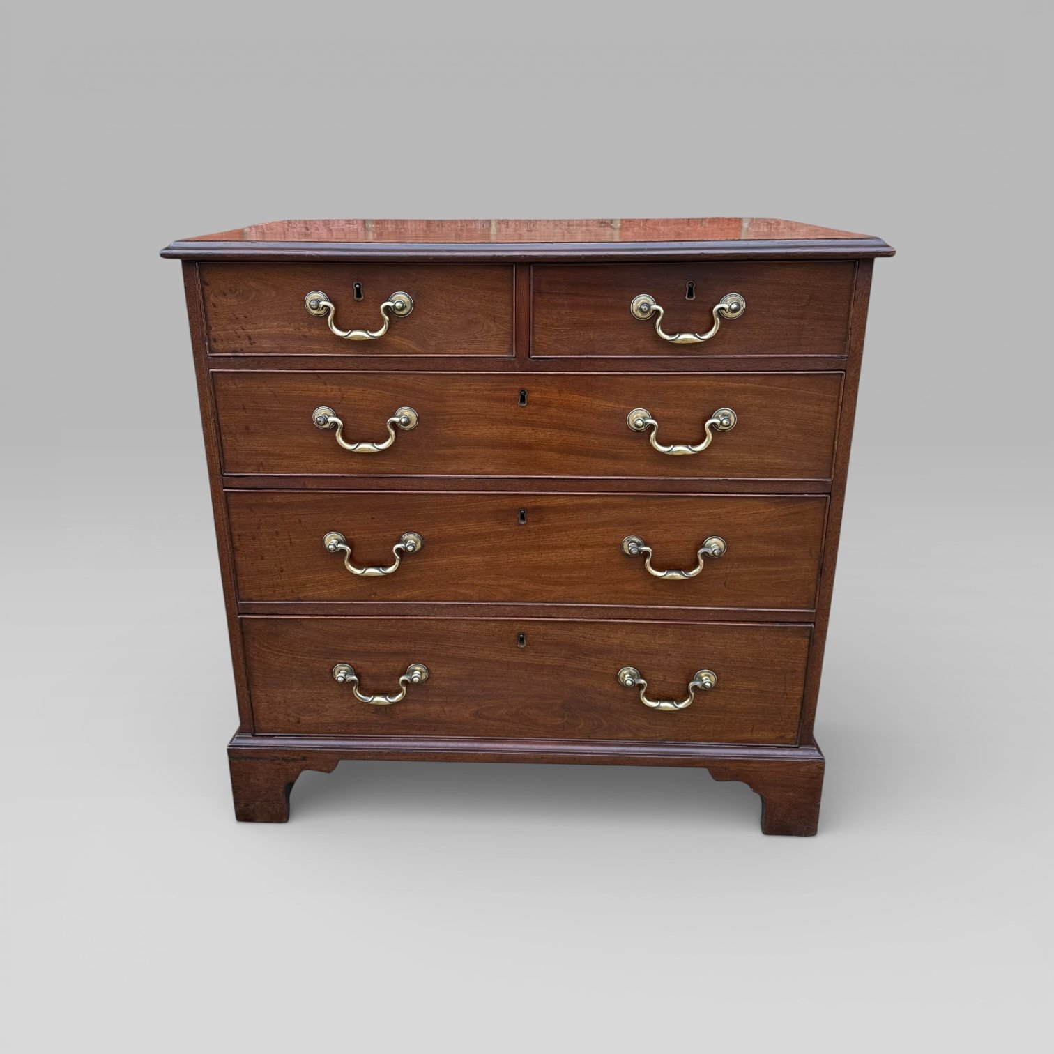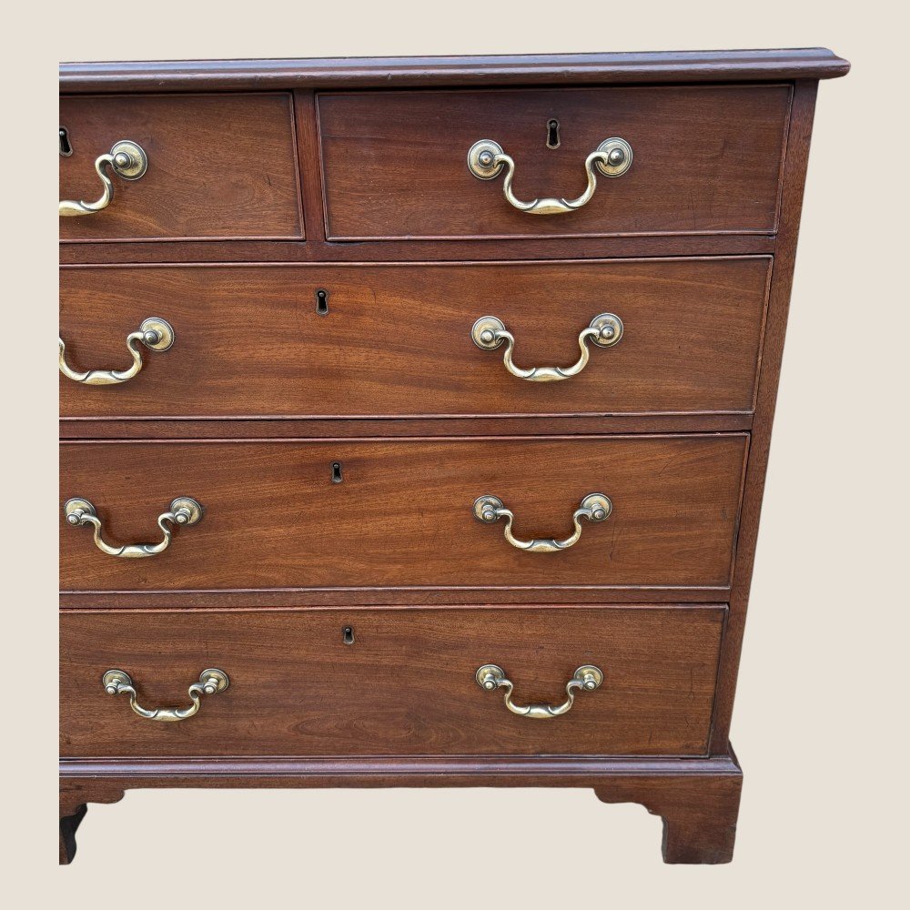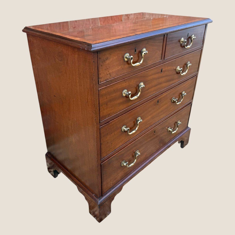 Here we have a small proportioned English antique Georgian, George III, Cuban Mahogany and Walnut Crossbanded Chest of 5 Drawers with brass swan neck handles and it stands on bracket feet. This is reddish brown colour and a great quality piece with all original brass handles and key inscriptions, it has oak lined drawers and fine dovetails on every drawer.