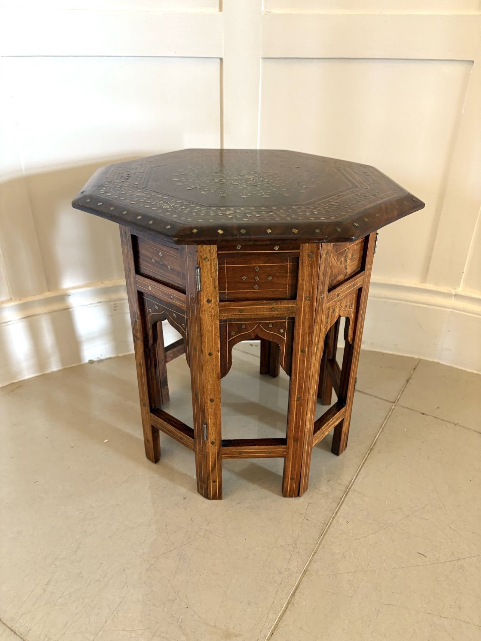 Small antique quality brass and bone inlaid Indian teak table having a quality brass and bone inlaid hexagonal shape top supported by a six section folding base with carved open panels.